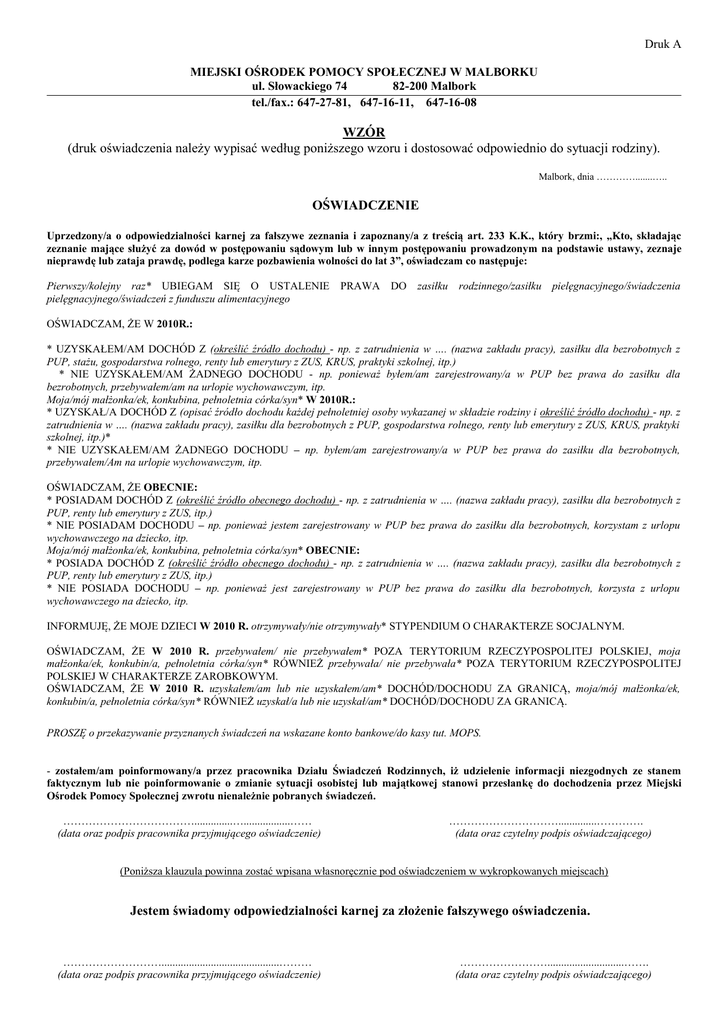 Druk A MIEJSKI OŚRODEK POMOCY SPOŁECZNEJ W MALBORKU ul. Słowackiego 74 82-200 Malbork tel./fax.: 647-27-81, 647-16-11, 647-16-08 WZÓR (druk oświadczenia należy wypisać według poniższego wzoru i dostosować odpowiednio do sytuacji rodziny). Malbork, dnia ………….......….. OŚWIADCZENIE Uprzedzony/a o odpowiedzialności karnej za fałszywe zeznania i zapoznany/a z treścią art. 233 K.K., który brzmi:, „Kto, składając zeznanie mające służyć za dowód w postępowaniu sądowym lub w innym postępowaniu prowadzonym na podstawie ustawy, zeznaje nieprawdę lub zataja prawdę, podlega karze pozbawienia wolności do lat 3”, oświadczam co następuje: Pierwszy/kolejny raz* UBIEGAM SIĘ O USTALENIE pielęgnacyjnego/świadczeń z funduszu alimentacyjnego PRAWA DO zasiłku rodzinnego/zasiłku pielęgnacyjnego/świadczenia OŚWIADCZAM, ŻE W 2010R.: * UZYSKAŁEM/AM DOCHÓD Z (określić źródło dochodu) - np. z zatrudnienia w …. (nazwa zakładu pracy), zasiłku dla bezrobotnych z PUP, stażu, gospodarstwa rolnego, renty lub emerytury z ZUS, KRUS, praktyki szkolnej, itp.) * NIE UZYSKAŁEM/AM ŻADNEGO DOCHODU - np. ponieważ byłem/am zarejestrowany/a w PUP bez prawa do zasiłku dla bezrobotnych, przebywałem/am na urlopie wychowawczym, itp. Moja/mój małżonka/ek, konkubina, pełnoletnia córka/syn* W 2010R.: * UZYSKAŁ/A DOCHÓD Z (opisać źródło dochodu każdej pełnoletniej osoby wykazanej w składzie rodziny i określić źródło dochodu) - np. z zatrudnienia w …. (nazwa zakładu pracy), zasiłku dla bezrobotnych z PUP, gospodarstwa rolnego, renty lub emerytury z ZUS, KRUS, praktyki szkolnej, itp.)* * NIE UZYSKAŁEM/AM ŻADNEGO DOCHODU – np. byłem/am zarejestrowany/a w PUP bez prawa do zasiłku dla bezrobotnych, przebywałem/Am na urlopie wychowawczym, itp. OŚWIADCZAM, ŻE OBECNIE: * POSIADAM DOCHÓD Z (określić źródło obecnego dochodu) - np. z zatrudnienia w …. (nazwa zakładu pracy), zasiłku dla bezrobotnych z PUP, renty lub emerytury z ZUS, itp.) * NIE POSIADAM DOCHODU – np. ponieważ jestem zarejestrowany w PUP bez prawa do zasiłku dla bezrobotnych, korzystam z urlopu wychowawczego na dziecko, itp. Moja/mój małżonka/ek, konkubina, pełnoletnia córka/syn* OBECNIE: * POSIADA DOCHÓD Z (określić źródło obecnego dochodu) - np. z zatrudnienia w …. (nazwa zakładu pracy), zasiłku dla bezrobotnych z PUP, renty lub emerytury z ZUS, itp.) * NIE POSIADA DOCHODU – np. ponieważ jest zarejestrowany w PUP bez prawa do zasiłku dla bezrobotnych, korzysta z urlopu wychowawczego na dziecko, itp. INFORMUJĘ, ŻE MOJE DZIECI W 2010 R. otrzymywały/nie otrzymywały* STYPENDIUM O CHARAKTERZE SOCJALNYM. OŚWIADCZAM, ŻE W 2010 R. przebywałem/ nie przebywałem* POZA TERYTORIUM RZECZYPOSPOLITEJ POLSKIEJ, moja małżonka/ek, konkubin/a, pełnoletnia córka/syn* RÓWNIEŻ przebywała/ nie przebywała* POZA TERYTORIUM RZECZYPOSPOLITEJ POLSKIEJ W CHARAKTERZE ZAROBKOWYM. OŚWIADCZAM, ŻE W 2010 R. uzyskałem/am lub nie uzyskałem/am* DOCHÓD/DOCHODU ZA GRANICĄ, moja/mój małżonka/ek, konkubin/a, pełnoletnia córka/syn* RÓWNIEŻ uzyskał/a lub nie uzyskał/am* DOCHÓD/DOCHODU ZA GRANICĄ. PROSZĘ o przekazywanie przyznanych świadczeń na wskazane konto bankowe/do kasy tut. MOPS. - zostałem/am poinformowany/a przez pracownika Działu Świadczeń Rodzinnych, iż udzielenie informacji niezgodnych ze stanem faktycznym lub nie poinformowanie o zmianie sytuacji osobistej lub majątkowej stanowi przesłankę do dochodzenia przez Miejski Ośrodek Pomocy Społecznej zwrotu nienależnie pobranych świadczeń. ………………………………..............….................…… (data oraz podpis pracownika przyjmującego oświadczenie) …………………………..............…………. (data oraz czytelny podpis oświadczającego) (Poniższa klauzula powinna zostać wpisana własnoręcznie pod oświadczeniem w wykropkowanych miejscach) Jestem świadomy odpowiedzialności karnej za złożenie fałszywego oświadczenia. ………………………...........................................……… (data oraz podpis pracownika przyjmującego oświadczenie) ……………………............................……. (data oraz czytelny podpis oświadczającego)
