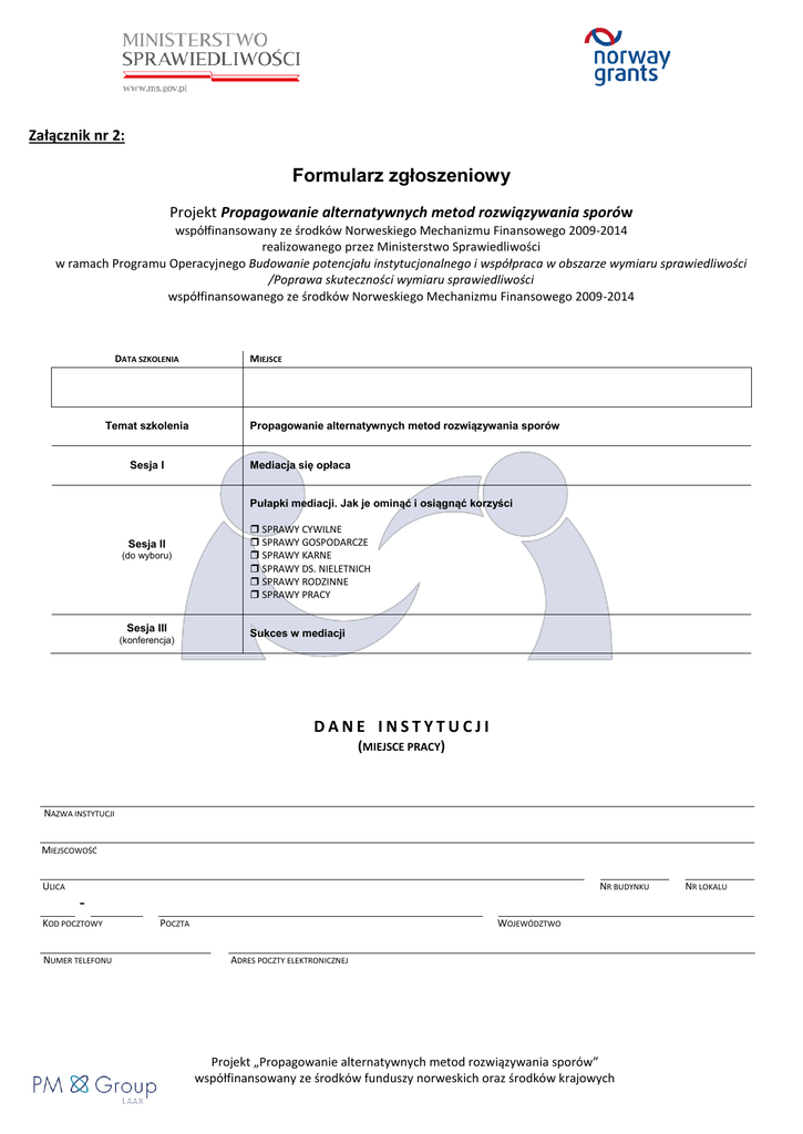Załącznik nr 2: Formularz zgłoszeniowy Projekt Propagowanie alternatywnych metod rozwiązywania sporów współfinansowany ze środków Norweskiego Mechanizmu Finansowego 2009-2014 realizowanego przez Ministerstwo Sprawiedliwości w ramach Programu Operacyjnego Budowanie potencjału instytucjonalnego i współpraca w obszarze wymiaru sprawiedliwości /Poprawa skuteczności wymiaru sprawiedliwości współfinansowanego ze środków Norweskiego Mechanizmu Finansowego 2009-2014 DATA SZKOLENIA Temat szkolenia Sesja I MIEJSCE Propagowanie alternatywnych metod rozwiązywania sporów Mediacja się opłaca Pułapki mediacji. Jak je ominąć i osiągnąć korzyści Sesja II (do wyboru) Sesja III (konferencja) SPRAWY CYWILNE SPRAWY GOSPODARCZE SPRAWY KARNE SPRAWY DS. NIELETNICH SPRAWY RODZINNE SPRAWY PRACY Sukces w mediacji DANE INSTYTUCJI (MIEJSCE PRACY) NAZWA INSTYTUCJI MIEJSCOWOŚĆ ULICA NR BUDYNKU KOD POCZTOWY NUMER TELEFONU POCZTA WOJEWÓDZTWO ADRES POCZTY ELEKTRONICZNEJ Projekt „Propagowanie alternatywnych metod rozwiązywania sporów” współfinansowany ze środków funduszy norweskich oraz środków krajowych NR LOKALU DANE UCZESTNIKA IMIĘ I NAZWISKO DATA URODZENIA ADRES ZAMIESZKANIA LUB POBYTU (MIEJSCOWOŚĆ) ULICA NR BUDYNKU NR LOKALU KOD POCZTOWY POCZTA WOJEWÓDZTWO NUMER TELEFONU ADRES POCZTY ELEKTRONICZNEJ WYKONYWANY ZAWÓD: SĘDZIA PROKURATOR MEDIATOR FUNKCJONARIUSZ POLICJI Wyrażam zgodę na przetwarzanie moich danych osobowych dla potrzeb niezbędnych do realizacji umowy w ramach projektu „Propagowanie alternatywnych metod rozwiązywania sporów” zgodnie z ustawą z dnia 29 sierpnia 1997 r. o ochronie danych osobowych (tekst jednolity: Dz. U. z 2014 r., poz. 1182 z późn. zm.) oraz z rozporządzeniem Ministra Spraw Wewnętrznych i Administracji z dnia 29 kwietnia 2004 r. w sprawie dokumentacji przetwarzania danych osobowych oraz warunków technicznych i organizacyjnych, jakim powinny odpowiadać urządzenia i systemy informatyczne służące do przetwarzania danych osobowych (Dz. U. Nr 100, poz. 1024) Zebrane dane będą przetwarzane przez PM GROUP LAAX Spółka z ograniczoną odpowiedzialnością spółka komandytowa w Białymstoku, ul. Legionowa 28, lok. 101 (KRS Nr 0000463870, REGON: 200123021, NIP: 5423015891) oraz Ministerstwo Sprawiedliwości, Aleje Ujazdowskie 11, Warszawa w celu zorganizowania i przeprowadzenia szkoleń dla minimum 840 osób w ramach projektu „Propagowanie alternatywnych metod rozwiązywania sporów”, w szczególności rekrutacji, przygotowania dokumentacji ze szkoleń oraz zaświadczeń. …………………………………………………. data i podpis uczestnika Projekt „Propagowanie alternatywnych metod rozwiązywania sporów” współfinansowany ze środków funduszy norweskich oraz środków krajowych