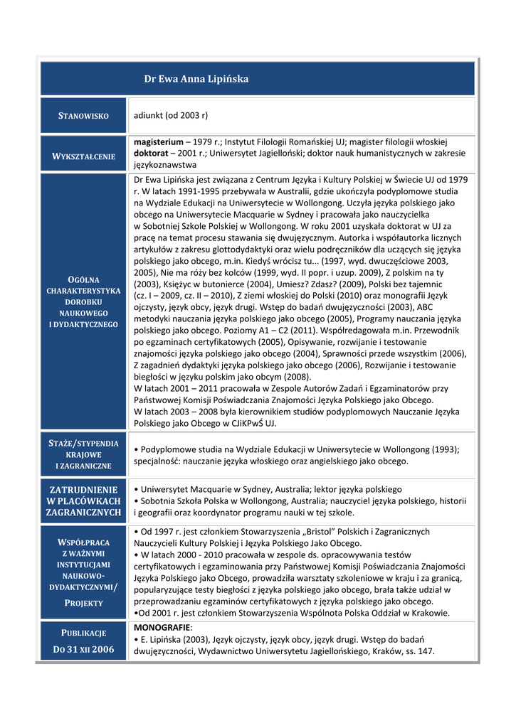 Dr Ewa Anna Lipińska STANOWISKO adiunkt (od 2003 r) WYKSZTAŁCENIE magisterium – 1979 r.; Instytut Filologii Romańskiej UJ; magister filologii włoskiej doktorat – 2001 r.; Uniwersytet Jagielloński; doktor nauk humanistycznych w zakresie językoznawstwa OGÓLNA CHARAKTERYSTYKA DOROBKU NAUKOWEGO I DYDAKTYCZNEGO Dr Ewa Lipińska jest związana z Centrum Języka i Kultury Polskiej w Świecie UJ od 1979 r. W latach 1991-1995 przebywała w Australii, gdzie ukończyła podyplomowe studia na Wydziale Edukacji na Uniwersytecie w Wollongong. Uczyła języka polskiego jako obcego na Uniwersytecie Macquarie w Sydney i pracowała jako nauczycielka w Sobotniej Szkole Polskiej w Wollongong. W roku 2001 uzyskała doktorat w UJ za pracę na temat procesu stawania się dwujęzycznym. Autorka i współautorka licznych artykułów z zakresu glottodydaktyki oraz wielu podręczników dla uczących się języka polskiego jako obcego, m.in. Kiedyś wrócisz tu... (1997, wyd. dwuczęściowe 2003, 2005), Nie ma róży bez kolców (1999, wyd. II popr. i uzup. 2009), Z polskim na ty (2003), Księżyc w butonierce (2004), Umiesz? Zdasz? (2009), Polski bez tajemnic (cz. I – 2009, cz. II – 2010), Z ziemi włoskiej do Polski (2010) oraz monografii Język ojczysty, język obcy, język drugi. Wstęp do badań dwujęzyczności (2003), ABC metodyki nauczania języka polskiego jako obcego (2005), Programy nauczania języka polskiego jako obcego. Poziomy A1 – C2 (2011). Współredagowała m.in. Przewodnik po egzaminach certyfikatowych (2005), Opisywanie, rozwijanie i testowanie znajomości języka polskiego jako obcego (2004), Sprawności przede wszystkim (2006), Z zagadnień dydaktyki języka polskiego jako obcego (2006), Rozwijanie i testowanie biegłości w języku polskim jako obcym (2008). W latach 2001 – 2011 pracowała w Zespole Autorów Zadań i Egzaminatorów przy Państwowej Komisji Poświadczania Znajomości Języka Polskiego jako Obcego. W latach 2003 – 2008 była kierownikiem studiów podyplomowych Nauczanie Języka Polskiego jako Obcego w CJiKPwŚ UJ. STAŻE/STYPENDIA KRAJOWE I ZAGRANICZNE ZATRUDNIENIE W PLACÓWKACH ZAGRANICZNYCH WSPÓŁPRACA Z WAŻNYMI INSTYTUCJAMI NAUKOWODYDAKTYCZNYMI/ PROJEKTY PUBLIKACJE DO 31 XII 2006 • Podyplomowe studia na Wydziale Edukacji w Uniwersytecie w Wollongong (1993); specjalność: nauczanie języka włoskiego oraz angielskiego jako obcego. • Uniwersytet Macquarie w Sydney, Australia; lektor języka polskiego • Sobotnia Szkoła Polska w Wollongong, Australia; nauczyciel języka polskiego, historii i geografii oraz koordynator programu nauki w tej szkole. • Od 1997 r. jest członkiem Stowarzyszenia „Bristol” Polskich i Zagranicznych Nauczycieli Kultury Polskiej i Języka Polskiego Jako Obcego. • W latach 2000 - 2010 pracowała w zespole ds. opracowywania testów certyfikatowych i egzaminowania przy Państwowej Komisji Poświadczania Znajomości Języka Polskiego jako Obcego, prowadziła warsztaty szkoleniowe w kraju i za granicą, popularyzujące testy biegłości z języka polskiego jako obcego, brała także udział w przeprowadzaniu egzaminów certyfikatowych z języka polskiego jako obcego. •Od 2001 r. jest członkiem Stowarzyszenia Wspólnota Polska Oddział w Krakowie. MONOGRAFIE: • E. Lipińska (2003), Język ojczysty, język obcy, język drugi. Wstęp do badań dwujęzyczności, Wydawnictwo Uniwersytetu Jagiellońskiego, Kraków, ss. 147. • A. Seretny, E. Lipińska (2005), ABC metodyki nauczania języka polskiego jako obcego, Universitas, Kraków, ss. 329. PODRĘCZNIKI: • U. Awdiejew, E. G. Dąmbska. E. Lipińska (1986, 1992), Jak to napisać? Ćwiczenia redakcyjno-stylistyczne dla studentów polonijnych, Wyd. Uniwersytetu Jagiellońskiego, Kraków, ss. 261. • E. Lipińska, E. G. Dąmbska (1997, 2000, 2001), Kiedyś wrócisz tu... Podręcznik do nauki języka polskiego dla obcokrajowców na poziomie średnio zaawansowanym, Uniwersitas, Kraków, ss. 350. • E. Lipińska (1999), Nie ma róży bez kolców. Ćwiczenia ortograficzne dla cudzoziemców, Universitas, Kraków, ss. 117. • E. Lipińska (2003), Z polskim na ty. Podręcznik do nauki języka polskiego dla stopnia progowego, Universitas, Kraków, ss. 293. • E. Lipińska, E.G. Dąmbska (2003), Kiedyś wrócisz tu... Cz. I. Podręcznik do nauki języka polskiego dla średnio zaawansowanych, Universitas, Kraków, ss. 279. • E. Lipińska (2004), Księżyc w butonierce. Ćwiczenie doskonalące sprawność rozumienia ze słuchu na podstawie tekstów Andrzeja Sikorowskiego, Universitas, Kraków, ss. 75. • E. Lipińska, E.G. Dąmbska (2005), Kiedyś wrócisz tu… cz. II: By szukać swoich dróg i gwiazd. Podręcznik do nauki języka polskiego dla zaawansowanych, Universitas, Kraków, ss. 290. REDAKCJA PRAC ZBIOROWYCH: • Vademecum egzaminatora (do użytku wewnętrznego) (wspólnie z A. Seretny), Państwowa Komisja Poświadczania Znajomości Języka Polskiego jako Obcego, MENiS, Warszawa, 2004, ss. 47. • Opisywanie, rozwijanie i testowanie znajomości języka polskiego jako obcego, Materiały z Międzynarodowej Konferencji sekcji Glottodydaktycznej Stowarzyszenia „Bristol”, Universitas, Kraków, 2004, ss. 164 (wspólnie z A. Seretny i W. Martyniukiem). • Przewodnik po egzaminach certyfikatowych, Universitas, Kraków, 2005, ss. 92 (wspólnie z A. Seretny). • Z zagadnień dydaktyki języka polskiego jako obcego, praca zbiorowa pod red. E. Lipińskiej i A. Seretny, Universitas, Kraków 2006, ss. 337. • Sprawności przede wszystkim, Materiały z II Konferencji Sekcji Glottodydaktycznej Stowarzyszenia „Bristol”, Universitas, Kraków 2006, ss. 208 (wspólnie z A. Seretny). NAJWAŻNIEJSZE ARTYKUŁY: • Niemodne dyktanda, Języki Obce w Szkole, nr 5, 1996, s. 406-415. • Nauczanie pisania - warsztaty [w:] Inne optyki. Nowe programy, nowe metody, nowe technologie w nauczaniu kultury polskiej i języka polskiego jako obcego, pod red. R. Cudaka i J. Tambor. Prace Naukow