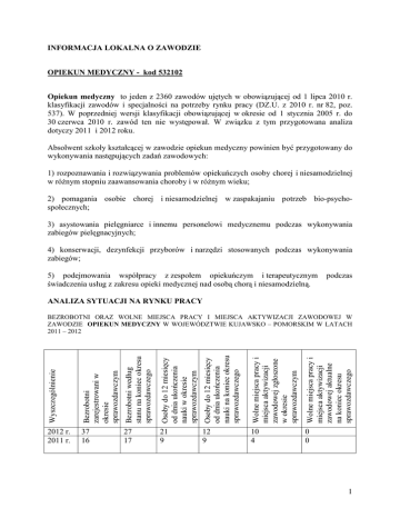 INFORMACJA LOKALNA O ZAWODZIE OPIEKUN MEDYCZNY - kod 532102 Opiekun medyczny to jeden z 2360 zawodów ujętych w obowiązującej od 1 lipca 2010 r. klasyfikacji zawodów i specjalności na potrzeby rynku pracy (DZ.U. z 2010 r. nr 82, poz. 537). W poprzedniej wersji klasyfikacji obowiązującej w okresie od 1 stycznia 2005 r. do 30 czerwca 2010 r. zawód ten nie występował. W związku z tym przygotowana analiza dotyczy 2011 i 2012 roku. Absolwent szkoły kształcącej w zawodzie opiekun medyczny powinien być przygotowany do wykonywania następujących zadań zawodowych: 1) rozpoznawania i rozwiązywania problemów opiekuńczych osoby chorej i niesamodzielnej w różnym stopniu zaawansowania choroby i w różnym wieku; 2) pomagania osobie chorej i niesamodzielnej w zaspakajaniu potrzeb bio-psychospołecznych; 3) asystowania pielęgniarce i innemu personelowi medycznemu podczas wykonywania zabiegów pielęgnacyjnych; 4) konserwacji, dezynfekcji przyborów i narzędzi stosowanych podczas wykonywania zabiegów; 5) podejmowania współpracy z zespołem opiekuńczym i terapeutycznym świadczenia usług z zakresu opieki medycznej nad osobą chorą i niesamodzielną. podczas ANALIZA SYTUACJI NA RYNKU PRACY Wyszczególnienie Bezrobotni zarejestrowani w okresie sprawozdawczym Bezrobotni według stanu na koniec okresu sprawozdawczego Osoby do 12 miesięcy od dnia ukończenia nauki w okresie sprawozdawczym Osoby do 12 miesięcy od dnia ukończenia nauki na koniec okresu sprawozdawczego Wolne miejsca pracy i miejsca aktywizacji zawodowej zgłoszone w okresie sprawozdawczym Wolne miejsca pracy i miejsca aktywizacji zawodowej aktualne na koniec okresu sprawozdawczego BEZROBOTNI ORAZ WOLNE MIEJSCA PRACY I MIEJSCA AKTYWIZACJI ZAWODOWEJ W ZAWODZIE OPIEKUN MEDYCZNY W WOJEWÓDZTWIE KUJAWSKO – POMORSKIM W LATACH 2011 – 2012 2012 r. 2011 r. 37 16 27 17 21 9 12 9 10 4 0 0 1 W analizowanym okresie zawód ten został sklasyfikowany jako zawód nadwyżkowy 1 tzn. taki, na który na rynku pracy istnieje mniejsze zapotrzebowanie niż liczba osób poszukujących pracy w tym zawodzie. Dla osób z zawodem opiekun medyczny w 2012r. zgłoszono 10 wolnych miejsc pracy lub aktywizacji zawodowej . Na jedną ofertę pracy przypadało 3,7 osób bezrobotnych zarejestrowanych w okresie. W 2011 r. zgłoszono 4 wolne miejsca pracy lub aktywizacji zawodowej. Na jedną ofertę pracy przypadało 4 potencjalnych kandydatów do pracy zarejestrowanych w okresie. WYNIKI BADAŃ PRACODAWCÓW2 W 2012 roku w pracodawcy planowali zatrudnienie 3 osób w zawodzie opiekun medyczny w powiecie Wąbrzeźno. Podmiot planujący zatrudnienie to podmiot duży zatrudniający 50 i więcej osób. Głównym powodem zatrudnienia miała być reorganizacja działalności firmy. Preferowany przez pracodawców poziom wykształcenia osób objętych planowanym zatrudnieniem to wykształcenie policealne, średnie. Pracodawcy określili oczekiwania wobec kandydatów do pracy, wskazano na zestaw indywidualnych cech takich jak: staranność wykonywania pracy, umiejętność pracy zespołowej, gotowość do podnoszenia kwalifikacji, komunikatywność, samodzielność. W badaniach ankietowych pracodawców w 2011 roku, pracodawcy nie zgłaszali planów zatrudnienia lub zwolnienia osób w zawodzie opiekun medyczny. WYNIKI BADAŃ USŁUG SZKOLENIOWYCH W 2012 i 2011 roku instytucje szkoleniowe oraz powiatowe urzędy pracy nie planowały organizacji szkoleń w zawodzie opiekun medyczny. Szkolenia realizowane przez powiatowe urzędy pracy obejmowały edycje szkoleniowe przeznaczone dla opiekunów osób starszych, niepełnosprawnych czy opiekunki dziecięce. PUP Włocławek zorganizował w roku 2012 szkolenie Opiekun osób wymagających pomocy w samodzielnej egzystencji dla 20 osób , czas trwania szkolenia 3 miesiące. W roku 2011 przeprowadzono 2 edycje dla 20 osób , należy jednak zaznaczyć , że podczas rekrutacji na szkolenia brano pod uwagę tylko wewnętrzne predyspozycje uczestników. Szkolenie przeznaczone było dla osób z minimalnym wykształceniem podstawowym. Informacja o kursach na stronie http://ris.praca.gov.pl 1 Podziału na zawody deficytowe, zrównoważone i nadwyżkowe dokonuje się na podstawie wskaźnika intensywności nadwyżki (deficytu) wyrażonego jako iloraz liczby zgłoszonych wolnych miejsc pracy i miejsc aktywizacji zawodowej w badanym okresie, w danym zawodzie i liczby zarejestrowanych bezrobotnych w badanym okresie, w danym zawodzie. Zawody deficytowe to takie, dla których wskaźnik przekracza wartość 1,1; zawody zrównoważone to te, dla których wartość wskaźnika mieści się w przedziale od 0,9 do 1,1; natomiast zawody nadwyżkowe to te, w których przypadku wskaźnik wynosi poniżej 0,9. W 2011 r. 77,9% wszystkich zawodów, którymi legitymowali się bezrobotni lub zgłoszono w nich wolne miejsca pracy i miejsca aktywizacji zawodowej zostały sklasyfikowane jako nadwyżkowe. Zawody deficytowe stanowiły 17,9% zawodów a zrównoważone 4,2%. 2 Badanie 2000 pracodawców jest realizowane w ramach projektu WUP Rynek Pracy pod Lupą. Raport z badania pracodawców za rok 2010, 2011 i 2012 . znajduje się na stronie internetowej WUP. 2 ANALIZA KSZTAŁCENIA W ZAWODZIE, OFERTA KSZTAŁCENIA – SYSTEM OŚWIATY SZKOLNEJ I POZASZKOLNEJ Według danych na dzień 30.09.2012 roku pochodzących z Systemu Informacji Oświatowej udostępnianych przez Centrum Informatyczne Edukacji na stronie www.cie.men.gov.pl w województwie kujawsko-pomorskim zawód ten można zdobyć w 15 szkołach policealnych (4 szkoły publiczne, 10 placówek niepublicznych o uprawnieniach szkoły publicznej oraz 1 szkoła niepubliczna bez uprawnień szkoły publicznej). W roku 2011 było 11 szkół policealnych ( 4 szkoły publiczne i 7 szkół niepublicznych). Z danych uzyskanych z Systemu Informacji Oświatowej w roku szkolnym 2009/2010 w województwie kujawsko-pomorskim w zawodzie opiekun medyczny ukończyło naukę 80 osób, w tym 54 osoby ukończyły naukę w szkoł