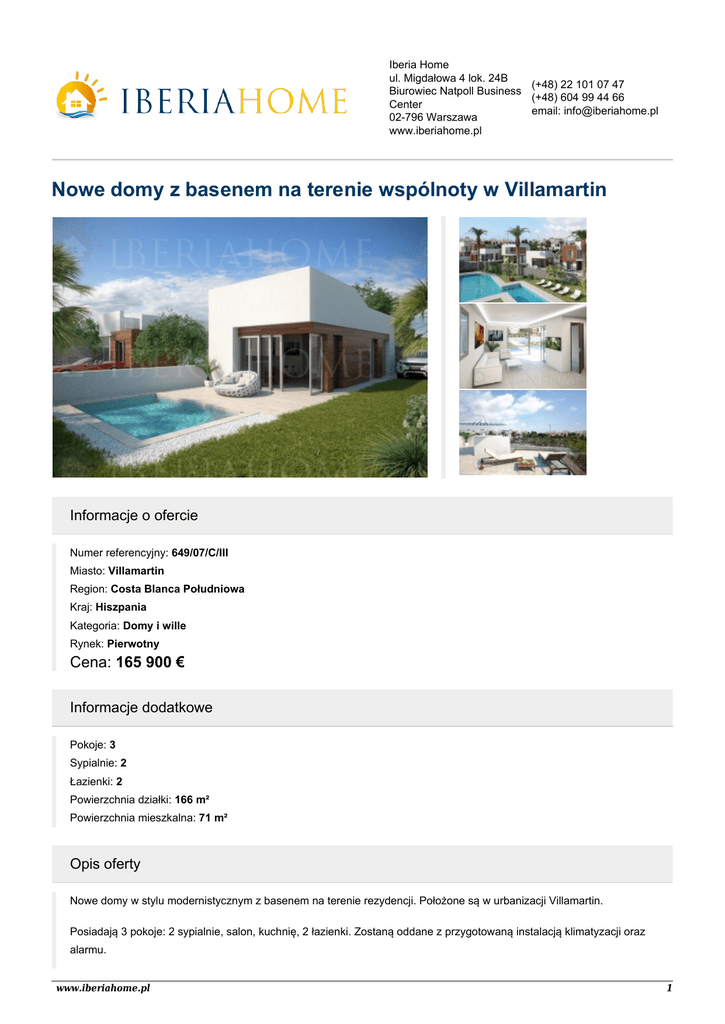 Iberia Home ul. Migdałowa 4 lok. 24B (+48) 22 101 07 47 Biurowiec Natpoll Business (+48) 604 99 44 66 Center email: [email protected] 02-796 Warszawa www.iberiahome.pl Nowe domy z basenem na terenie wspólnoty w Villamartin Informacje o ofercie Numer referencyjny: 649/07/C/III Miasto: Villamartin Region: Costa Blanca Południowa Kraj: Hiszpania Kategoria: Domy i wille Rynek: Pierwotny Cena: 165 900 € Informacje dodatkowe Pokoje: 3 Sypialnie: 2 Łazienki: 2 Powierzchnia działki: 166 m² Powierzchnia mieszkalna: 71 m² Opis oferty Nowe domy w stylu modernistycznym z basenem na terenie rezydencji. Położone są w urbanizacji Villamartin. Posiadają 3 pokoje: 2 sypialnie, salon, kuchnię, 2 łazienki. Zostaną oddane z przygotowaną instalacją klimatyzacji oraz alarmu. www.iberiahome.pl 1 Na zewnątrz znajduje się taras oraz solarium. Istnieje możliwość dokupienia opcji prywatnego basenu oraz piwnicy. Osiedle jest w trakcie budowy. Ceny od 165 900 EUR Udogodnienia ● Basen prywatny ● Basen wspólnoty ● Taras ● Pole golfowe ● Miejsce parkingowe ● Klimatyzacja ● Ogródek www.iberiahome.pl 2