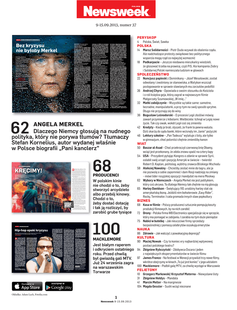 9-15.09.2013, numer 37 ŚWIAT PRZED WYBORAMI W NIEMCZECH POLITYKA Bez kryzysu nie byłoby Merkel NEWSWEEK: Kto wygra wybory do Bundestagu 22 września i dlaczego Merkel? STEFAN KORNELIUS: Merkel trzyma się mocno, ale to nie oznacza, że dalej będzie kanclerzem. Nie jest jasne, jak poradzi sobie w wyborach jej koalicjant, liberałowie z FDP. Poza tym historia pokazuje, że w sondażach przed wyborami zawsze wypadała lepiej, niż okazywało się po podliczeniu głosów. Jej przewaga nad SPD maleje. Niedawna debata telewizyjna pani kanclerz z kandydatem socjaldemokratów Peerem Steinbrückiem pokazała, że nastroje wyborców zmieniają się na niekorzyść Merkel. Córka pastora z NRD, która upadek muru berlińskiego powitała w saunie, jest dziś najpotężniejszą kobietą w Europie. Dlaczego Niemcy głosują na polityka, który nie porywa tłumów? O fenomenie Angeli Merkel rozmawiamy ze Stefanem Korneliusem, autorem wydanej właśnie w Polsce biografii „Pani kanclerz”. Dlaczego? Jeszcze 2-3 miesiące temu wydawało się, że nie ma dla niej alternatywy. – Z dwóch powodów. Po pierwsze, wyborcy nie interesują się tak bardzo sprawami, w których jest najlepsza: Europą i polityką zagraniczną. Ludzie żyją innymi problemami, takimi jak niskie płace, płaca minimalna [SPD chce ją wprowadzić na mocy ustawy w całym kraju – przyp. red.], sprawiedliwość społeczna, emerytury, system opieki zdrowotnej. Przeciwnicy Merkel oskarżają ją, że w tych dziedzinach nie zrobiła dostatecznie dużo. Po drugie, ludzie zorientowali się, że jest już kanclerzem od dłuższego czasu... Osiem lat to długo w kapryśnym świecie dzisiejszej polityki. – Dostatecznie długo, by publiczność zmęczyła się politykiem. Myślę, że Merkel i tak radzi sobie świetnie. Jej poprzednik Gerhard Schröder zużył cały swój kapitał polityczny już po siedmiu latach. Merkel wciąż ma go dość, by móc rządzić jeszcze przez kolejne cztery. Steinbrück jest jednak coraz bardziej widoczny, ludziom podoba się jego odmienny sposób prowadzenia polityki i argumentowania. Bywa bardziej precyzyjny, ostry. FOT FRANCOIS LENOIR/REUTERS/FORUM FOT. XXXXXXXXXXXXX Rozmawia JACEK PAWLICKI Jaka jest tajemnica Merkel? Jak to się stało, że dziewczyna wychowana i wykształcona w NRD została jedną z najbardziej wpływowych kobiet Zachodu? – Tajemnicą Merkel jest to, że nie ma zbyt wielu tajemnic. Jest bardzo zwyczajna i przewidywalna. Nikogo nie udaje. Stąpa twardo po ziemi. Jest au- tentyczna i to właśnie ten autentyzm jest najważniejszą cechą jej charakteru. To wciąż normalna kobieta. Pracowita. Nie jest próżna ani agresywna. Każdy może się z nią porównać i zobaczyć w niej kawałek siebie. W odróżnieniu od niej Schröder był próżny, fotografował się w rozwianym płaszczu z cygarem, uwielbiał pozy. W książce pisze pan, że rządy Merkel określił na dobre kryzys w strefie euro. Czy u progu trzeciej kadencji pani kanclerz wygrywa wojnę z kryzysem? – Kryzys się jeszcze nie skończył, więc poczekajmy z ostateczną oceną. Merkel przeszła przez kilka faz kryzysu, ale upłynie sporo czasu, zanim Europa wyjdzie na prostą. Stosunek do Merkel podzielił Europejczyków. Recepta na kryzys, czyli reformy i zaciskanie pasa, podobała się może na północy Unii, ale w Hiszpanii i Grecji ludzie tego nie kupili. W Grecji witają Merkel portretami z dorysowanym wąsikiem Hitlera. Czy to boli Niemców? – Niemcy czują się atakowani z niewłaściwych powodów. Nie czują się odpowiedzialni za tych, którzy przechodzą przez trudne czasy, raczej mają dla nich dużo sympatii i współczucia. Mocną stroną Merkel jest to, że utrzymała kryzys z daleka od Niemiec. Z drugiej jednak strony z tego powodu nie wszyscy Niemcy dostrzegli, jak strasznym zagrożeniem dla Europy był kryzys, z którym walczyła. Bywały przecież momenty, w których wydawało się, iż strefa euro się rozpadnie. A to miałoby katastrofalne skutki ekonomiczne i polityczne dla Niemiec. Merkel uratowała euro. Jak dotąd, bo kryzys wciąż trwa. Co było największym osiągnięciem Merkel w polityce zagranicznej? – Właśnie to, że powstrzymała rozpad strefy euro. A poza walką z kryzysem? – Mówiąc uczciwie, całe jej kanclerzowanie było poświęcone walce z kryzysem. Inne osiągnięcia pozostają daleko w cieniu, są niewidoczne. Bez kryzysu Merkel byłaby po prostu nudna. Nie była przecież szczególnie odważna w polityce bezpieczeństwa. Jeśli chodzi o kryzys na Bliskim Wschodzie ŚWIAT czy wojnę w Afganistanie, pozostawała zawsze w defensywie. Oczywiście w Niemczech z wiadomych względów obowiązują pewne ograniczenia, jeśli chodzi o interwencje zbrojne, ale mimo wszystko np. wstrzymanie się w marcu 2011 roku od głosu w Radzie Bezpieczeństwa w sprawie sojuszniczego zaangażowania w Libii było jej największym błędem w polityce zagranicznej. Rolę Merkel w historii określi walka z kryzysem – najpierw po upadku banku Lehman Brothers w 2008 roku, później w strefie euro. A potyczki z Putinem? Znająca rosyjski miłośniczka Rosji i rosyjskiej kultury zderzyła się z byłym funkcjonariuszem KGB, który od początku próbował ją wystraszyć. Z tego też wyszła obronną ręką? – Co ciekawe, w przeszłości wiedli niejako równoległe życia. Putin mieszkał w Dreźnie, gdzie przeżył upadek NRD i Układu Warszawskiego. Merkel dorastała w Templinie, sowieckim mieście garnizonowym, a potem studiowała fizykę w Lipsku. O ile Merkel była po stronie tych, co chcieli zjednoczenia Niemiec, Putin wręcz przeciwnie, starał się temu zapobiec. Ten antagonizm nie ustał, walka między nimi trwa do dzisiaj, chociaż jako politycy odczuwają wobec siebie pewien respekt. Putin zaakceptował w końcu styl Merkel, ale na początku próbował różnych metod, by ją zbić z tropu. Zorganizował specjalnie dla niej pokaz mody, bo na tyle, według niego, zasługiwała kobieta ka