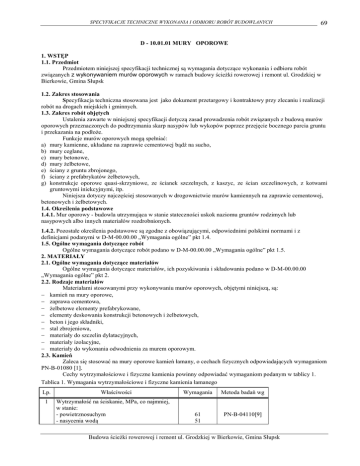 SPECYFIKACJE TECHNICZNE WYKONANIA I ODBIORU ROBÓT BUDOWLANYCH 69 D - 10.01.01 MURY OPOROWE 1. WSTĘP 1.1. Przedmiot Przedmiotem niniejszej specyfikacji technicznej są wymagania dotyczące wykonania i odbioru robót związanych z wykonywaniem murów oporowych w ramach budowy ścieżki rowerowej i remont ul. Grodzkiej w Bierkowie, Gmina Słupsk 1.2. Zakres stosowania Specyfikacja techniczna stosowana jest jako dokument przetargowy i kontraktowy przy zlecaniu i realizacji robót na drogach miejskich i gminnych. 1.3. Zakres robót objętych Ustalenia zawarte w niniejszej specyfikacji dotyczą zasad prowadzenia robót związanych z budową murów oporowych przeznaczonych do podtrzymania skarp nasypów lub wykopów poprzez przejęcie bocznego parcia gruntu i przekazania na podłoże. Funkcje murów oporowych mogą spełniać: a) mury kamienne, układane na zaprawie cementowej bądź na sucho, b) mury ceglane, c) mury betonowe, d) mury żelbetowe, e) ściany z gruntu zbrojonego, f) ściany z prefabrykatów żelbetowych, g) konstrukcje oporowe quasi-skrzyniowe, ze ścianek szczelnych, z kaszyc, ze ścian szczelinowych, z kotwami gruntowymi iniekcyjnymi, itp. Niniejsza dotyczy najczęściej stosowanych w drogownictwie murów kamiennych na zaprawie cementowej, betonowych i żelbetowych. 1.4. Określenia podstawowe 1.4.1. Mur oporowy - budowla utrzymująca w stanie stateczności uskok naziomu gruntów rodzimych lub nasypowych albo innych materiałów rozdrobnionych. 1.4.2. Pozostałe określenia podstawowe są zgodne z obowiązującymi, odpowiednimi polskimi normami i z definicjami podanymi w D-M-00.00.00 „Wymagania ogólne” pkt 1.4. 1.5. Ogólne wymagania dotyczące robót Ogólne wymagania dotyczące robót podano w D-M-00.00.00 „Wymagania ogólne” pkt 1.5. 2. MATERIAŁY 2.1. Ogólne wymagania dotyczące materiałów Ogólne wymagania dotyczące materiałów, ich pozyskiwania i składowania podano w D-M-00.00.00 „Wymagania ogólne” pkt 2. 2.2. Rodzaje materiałów Materiałami stosowanymi przy wykonywaniu murów oporowych, objętymi niniejszą, są: − kamień na mury oporowe, − zaprawa cementowa, − żelbetowe elementy prefabrykowane, − elementy deskowania konstrukcji betonowych i żelbetowych, − beton i jego składniki, − stal zbrojeniowa, − materiały do szczelin dylatacyjnych, − materiały izolacyjne, − materiały do wykonania odwodnienia za murem oporowym. 2.3. Kamień Zaleca się stosować na mury oporowe kamień łamany, o cechach fizycznych odpowiadających wymaganiom PN-B-01080 [1]. Cechy wytrzymałościowe i fizyczne kamienia powinny odpowiadać wymaganiom podanym w tablicy 1. Tablica 1. Wymagania wytrzymałościowe i fizyczne kamienia łamanego Lp. 1 Właściwości Wytrzymałość na ściskanie, MPa, co najmniej, w stanie: - powietrznosuchym - nasycenia wodą Wymagania Metoda badań wg 61 51 PN-B-04110[9] Budowa ścieżki rowerowej i remont ul. Grodzkiej w Bierkowie, Gmina Słupsk 70 SPECYFIKACJE TECHNICZNE WYKONANIA I ODBIORU ROBÓT BUDOWLANYCH - po badaniu mrozoodporności 46 Mrozoodporność. Liczba cykli zamrażania, po których występują uszkodzenia powierzchni, 21 PN-B-04102[8] krawędzi lub naroży, co najmniej 3 Odporność na niszczące działanie atmosfery przemysłowej. Kamień nie powinien ulegać od 0,5 do 10 PN-B-01080[1] niszczeniu w środowisku agresywnym, w którym 3 zawartość SO2 w mg/m wynosi 4 Ścieralność na tarczy Boehmego, mm, nie więcej niż, w stanie: PN-B-04111[10] - powietrznosuchym 2,5 - nasycenia wodą 5 5 Nasiąkliwość wodą, %, nie więcej niż 5 PN-B-04101[7] Dopuszcza się następujące wady powierzchni licowej kamienia: − wgłębienia do 20 mm, o rozmiarach nie przekraczających 20 % powierzchni, − szczerby oraz uszkodzenia krawędzi i naroży o głębokości do 10 mm, przy łącznej długości uszkodzeń nie więcej niż 10 % długości każdej krawędzi. Kamień łamany należy składować w warunkach zabezpieczających przed zanieczyszczeniem i zmieszaniem poszczególnych jego rodzajów. 2.4. Żelbetowe elementy prefabrykowane Kształt i wymiary żelbetowych elementów prefabrykowanych powinny być zgodne z dokumentacją projektową. Odchyłki wymiarowe prefabrykatów powinny odpowiadać PN-B-02356 [4] według 7 klasy: Wymiar elementu, mm Tolerancja wymiaru, mm od 300 do 900 10 od 900 do 3000 12 od 3000 do 9000 16 Powierzchnie elementów powinny być gładkie, bez raków, pęknięć i rys. Dopuszcza się drobne pory o głębokości do 5 mm jako pozostałości po pęcherzykach powietrza i wodzie. Po wbudowaniu elementów dopuszcza się wyszczerbienia krawędzi o głębokości do 10 mm i długości do 50 mm w liczbie 2 sztuk na 1 m krawędzi elementu, przy czym na jednej krawędzi nie może być więcej niż 5 wyszczerbień. Elementy należy składować na wyrównanym, utwardzonym i odwodnionym podłożu. Poszczególne rodzaje elementów powinny być składowane oddzielnie. 2.5. Zaprawa cementowa Do muru oporowego kamiennego należy stosować zaprawy cementowe wg PN-B-14501 [27] marki nie niższej niż M 12. Do zapraw należy stosować cement powszechnego użytku wg normy PN-B-19701 [28], piasek wg PN-B06711 [16] i wodę wg PN-B-32250 [34]. 2.6. Elementy deskowania konstrukcji betonowych i żelbetowych Deskowanie powinno odpowiadać wymaganiom określonym w PN-B-06251 [13]. Deskowanie należy wykonać z materiałów odpowiadających następującym normom: − drewno iglaste tartaczne do robót ciesielskich wg PN-D-95017 [35], − tarcica iglasta do robót ciesielskich wg PN-B-06251 [13] i PN-D-96000 [36], − tarcica iglasta do drobnych elementów jak kliny, klocki itp. wg PN-D-96002 [37], − gwoździe wg BN-87/5028-12 [46], − śruby, wkręty do drewna i podkładki do śrub wg PN-M-82121 [41], PN-M-82503 [42], PN-M-82505 [43] i PNM-82010 [40], − płyty pilśniowe z drewna wg BN-69/7122-11 [55]. Dopuszcza się wykonanie deskowań z innych materiałów, pod warunkiem akceptacji Inżyniera. 2.7. Beton i jeg