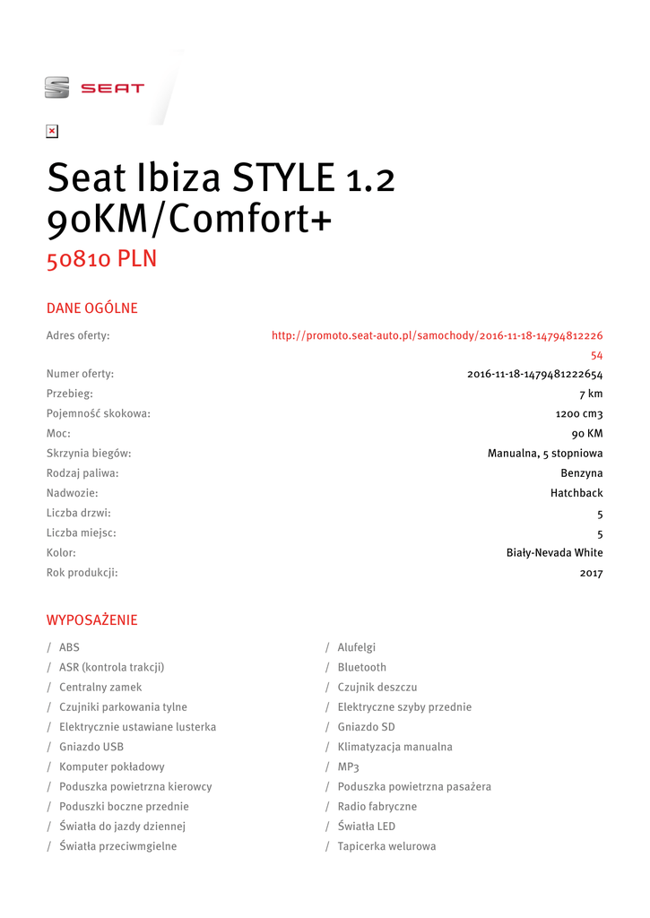 Seat Ibiza STYLE 1.2 90KM/Comfort+ 50810 PLN DANE OGÓLNE Adres oferty: http://promoto.seat-auto.pl/samochody/2016-11-18-14794812226 54 Numer oferty: 2016-11-18-1479481222654 Przebieg: 7 km Pojemność skokowa: 1200 cm3 Moc: 90 KM Skrzynia biegów: Manualna, 5 stopniowa Rodzaj paliwa: Benzyna Nadwozie: Hatchback Liczba drzwi: 5 Liczba miejsc: 5 Kolor: Biały-Nevada White Rok produkcji: 2017 WYPOSAŻENIE / ABS / Alufelgi / ASR (kontrola trakcji) / Bluetooth / Centralny zamek / Czujnik deszczu / Czujniki parkowania tylne / Elektryczne szyby przednie / Elektrycznie ustawiane lusterka / Gniazdo SD / Gniazdo USB / Klimatyzacja manualna / Komputer pokładowy / MP3 / Poduszka powietrzna kierowcy / Poduszka powietrzna pasażera / Poduszki boczne przednie / Radio fabryczne / Światła do jazdy dziennej / Światła LED / Światła przeciwmgielne / Tapicerka welurowa / Wielofunkcyjna kierownica / Wspomaganie kierownicy OPIS Serdecznie zapraszamy do zapoznania się z ofertę Autoryzowanego Dealera marki SEAT w Katowicach - PROMOTO. Seat IBIZA 5D w wersji Style 1.2 TSI 90KM. Auto w standardowym wyposażeniu z wersji Style posiada między innymi:- ABS- Elektrycznie regulowane i podgrzewane lusterka boczne- Centralny zamek z pilotemRadioodtwarzacz CD + MP3 + AUX-in + pilot sterowania przy kierownicy + 6 głośników- Elektrycznie sterowane szyby boczne z przodu- Przednie poduszki powietrzne- Boczna poduszka powietrzna chroniąca również głowęZaczepy iSOFIX i Top Tether przy siedzeniach tylnej kanapy (1+1)- Zawieszenie COMFORT- Reflektory przeciwmgielne z przodu z funkcją doświetlania zakrętów- Światła do jazdy dziennej- Gniazdko 12V, 2 uchwyty na napoje z przodu i 1 uchwyt na napoje z tyłu- Składana tylna kanapa (dzielona)- Kolumna kierownicy z regulacją w pionie i poziomie- Wielofunkcyjna kierownica,- Gałka dźwigni zmiany biegów i dźwignia hamulca ręcznego obszyte skórą- Komputer pokładowy. Poza standardowym wyposażeniem wersji STYLE auto posiada:Pakiet COMFORT+ czyli:- 15 calowe felgi aluminiowe- tylne czujniki parkowani- światła LED do jazdy dziennej. CENA KATALOGOWA: 52 930 PLN. CENA SPECJALNA : 50810 PLN z uwzględnionym rabatem za pakiet comfort+ z uznanym rabatem dla wybranych grup zawodowych i aktualnymi promocjami. Wszelkie informacje na temat auta uzyskacie Państwo pod numerami telefonów: Monika 885-859-121, Dominik 515-437-793, Michał 885-859-123. Ogłoszenie nie stanowi w rozumieniu Art. 71 Kodeksu Cywilnego oferty handlowej – jest zaproszeniem do negocjacji.