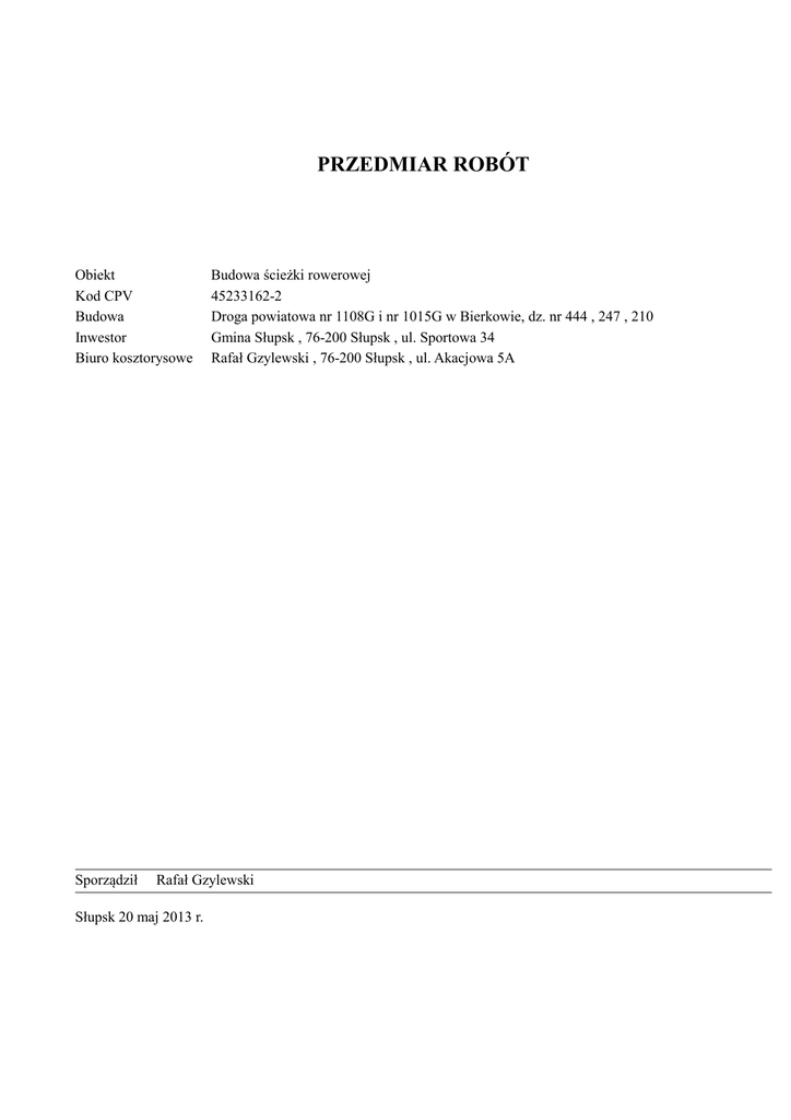 PRZEDMIAR ROBÓT Obiekt Kod CPV Budowa Inwestor Biuro kosztorysowe Sporządził Budowa ścieżki rowerowej 45233162-2 Droga powiatowa nr 1108G i nr 1015G w Bierkowie, dz. nr 444 , 247 , 210 Gmina Słupsk , 76-200 Słupsk , ul. Sportowa 34 Rafał Gzylewski , 76-200 Słupsk , ul. Akacjowa 5A Rafał Gzylewski Słupsk 20 maj 2013 r. Rodos 6.8.31.0 [10766] Przedmiar Budowa ścieżki rowerowej Nr Podstawa Opis robót Element robót... 1 KNR 2-01 Roboty pomiarowe przy liniowych robotach ziemnych - trasa kolei w terenie równinnym 0119/01 2 KNR 2-01 0105/05 Mechaniczne karczowanie pni o średnicy 46-55cm 3 KNR 2-01 0110/02 Transport karpiny na odległość do 2km 4 KNR 2-01 0206/04 Ścieżka rowerowa Roboty ziemne wykonywane koparkami podsiębiernymi z transportem urobku samochodami samowyładowczymi na odległość do 1,0km - koparki o pojemności łyżki 0,60m3, grunt kategorii III 5 KNR 2-31 0103/04 Profilowanie i zagęszczanie mechaniczne podłoża pod warstwy konstrukcyjne nawierzchni w gruncie kategorii I-IV 6 KNR 2-31 0104/05 Warstwa odsączająca z piasku grubości po zagęszczeniu 10cm w korycie lub na całej szerokości drogi zagęszczana mechanicznie 7 KNR 2-31 0104/06 Warstwa odsączająca z piasku grubości po zagęszczeniu 10cm w korycie lub na całej szerokości drogi zagęszczana mechanicznie - za każdy dalszy 1cm (Krotność= 5) 8 KNR 2-31 0402/04 Ława betonowa z oporem pod krawężniki z betonu B-15 9 KNR 2-31 0403/03 Krawężniki betonowe o wymiarach 15x30cm wystające na podsypce cementowo-piaskowej 10 KNR 2-31 0403/05 Krawężniki betonowe o wymiarach 12x25cm wtopione na podsypce cementowo-piaskowej 11 KNR 2-31 0402/04 Ława betonowa z oporem pod obrzeże z betonu B-15 12 KNR 2-31 0407/03 Obrzeża betonowe o wymiarach 30x8cm na podsypce piaskowej, z wypełnieniem spoin piaskiem 13 KNR 2-31 0114/05 Warstwa dolna podbudowy z kruszywa kamiennego łamanego 0/31,5 o grubości po zagęszczeniu 15cm 14 KNR 2-31 1004/07 Skropienie podbudowy emulsją asfaltową w ilości 0,5 kg/m2 15 KNR 2-31 0311/05 Nawierzchnia z mieszanek mineralno-bitumicznych grysowo-żwirowych z warstwą ścieralną afaltową AC 8S dla KR 1-2 , o grubości po zagęszczeniu 3cm 16 KNR 2-31 0311/06 Nawierzchnia z mieszanek mineralno-bitumicznych grysowo-żwirowych z warstwą ścieralną afaltową AC 8S dla KR 1-2 o grubości po zagęszczeniu 3cm - za każdy dalszy 1cm 17 KNR 2-31 0103/04 Zjazdy Profilowanie i zagęszczanie mechaniczne podłoża pod warstwy konstrukcyjne nawierzchni w gruncie kategorii I-IV 18 KNR 2-31 0104/05 Warstwa odsączająca z piasku grubości po zagęszczeniu 10cm w korycie lub na całej szerokości drogi zagęszczana mechanicznie 19 KNR 2-31 0104/06 Warstwa odsączająca z piasku grubości po zagęszczeniu 10cm w korycie lub na całej szerokości drogi zagęszczana mechanicznie - za każdy dalszy 1cm (Krotność= 5) 20 KNR 2-31 0114/05 Warstwa dolna podbudowy z kruszywa kamiennego 0/31,5 łamanego o grubości po zagęszczeniu 15cm 21 KNR 2-31 1004/07 Skropienie podbudowy emulsją asfaltową w ilości 0,5 kg/m2 22 KNR 2-31 0311/01 Nawierzchnia z mieszanek mineralno-bitumicznych grysowo-żwirowych z warstwą wiążącą afaltową AC 16W dla KR 1-2 , o grubości po zagęszczeniu 4cm Strona 2/20 Jm Ilość km 0,65 szt 8,00 mp 8,00 m3 477,00 m2 1 769,00 m2 1 769,00 m2 1 769,00 m3 39,40 m 538,00 m 118,00 m3 24,00 m 598,00 m2 1 622,50 m2 1 622,50 m2 1 622,50 m2 1 622,50 m2 194,00 m2 194,00 m2 194,00 m2 194,00 m2 194,00 Rodos 6.8.31.0 [10766] Strona 3/20 Przedmiar Budowa ścieżki rowerowej Nr Podstawa Opis robót 23 KNR 2-31 1004/07 Skropienie warstwy wyrównawczej emulsją asfaltową w ilości 0,3 kg/m2 24 KNR 2-31 0311/05 Nawierzchnia z mieszanek mineralno-bitumicznych grysowo-żwirowych z warstwą ścieralną afaltową AC 8S dla KR 1-2, o grubości po zagęszczeniu 3cm 25 KNR 2-31 0311/06 Nawierzchnia z mieszanek mineralno-bitumicznych grysowo-żwirowych z warstwą ścieralną afaltową AC 8S dla KR 1-2, o grubości po zagęszczeniu 3cm - za każdy dalszy 1cm 26 KNR 2-31 0114/05 Utwardzenie pobocza za zjazdem , na pole , z kruszywa łamanego 0/31,5 o grubości po zagęszczeniu 15cm 27 KNR 2-31 0109/03 Jm m2 Ilość 194,00 m2 194,00 m2 194,00 m2 194,00 m2 23,00 m2 3,00 m 15,00 m2 7,00 m2 7,00 m 15,00 szt 5,00 m3 16,80 m3 16,80 m 28,00 m3 9,80 m2 30,00 m3 7,50 m2 15,00 m2 15,00 m2 15,00 m2 15,00 m2 15,00 Ściek podchodnikowy Podbudowy betonowe bez dylatacji z betonu B-20 o grubości warstwy po zagęszczeniu 12cm ( grubość 8 cm ) (Krotność= 0,7) 28 KNR 2-18 0507/01 Kanały rurowe z rur PCV o długości 3,00m i średnicy nominalnej 150mm, 29 KNR 2-31 0105/05 Warstwy podsypkowe cementowo-piaskowe zagęszczane ręcznie o grubości po zagęszczeniu 3cm 30 KNR 2-31 0105/06 Warstwy podsypkowe cementowo-piaskowe zagęszczane ręcznie - za każdy dalszy 1cm ( grubość 5 cm ) (Krotność= 2) 31 KNR 2-01 0515/01 Ułożenie ścieków drogowych korytkowych grubości 15cm bez podbudowy 32 KNR 2-15 0212/01 Montaż wpustów żeliwnych bocznych Przepusty pod zjazdami Roboty ziemne wykonywane koparkami przedsiębiernymi z transportem urobku samochodami samowyładowczymi na odległość do 1km - koparki o pojemności łyżki 0,40m3, grunt kategorii III 33 KNR 2-01 0202/02 34 KNR 2-31 0605/01 Ławy fundamentowe żwirowe przepustów rurowych pod zjazdami 35 KNR 2-31 0605/07 Rury PCV o średnicy 40cm przepustów rurowych pod zjazdami 36 KNR 2-01 0501/01 Ręczne zasypywanie wykopów ze skarpami z przerzutem na odległość do 3m w gruncie kategorii I-III 37 KNR 2-01 0512/04 Brukowanie skarp, przekopów i nasypów na podsypce z pospółki lub piasku, z zalaniem szczelin zaprawą cementową 38 KNR 2-01 0202/02 Poszerzenie jezdni Roboty ziemne wykonywane koparkami przedsiębiernymi z transportem urobku samochodami samowyładowczymi na odległość do 1km - koparki o pojemności łyżki 0,40m3, grunt kategorii III 39 KNR 2-31 0103/02 Profilowanie i zagęszczanie ręczne podłoża pod warstwy konstrukcyjne nawierzc