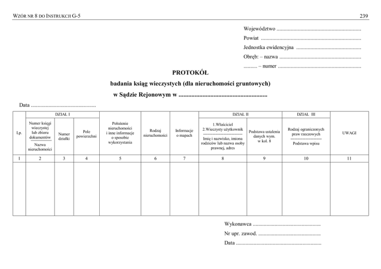 WZÓR NR 8 DO INSTRUKCJI G-5 239 Województwo ............................................................ Powiat ....................................................................... Jednostka ewidencyjna .............................................. Obręb: – nazwa .......................................................... .......... – numer ........................................................... PROTOKÓŁ badania ksiąg wieczystych (dla nieruchomości gruntowych) w Sądzie Rejonowym w ........................................................ Data ................................................ DZIAŁ I Lp. Numer księgi wieczystej lub zbioru dokumentów Numer działki Pole powierzchni Położenie nieruchomości i inne informacje o sposobie wykorzystania Rodzaj nieruchomości Informacje o mapach 4 5 6 7 Nazwa nieruchomości 1 2 3 DZIAŁ II DZIAŁ III 1.Właściciel 2.Wieczysty użytkownik Podstawa ustalenia ----------------------------danych wym. Imię i nazwisko, imiona w kol. 8 rodziców lub nazwa osoby prawnej, adres Rodzaj ograniczonych praw rzeczowych ----------------------Podstawa wpisu 8 9 10 Wykonawca .................................................. Nr upr. zawod. .............................................. Data ............................................................... UWAGI 11
