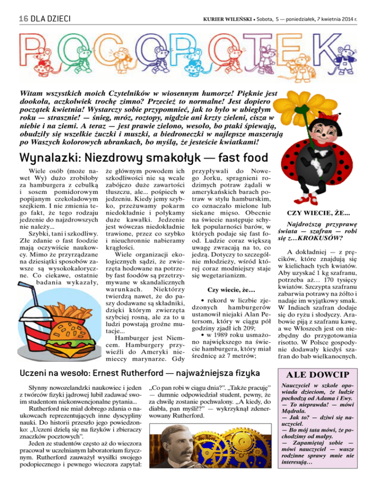 16 DLA DZIECI KURIER WILEŃSKI • Sobota, 5 — poniedziałek, 7 kwietnia 2014 r. Witam wszystkich moich Czytelników w wiosennym humorze! Pięknie jest dookoła, aczkolwiek trochę zimno? Przecież to normalne! Jest dopiero początek kwietnia! Wystarczy sobie przypomnieć, jak to było w ubiegłym roku — strasznie! — śnieg, mróz, roztopy, nigdzie ani krzty zieleni, cisza w niebie i na ziemi. A teraz — jest prawie zielono, wesoło, bo ptaki śpiewają, obudziły się wszelkie żuczki i muszki, a biedroneczki w najlepsze maszerują po Waszych kolorowych ubrankach, bo myślą, że jesteście kwiatkami! Wynalazki: Niezdrowy smakołyk — fast food Wiele osób (może nawet Wy) dużo zrobiłoby za hamburgera z cebulką i sosem pomidorowym popijanym czekoladowym szejkiem. I nie zmienia tego fakt, że tego rodzaju jedzenie do najzdrowszych nie należy... Szybki, tani i szkodliwy. Złe zdanie o fast foodzie mają oczywiście naukowcy. Mimo że przyrządzane na dziesiątki sposobów zawsze są wysokokaloryczne. Co ciekawe, ostatnie badania wykazały, że głównym powodem ich szkodliwości nie są wcale zabójczo duże zawartości tłuszczu, ale... pośpiech w jedzeniu. Kiedy jemy szybko, przeżuwamy pokarm niedokładnie i połykamy duże kawałki. Jedzenie jest wówczas niedokładnie trawione, przez co szybko i nieuchronnie nabieramy krągłości. Wiele organizacji ekologicznych sądzi, że zwierzęta hodowane na potrzeby fast foodów są przetrzymywane w skandalicznych warunkach. Niektórzy twierdzą nawet, że do paszy dodawane są składniki, dzięki którym zwierzęta szybciej rosną, ale za to u ludzi powstają groźne mutacje... Hamburger jest Niemcem. Hamburgery przywieźli do Ameryki niemieccy marynarze. Gdy przypływali do Nowego Jorku, spragnieni rodzimych potraw żądali w amerykańskich barach potraw w stylu hamburskim, co oznaczało mielone lub siekane mięso. Obecnie na świecie następuje schyłek popularności barów, w których podaje się fast food. Ludzie coraz większą uwagę zwracają na to, co jedzą. Dotyczy to szczególnie młodzieży, wśród której coraz modniejszy staje się wegetarianizm. Czy wiecie, że… • rekord w liczbie zjedzonych hamburgerów ustanowił niejaki Alan Petersom, który w ciągu pół godziny zjadł ich 209; • w 1989 roku usmażono największego na świecie hamburgera, który miał średnicę aż 7 metrów; Uczeni na wesoło: Ernest Rutherford — najważniejsza fizyka Słynny nowozelandzki naukowiec i jeden z twórców fizyki jądrowej lubił zadawać swoim studentom niekonwencjonalne pytania... Rutherford nie miał dobrego zdania o naukowcach reprezentujących inne dyscypliny nauki. Do historii przeszło jego powiedzonko: „Uczeni dzielą się na fizyków i zbieraczy znaczków pocztowych”. Jeden ze studentów często aż do wieczora pracował w uczelnianym laboratorium fizycznym. Rutherford zauważył wysiłki swojego podopiecznego i pewnego wieczora zapytał: „Co pan robi w ciągu dnia?”. „Także pracuję” — dumnie odpowiedział student, pewny, że za chwilę zostanie pochwalony. „A kiedy, do diabła, pan myśli!?” — wykrzyknął zdenerwowany Rutherford. CZY WIECIE, ŻE... Najdroższą przyprawę świata — szafran — robi się z…KROKUSÓW? A dokładniej — z pręcików, które znajdują się w kielichach tych kwiatów. Aby uzyskać 1 kg szafranu, potrzeba aż… 170 tysięcy kwiatów. Szczypta szafranu zabarwia potrawy na żółto i nadaje im wyjątkowy smak. W Indiach szafran dodaje się do ryżu i słodyczy. Arabowie piją z szafranu kawę, a we Włoszech jest on niezbędny do przygotowania risotto. W Polsce gospodynie dodawały kiedyś szafran do bab wielkanocnych. ALE DOWCIP Nauczyciel w szkole opowiada dzieciom, że ludzie pochodzą od Adama i Ewy. — To nieprawda! — mówi Mądrala. — Jak to? — dziwi się nauczyciel. — Bo mój tata mówi, że pochodzimy od małpy. — Zapamiętaj sobie — mówi nauczyciel — wasze rodzinne sprawy mnie nie interesują… DLA DZIECI 17 KURIER WILEŃSKI • Sobota, 5 — poniedziałek, 7 kwietnia 2014 r. Boicie się ciemności? Wasza wyobraźnia może napędzić Wam w nocy strach. Cienie wyglądają, jakby się skradały. Różne dźwięki przywodzą na myśl duchy. Możecie się bać, że coś kryje się pod Waszym łóżkiem. Może Wam wydawać się, że w szafie są potwory… Jak sobie z tym poradzić? • Być może Wasza mama albo tata mogliby upiec specjalne „ciasteczka odwagi”, które zjecie wieczorem. • Możecie zapytać swoich rodziców, czy bali się Połącz kropki i pokoloruj ciemności, kiedy byli mali i co im wtedy pomagało przezwyciężyć strach. • Niech Wasi rodzice pomogą zajrzeć Wam pod łóżko i przeszukać szafę. • Pomyślcie, że Wasz ulubiony miś będzie Was bronił, kiedy położycie się spać. • Kiedy odmawiacie swoją wieczorną modlitwę, pamiętajcie, że Pan Bóg jest zawsze przy Was i zostanie z Wami całą noc. • Nie oglądajcie żadnych filmów-horrorów — to z pewnością pomoże! ABC pierwszej pomocy (3) Zranienia. Każda rana powoduje ból, krwawienie i możliwość zakażenia. Każdą ranę pozostawiamy w stanie, w jakim ją zastaliśmy, przykrywając jedynie możliwie szybko jałowym materiałem opatrunkowym. W czasie opatrywania rany ranny powinien leżeć lub co najmniej siedzieć. Rany nie wolno dotykać ani przemywać. Nie należy samodzielnie usuwać ciał obcych tkwiących w ranie, gdyż zapobiegają krwawieniu. W przypadku ugryzienia przez zwierzę (psa, lisa, nietoperza) istnieje bardzo duże zagrożenie zakażeniem, szczególnie wścieklizną, która może okazać się śmiertelna! Jeśli to możliwe, dorośli powinni schwytać zwierzę i przekazać do badania. Ranę należy przemyć mydłem, które działa zabójczo na wirus wścieklizny, obficie wypłukać i niezwłocznie udać się do lekarza. Gry i zabawy: Pip, pip! — Czy to krowa? Pewnie, że nie! Ale czy wiemy i znamy odgłosy i wygl