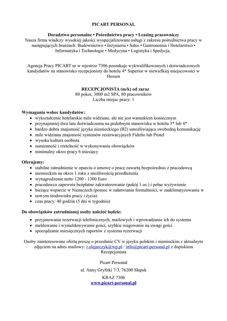 PICART PERSONAL Doradztwo personalne • Pośrednictwo pracy • Leasing pracowniczy Nasza firma wiadczy wysokiej jakości wyspecjalizowane usługi z zakresu pośrednictwa pracy w następujących branżach: Budownictwo • Inżynieria • Sales • Gastronomia i Hotelarstwo • Informatyka i Technologie • Medycyna • Logistyka i Spedycja. Agencja Pracy PICART nr w rejestrze 7306 poszukuje wykwalifikowanych i doświadczonych kandydatów na stanowisko recepcjonisty do hotelu 4* Superior w niewielkiej miejscowości w Hessen RECEPCJONISTA (m/k) od zaraz 80 pokoi, 3000 m2 SPA, 80 pracowników Liczba miejsc pracy: 1 Wymagania wobec kandydatów: wykształcenie hotelarskie mile widziane, ale nie jest warunkiem koniecznym przynajmniej dwa lata doświadczenia na podobnym stanowisku w hotelu 3* lub 4* bardzo dobra znajomość języka niemieckiego (B2) umożliwiająca swobodną komunikację mile widziana znajomość systemów rezerwacyjnych Fidelio lub Protel wysoka kultura osobista sumienność i rzetelność w wykonywaniu obowiązków minimalny okres pracy 6 miesięcy Oferujemy: stabilne zatrudnienie w oparciu o umowę o pracę zawartą bezpośrednio z pracodawcą niemieckim na okres 1 roku z możliwością przedłużenia wynagrodzenie netto 1200 - 1300 Euro pracodawca zapewnia bezpłatne zakwaterowanie (pokój 1 os.) i pełne wyżywienie bieżące wsparcie w Niemczech (pomoc w załatwianiu formalności, w zaaklimatyzowaniu w nowym środowisku pracy i życia) czas pracy: 40 godzin (5 dni w tygodniu) Do obowiązków zatrudnionej osoby należeć będzie: przyjmowanie rezerwacji telefonicznych, mailowych i wprowadzanie ich do systemu meldowanie i wymeldowywanie gości, szybkie reagowanie na uwagi gości sporządzanie miesięcznych raportów z systemu rezerwacji Osoby zainteresowane ofertą proszę o przesłanie CV w języku polskim i niemieckim z aktualnym zdjęciem na adres mailowy: [email protected] / [email protected] z dopiskiem Recepcjonista Picart Personal ul. Anny Gryfitki 7/3, 76200 Słupsk KRAZ 7306 www.picart-personal.pl PICART PERSONAL Doradztwo personalne • Pośrednictwo pracy • Leasing pracowniczy Nasza firma wiadczy wysokiej jakości wyspecjalizowane usługi z zakresu pośrednictwa pracy w następujących branżach: Budownictwo • Inżynieria • Sales • Gastronomia i Hotelarstwo • Informatyka i Technologie • Medycyna • Logistyka i Spedycja. Agencja Pracy PICART nr w rejestrze 7306 poszukuje kandydatów na stanowisko cukiernika do renomowanej restauracji w zamku w okolicach Wiesbaden Cukiernik od zaraz do 15.10.2016 Kuchnia: niemiecka i międzynarodowa, a la carte, bankiety, wesela Liczba miejsc pracy: 1 Wymagania wobec kandydatów: znajomości technik cukierniczych i wykształcenia kierunkowego lub długoletniego doświadczenia w zawodzie cukiernika udokumentowanego doświadczenie zawodowego na podobnym stanowisku w prestiżowych restauracjach lub hotelach 3, 4 i 5* komunikatywna znajomość języka niemieckiego lub ewentualnie angielskiego pasji, chęci rozwoju, kreatywności i zaangażowania umiejętność efektywnej komunikacji i kształtowania miłej atmosfery w grupie minimalny okres pracy 6 miesięcy Oferujemy: stabilne zatrudnienie w oparciu o umowę o pracę zawartą bezpośrednio z pracodawcą niemieckim na okres sezonu wynagrodzenie brutto do uzgodnienia w zależności od doświadczenia i kwalifikacji pracodawca zapewnia odpłatne zakwaterowanie (pokój 1 os. w akademiku lub mieszkaniu, 200 Euro) i bezpłatne wyżywienie w trakcie pracy (opodatkowane) bieżące wsparcie w Niemczech (pomoc w załatwianiu formalności, w zaaklimatyzowaniu w nowym środowisku pracy i życia) czas pracy: 40 godzin (5 dni w tygodniu) 25 dni urlopu Do obowiązków zatrudnionej osoby należeć będzie: przygotowanie produktów cukierniczych i deserów na bardzo wysokim poziomie z najnowszymi standardami w cukiernictwie umiejętność modyfikowania przepisów, dostosowywania ich do okoliczności wdrażanie nowych i autorskich pomysłów Osoby zainteresowane ofertą proszę o przesłanie CV w języku polskim i niemieckim lub angielskim z aktualnym zdjęciem na adres mailowy: [email protected] / [email protected] z dopiskiem Cukiernik o. Wiesbaden Picart Personal, ul. Anny Gryfitki 7/3, 76200 Słupsk www.picart-personal.pl PICART PERSONAL Doradztwo personalne • Pośrednictwo pracy • Leasing pracowniczy Nasza firma wiadczy wysokiej jakości wyspecjalizowane usługi z zakresu pośrednictwa pracy w następujących branżach: Budownictwo • Inżynieria • Sales • Gastronomia i Hotelarstwo • Informatyka i Technologie • Medycyna • Logistyka i Spedycja. Agencja Pracy PICART nr w rejestrze 7306 poszukuje kandydatów na stanowisko szefa kuchni do hotelu 4* Superior w niewielkiej miejscowości w Hessen. SZEF KUCHNI od zaraz Kuchnia: niemiecka i europejska, Brygada: 16 pracowników 80 pokoi i 3000m2 SPA Do obowiązków zatrudnionej osoby należeć będzie: • nadzór nad pracą w kuchni • przygotowywanie potraw zgodnie ze standardami restauracji • dbałość o estetykę potraw • przygotowywanie dań zimnych i gorących w formie a la carte, bankietów, bufetów • przestrzeganie przepisów HACCP Wymagania wobec kandydatów: • znajomości technik kulinarnych i wykształcenia kierunkowego • udokumentowanego doświadczenie zawodowego na podobnym stanowisku • dobra znajomość języka niemieckiego, weryfikowana w trakcie procesu rekrutacji • pasji, chęci rozwoju, kreatywności i zaangażowania • umiejętność efektywnej komunikacji i kształtowania miłej atmosfery w grupie • minimalny okres pracy 6 miesięcy Oferujemy: • stabilne zatrudnienie w oparciu o umowę o pracę zawartą bezpośrednio z pracodawcą niemieckim na okres roku z możliwością przedłużenia umowy przez obie strony • wynagrodzenie brutto do uzgodnienia w zależności od doświadczenia i kwalifikacji • pracodawca zapewnia zakwaterowanie (pokój 1 os.) i pełne wyżywienie (3 posiłki) • b