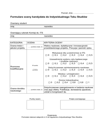 Poznań, dnia …................................... Formularz oceny kandydata do Indywidualnego Toku Studiów Oceniany student imię nazwisko Oceniający członek Komisji ds. ITS imię nazwisko KATEGORIA Ocena treści i jakości projektu OCENA ….. punktów (maks. 3) KRYTERIA OCENY Walory naukowe, dydaktyczne i innowacyjność przedstawionego projektu. Precyzja i jasność opisu. □0 □0 Rozmowa kwalifikacyjna Motywacje dla uczestnictwa w ITS: □ 0,1 □ 0,2 □ 0,3 □ 0,4 □ 0,5 Uzasadnienie wyboru celu badawczego i środków realizacji: □ 0,1 □ 0,2 □ 0,3 □ 0,4 □ 0,5 W sumie: …..….. punktów Dotychczasowe zainteresowania naukowe: □0 □ 0,1 □0 □ 0,1 □ 0,2 □ 0,3 □ 0,4 Wiedza i umiejętności: □ 0,2 □ 0,3 □ 0,4 □ 0,5 □ 0,5 Ocena indywidualna: □0 Ocena dorobku naukowego ….. punktów (maks. 3) Punkty razem: □ 0,2 □ 0,4 □ 0,6 □ 0,8 □1 Dotychczasowe zaangażowanie w badania naukowe oraz jego efekty. Publikacje, doniesienia zjazdowe, udział w kongresach itp. Podpis oceniającego Wyjaśnienie Formularz stanowi załącznik nr 2 do regulaminu Indywidualnego Toku Studiów.