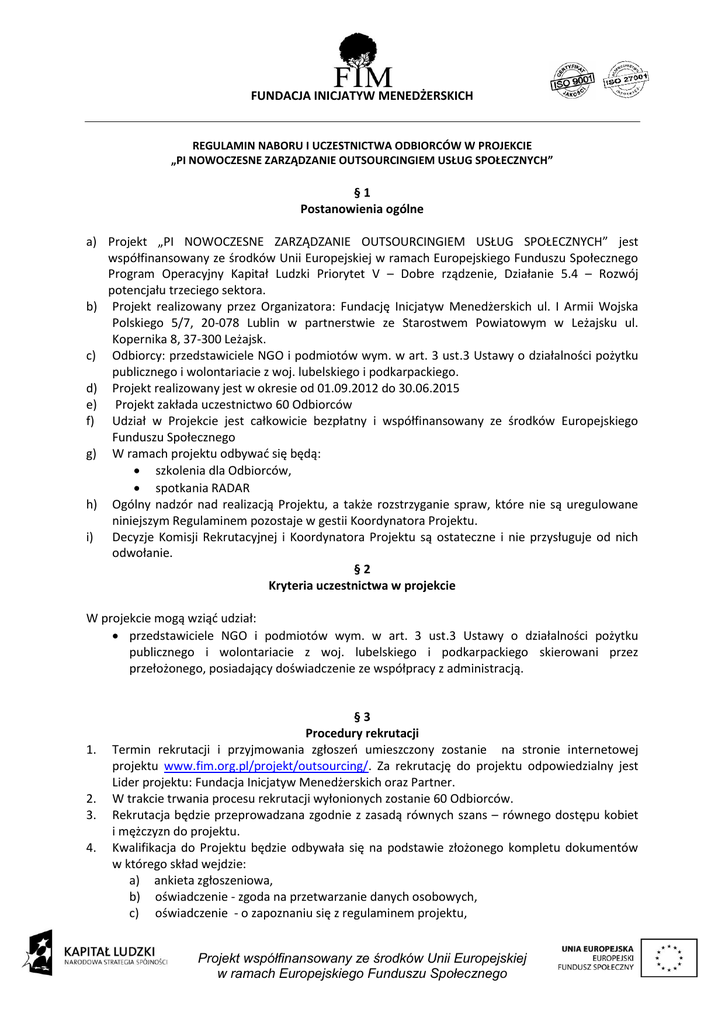 FUNDACJA INICJATYW MENEDŻERSKICH REGULAMIN NABORU I UCZESTNICTWA ODBIORCÓW W PROJEKCIE „PI NOWOCZESNE ZARZĄDZANIE OUTSOURCINGIEM USŁUG SPOŁECZNYCH” §1 Postanowienia ogólne a) Projekt „PI NOWOCZESNE ZARZĄDZANIE OUTSOURCINGIEM USŁUG SPOŁECZNYCH” jest współfinansowany ze środków Unii Europejskiej w ramach Europejskiego Funduszu Społecznego Program Operacyjny Kapitał Ludzki Priorytet V – Dobre rządzenie, Działanie 5.4 – Rozwój potencjału trzeciego sektora. b) Projekt realizowany przez Organizatora: Fundację Inicjatyw Menedżerskich ul. I Armii Wojska Polskiego 5/7, 20-078 Lublin w partnerstwie ze Starostwem Powiatowym w Leżajsku ul. Kopernika 8, 37-300 Leżajsk. c) Odbiorcy: przedstawiciele NGO i podmiotów wym. w art. 3 ust.3 Ustawy o działalności pożytku publicznego i wolontariacie z woj. lubelskiego i podkarpackiego. d) Projekt realizowany jest w okresie od 01.09.2012 do 30.06.2015 e) Projekt zakłada uczestnictwo 60 Odbiorców f) Udział w Projekcie jest całkowicie bezpłatny i współfinansowany ze środków Europejskiego Funduszu Społecznego g) W ramach projektu odbywać się będą: szkolenia dla Odbiorców, spotkania RADAR h) Ogólny nadzór nad realizacją Projektu, a także rozstrzyganie spraw, które nie są uregulowane niniejszym Regulaminem pozostaje w gestii Koordynatora Projektu. i) Decyzje Komisji Rekrutacyjnej i Koordynatora Projektu są ostateczne i nie przysługuje od nich odwołanie. §2 Kryteria uczestnictwa w projekcie W projekcie mogą wziąć udział: przedstawiciele NGO i podmiotów wym. w art. 3 ust.3 Ustawy o działalności pożytku publicznego i wolontariacie z woj. lubelskiego i podkarpackiego skierowani przez przełożonego, posiadający doświadczenie ze współpracy z administracją. 1. 2. 3. 4. §3 Procedury rekrutacji Termin rekrutacji i przyjmowania zgłoszeń umieszczony zostanie na stronie internetowej projektu www.fim.org.pl/projekt/outsourcing/. Za rekrutację do projektu odpowiedzialny jest Lider projektu: Fundacja Inicjatyw Menedżerskich oraz Partner. W trakcie trwania procesu rekrutacji wyłonionych zostanie 60 Odbiorców. Rekrutacja będzie przeprowadzana zgodnie z zasadą równych szans – równego dostępu kobiet i mężczyzn do projektu. Kwalifikacja do Projektu będzie odbywała się na podstawie złożonego kompletu dokumentów w którego skład wejdzie: a) ankieta zgłoszeniowa, b) oświadczenie - zgoda na przetwarzanie danych osobowych, c) oświadczenie - o zapoznaniu się z regulaminem projektu, Projekt współfinansowany ze środków Unii Europejskiej w ramach Europejskiego Funduszu Społecznego d) zaświadczenie o spełnianiu wymagań kwalifikacyjnych do udziału w projekcie. 5. Zgłoszenie uczestnictwa w projekcie następuje w chwili złożenia wyżej wymienionego kompletu dokumentów. Kandydaci mogą złożyć dokumenty osobiście lub za pośrednictwem poczty do Biura Projektu w Lublinie przy ul. I Armii Wojska Polskiego 5/7 w dni robocze w godzinach 8.0016.00 lub przesłać pocztą na wyżej wspomniany adres. 6. Zasady kwalifikacji do udziału w projekcie: a) kwalifikację Odbiorców prowadzi Komisja Rekrutacyjna, b) Komisja dokonuje kwalifikacji po zakończeniu okresu przyjmowania zgłoszeń, c) kwalifikacja Odbiorców nastąpi na podstawie analizy informacji zawartych w ankiecie zgłoszeniowej i pozostałych dokumentach. 7. O decyzji Komisji Rekrutacyjnej i zakwalifikowaniu Odbiorcy oraz osoby niezakwalifikowane do projektu zostaną poinformowane drogą mailową, telefonicznie lub osobiście. 8. Dodatkowo w ramach procesu rekrutacji zostanie utworzona lista rezerwowa osób, które z powodu wyczerpania miejsc nie zakwalifikowały się do udziału w projekcie. Osoby z listy rezerwowej zostaną włączone do uczestnictwa w projekcie w przypadku rezygnacji lub niespełnienia warunków przez osoby wcześniej zakwalifikowane. 9. Złożone przez Odbiorców dokumenty aplikacyjne nie podlegają zwrotowi. 10. Rekrutacja prowadzona będzie do 10 maja 2013 r. 11. Decyzję o włączeniu do uczestnictwa w projekcie kandydata z listy rezerwowej podejmie Koordynator Projektu. §4 Obowiązki stron 1. Obowiązki Odbiorców: uczestnictwo w szkoleniach w co najmniej 80% zajęć. Organizator dopuszcza usprawiedliwione nieobecności spowodowane chorobą lub ważnymi sytuacjami losowymi. W przypadku przekroczenia dozwolonego limitu nieobecności Odbiorca jest zobowiązany do uzyskania zgody Koordynatora Projektu na kontynuację uczestnictwa w projekcie. punktualne i aktywne uczestnictwo w zajęciach, potwierdzanie uczestnictwa każdorazowo na liście obecności, uczestnictwo w spotkaniach RADAR, udział w badaniach ewaluacyjnych. 2. Do obowiązków Organizatora Projektu należy w szczególności: zapewnienie wykwalifikowanej kadry wykładowców, trenerów, zapewnienie materiałów dydaktycznych, zapewnienie sali szkoleniowej, nadzór nad prawidłowością przebiegu wsparcia. §5 Zasady rezygnacji z uczestniczenia w projekcie 1. W przypadku rezygnacji z uczestniczenia w Projekcie Odbiorca zobowiązuje się dostarczyć informację o tym fakcie osobiście, telefonicznie bądź za pośrednictwem poczty elektronicznej do biura projektu w najwcześniejszym możliwym terminie. 2. Rezygnacja Odbiorcy możliwa jest tylko w uzasadnionym przypadku, a Odbiorca zobowiązany jest do złożenia pisemnego oświadczenia dotyczącego przyczyn rezygnacji. 3. Organizator zastrzega sobie prawo skreślenia Odbiorcy z listy uczestników Projektu w przypadku naruszenia niniejszego regulaminu oraz zasad współżycia społecznego. Projekt współfinansowany ze środków Unii Europejskiej w ramach Europejskiego Funduszu Społecznego §6 Postanowienia końcowe 1. Wraz ze złożeniem podpisu pod deklaracją woli uczestnictwa w Projekcie niniejszy regulamin zyskuje za obopólną zgodą moc umowy. 2. Ewentualne spory wynikłe na tle niniejszego regulaminu będą rozstrzygane na drodze postępowania sądowego. W sprawach nieuregulowanych mają zas