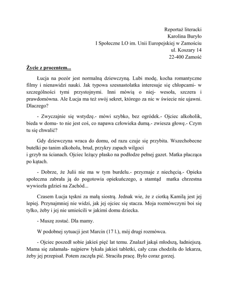 Reportaż literacki Karolina Buryło I Społeczne LO im. Unii Europejskiej w Zamościu ul. Koszary 14 22-400 Zamość Życie z procentem... Łucja na pozór jest normalną dziewczyną. Lubi modę, kocha romantyczne filmy i nienawidzi nauki. Jak typowa szesnastolatka interesuje się chłopcami- w szczególności tymi przystojnymi. Inni mówią o niej- wesoła, szczera i prawdomówna. Ale Łucja ma też swój sekret, którego za nic w świecie nie ujawni. Dlaczego? - Zwyczajnie się wstydzę.- mówi szybko, bez ogródek.- Ojciec alkoholik, bieda w domu- to nie jest coś, co napawa człowieka dumą.- zwiesza głowę.- Czym tu się chwalić? Gdy dziewczyna wraca do domu, od razu czuje się przybita. Wszechobecne butelki po tanim alkoholu, brud, przykry zapach wilgoci i grzyb na ścianach. Ojciec leżący płasko na podłodze pełnej gazet. Matka płacząca po kątach. - Dobrze, że Julii nie ma w tym burdelu.- przyznaje z niechęcią.- Opieka społeczna zabrała ją do pogotowia opiekuńczego, a stamtąd matka chrzestna wywiozła gdzieś na Zachód... Czasem Łucja tęskni za małą siostrą. Jednak wie, że z ciotką Kamilą jest jej lepiej. Przynajmniej nie widzi, jak jej ojciec się stacza. Moja rozmówczyni boi się tylko, żeby i jej nie umieścili w jakimś domu dziecka. - Muszę zostać. Dla mamy. W podobnej sytuacji jest Marcin (17 l.), mój drugi rozmówca. - Ojciec poszedł sobie jakieś pięć lat temu. Znalazł jakąś młodszą, ładniejszą. Mama się załamała- najpierw łykała jakieś tabletki, cały czas chodziła do lekarza, żeby jej przepisał. Potem zaczęła pić. Straciła pracę. Było coraz gorzej. Matki Marcina nie było całymi dniami. Przyłączyła się do grupy miejscowych pijaczków. Zaprasza ich na imprezy do domu. Chłopak nie mógł się uczyć, spać. Przyznaje, że w jego miejscowości większość ludzi ma problem z alkoholem. - Już niejeden przez to poszedł do piachu.- stwierdza gorzko.- Wiem, że moja matka źle robi. Ale nie chcę jej zostawiać. Ona sobie beze mnie nie poradzi.mówi. Takich nastolatków jak Łucja i Marcin jest, niestety, coraz więcej. Z danych Państwowej Agencji Rozwiązywania Problemów Alkoholowych wynika, że około 4% dzieci i młodzieży wychowuje się w rodzinach z problemem alkoholowym. Coraz więcej ludzi sięga do kieliszka i są to osoby młode oraz kobiety. Od 5 do 7% społeczeństwa polskiego stanowią osoby pijące szkodliwie, a około 2 mln osób padło ofiarą przemocy domowej spowodowanej alkoholem! Co na to moi rozmówcy? - Fakt, ojciec bije i matkę, i mnie. Wyzywa nas od dziwek, szmat i nierobów.- stwierdza Łucja z kamienną twarzą. Na moje pytanie, czy próbowała coś z tym zrobić, wzrusza ramionami.- Była u nas opieka społeczna, czasem przyjeżdża policja. Byli też jacyś ludzie zajmujący się leczeniem uzależnień. Zabrali ojca, ale on uciekł z zakładu i koszmar zaczął się na nowo. Łucja, gdy skończyła gimnazjum, złożyła papiery do szkoły w innym mieście. Nie chciała, by ktoś wiedział, jakiego ma ojca. Pragnęła wystartować z czystą kartą. A Marcin? - Chodzę do technikum mechanicznego. Nie zapraszam nikogo do siebie, bo po co? Mają oglądać moją matkę jak chodzi pijana? Gdy byłem w gimnazjum, połowę mojej klasy stanowili ludzie z rodzin pijaków. Kaśka czasem przychodziła do szkoły z podbitym okiem, a u Antka pili wszyscy- ojciec, matka i najstarszy brat. Agata wyprowadziła się z matką, bo nie mogły już wytrzymać tyrana- pijusa. U mnie jeszcze nie było tak źle. Dlaczego coraz więcej osób szuka pocieszenia w butelce? Jak czytamy w sprawozdaniach Agencji, sytuacja taka jest spowodowana najczęściej kryzysem ekonomicznym, który dotyka najuboższe warstwy społeczeństwa. -Wrażliwe osoby nie radzą sobie w życiu, które nierzadko przypomina wegetację. Alkohol daje pozorne poczucie panowania nad sytuacją, sprawia, że człowiek przywiązuje się do takiego uczucia. I ono właśnie go uzależnia.- mówi Beata Filar, specjalista psychoterapii uzależnień.- Taka sytuacja jest niezwykle niebezpieczna, ponieważ trudno takiego człowieka namówić do zmiany nawyków, gdy on czuje, że alkohol jest dla niego dobry. Jak moi rozmówcy radzą sobie na co dzień? Łucja mówi, że oparcie daje jej babcia. To do niej chodzi na obiad, pożycza pieniądze, odrabia lekcje. - Babcia mnie wspiera w tym wszystkim. Gdyby nie ona, dawno bym uciekła. Mówi, żebym się uczyła i wyjechała stąd gdzieś daleko.- dziewczyna uśmiecha się blado. Marcin stara się być silny. Dla mamy. W wakacje bierze jak najwięcej dorywczych prac by potem mieć za co żyć. Tegoroczne wakacje ma zamiar spędzić wraz z kuzynem w Holandii, na budowie. - Czasem, gdy mama jest trzeźwa, mówi, że niszczy mi życie. Każe mi wyjechać do dziadków, na Śląsk. Chce, żebym nie powtórzył jej błędów. A potem znowu pije...- chłopak stwierdza ze smutkiem w głosie. Co z przyszłością? - Patrzę w nią z nadzieją, że pewnego dnia uwolnię się od pijanego ojca, zabiorę mamę i wyjedziemy stąd daleko. Założę szczęśliwą rodzinę, gdzie nie będzie ani kropli alkoholu. Nie chcę zgotować własnym dzieciom takiego piekła, jakie mój ojciec mi zafundował.- mówi Łucja- Może i brzmi to naiwnie, ale wiem, że może się spełnić.- dodaje. Plany Marcina nie różnią się od marzeń Łucji. - Wierzę, że któregoś dnia będę w stanie wyciągnąć mamę z objęć procentów. Postaram się być szczęśliwym człowiekiem, na przekór tym, którzy twierdzą, że z dzieci alkoholików wyrastają nowi uzależnieni. Życie z procentem to taka zwyczajna szkoła przetrwania. Gdy już z niej wyjdziesz, jesteś zahartowany, wiesz jakich błędów nie powtarzać. Pokazujesz tym, co już w ciebie zwątpili, że jesteś coś wart. I oto w tym chodzi.- dodaje z uśmiechem. Imiona bohaterów, na ich prośbę, zostały zmienione. Dane pochodzą ze strony www.parpa.pl