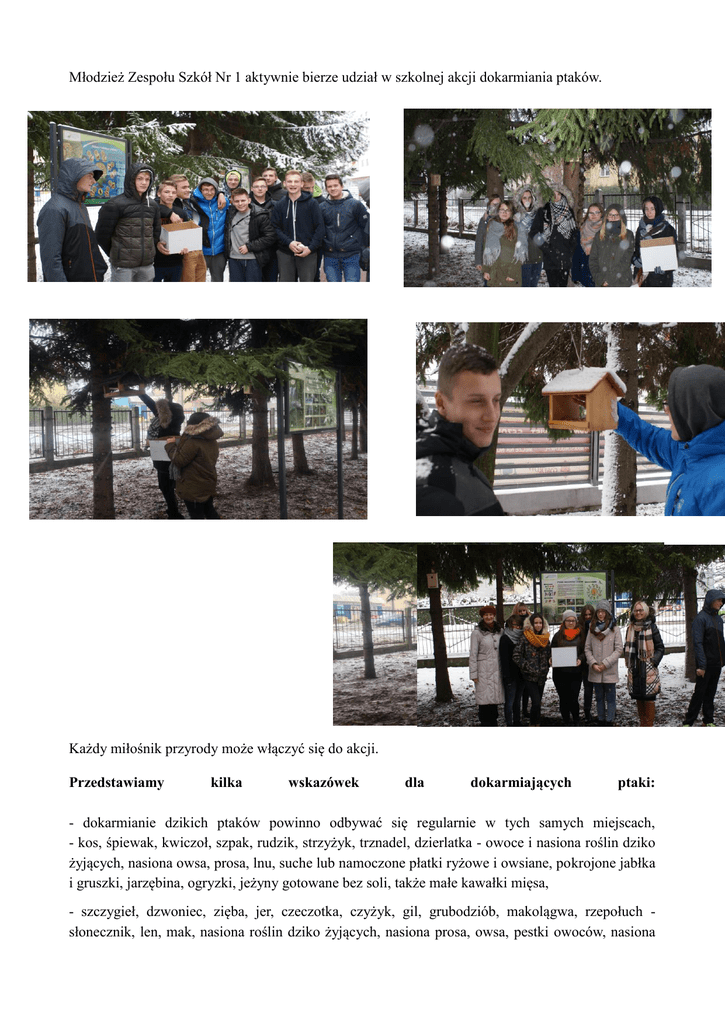 Młodzież Zespołu Szkół Nr 1 aktywnie bierze udział w szkolnej akcji dokarmiania ptaków. Każdy miłośnik przyrody może włączyć się do akcji. Przedstawiamy kilka wskazówek dla dokarmiających ptaki: - dokarmianie dzikich ptaków powinno odbywać się regularnie w tych samych miejscach, - kos, śpiewak, kwiczoł, szpak, rudzik, strzyżyk, trznadel, dzierlatka - owoce i nasiona roślin dziko żyjących, nasiona owsa, prosa, lnu, suche lub namoczone płatki ryżowe i owsiane, pokrojone jabłka i gruszki, jarzębina, ogryzki, jeżyny gotowane bez soli, także małe kawałki mięsa, - szczygieł, dzwoniec, zięba, jer, czeczotka, czyżyk, gil, grubodziób, makolągwa, rzepołuch słonecznik, len, mak, nasiona roślin dziko żyjących, nasiona prosa, owsa, pestki owoców, nasiona sałaty siewnej, kapusty polnej, rzepy, rozdrobnione nasiona dyni, - sikora, kowalik, dzięcioł – mieszanka tłuszczowa z nasionami oleistymi: łój (nie należy używać margaryny i tłuszczów technicznych), nasiona oleiste – słonecznik rzepik, len, mak, rozdrobnione pestki dyni i ogórka, kukurydza, pszenica oraz nasiona drzew iglastych dla sikor leśnych