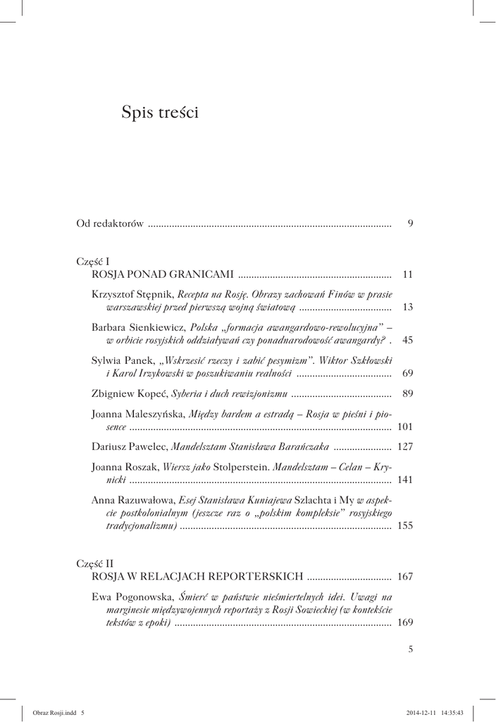 Spis treści Od redaktorów ............................................................................................ 9 Część I ROSJA PONAD GRANICAMI .......................................................... 11 Krzysztof Stępnik, Recepta na Rosję. Obrazy zachowań Finów w prasie warszawskiej przed pierwszą wojną światową ................................... 13 Barbara Sienkiewicz, Polska „formacja awangardowo-rewolucyjna” – w orbicie rosyjskich oddziaływań czy ponadnarodowość awangardy? . 45 Sylwia Panek, „Wskrzesić rzeczy i zabić pesymizm”. Wiktor Szkłowski i Karol Irzykowski w poszukiwaniu realności .................................... 69 Zbigniew Kopeć, Syberia i duch rewizjonizmu ...................................... 89 Joanna Maleszyńska, Między bardem a estradą – Rosja w pieśni i piosence ................................................................................................... 101 Dariusz Pawelec, Mandelsztam Stanisława Barańczaka ...................... 127 Joanna Roszak, Wiersz jako Stolperstein. Mandelsztam – Celan – Krynicki ................................................................................................... 141 Anna Razuwałowa, Esej Stanisława Kuniajewa Szlachta i My w aspekcie postkolonialnym (jeszcze raz o „polskim kompleksie” rosyjskiego tradycjonalizmu) ................................................................................ 155 Część II ROSJA W RELACJACH REPORTERSKICH ................................ 167 Ewa Pogonowska, Śmierć w państwie nieśmiertelnych idei. Uwagi na marginesie międzywojennych reportaży z Rosji Sowieckiej (w kontekście tekstów z epoki) .................................................................................. 169 5 Obraz Rosji.indd 5 2014-12-11 14:35:43 Spis treści Agata Zawiszewska, ZSRR w oczach kobiety. Na przykładzie relacji z podróży do Rosji opublikowanych w języku polskim w latach trzydziestych XX wieku ............................................................................. 197 Amelia Serraller, Odbiór Imperium Kapuścińskiego w Rosji ................. 241 Zygmunt Ziątek, „Rosyjskość” i „Radzieckość” w polskim reportażu z Rosji ............................................................................................... 251 Część III MARZENIE CZY PRZEKLEŃSTWO. ROSJA W OCZACH ŻYDÓW (NIE TYLKO) POLSKICH ............................................... 275 Stanisław Jakóbczyk, Rosjanie na bulwarze (dramaty Alfreda Savoir) ... 277 Dariusz Konrad Sikorski, Rosja Szaloma Asza (trylogia Przed potopem: Petersburg, Moskwa, Warszawa) .......................................... 287 Sławomir Jacek Żurek, Dwa oblicza. Arnolda Słuckiego biograficzne i poetyckie doświadczanie Rosji ............................................................ 311 Monika Szabłowska-Zaremba, Newa wiecznie nowa – obrazy Związku Radzieckiego w twórczości Stanisława Wygodzkiego ...................... 325 Monika Brzóstowicz-Klajn, Modernizowanie epiki w prozie Wasilija Grossmana ......................................................................................... 347 Część IV ROSJA I ROSJANIE. OD BRZOZOWSKIEGO DO MIŁOSZA .. 363 Elżbieta Mikiciuk, Tematyka rosyjska w powieści Stanisława Brzozowskiego Sam wśród ludzi ..................................................................... 365 Tadeusz Sucharski, Rosja w emigracyjnych wspomnieniach ostatniego pokolenia polskich ziemian „Północno-Zachodniego Kraju” Imperium Romanowów ...................................................................................... 387 Marta Skwara, Witkacy a Rosja – białe i czerwone plamy ....................... 425 Wiesław Ratajczak, Po stronie Rosjanina. Mackiewicz o starej Rosji i nowych Sowietach ................................................................................... 449 Ryszard K. Przybylski, Oblicza Rosji (bolszewickiej) ............................. 459 Jan Galant, Październikowe czytanie Dostojewskiego. Epizod z dziejów recepcji ............................................................................................... 469 6 Obraz Rosji.indd 6 2014-12-11 14:35:43 Spis treści Danuta Opacka-Walasek, Uobecnienia Rosji i Rosjan w poezji Zbigniewa Herberta ....................................................................................... 481 Agnieszka Czyżak, „Dla Rosjan literatura jest najważniejsza”. Eustachego Rylskiego rozliczenia z przeszłością ........................................... 499 Leszek Szaruga, Nieobjęta Rosja ........................................................... 511 Jerzy Fiećko, Miłosz czyta Rosję – tropem Mickiewicza? ........................ 521 Indeks .......................................................................................................... 543 Obraz Rosji.indd 7 2014-12-11 14:35:43