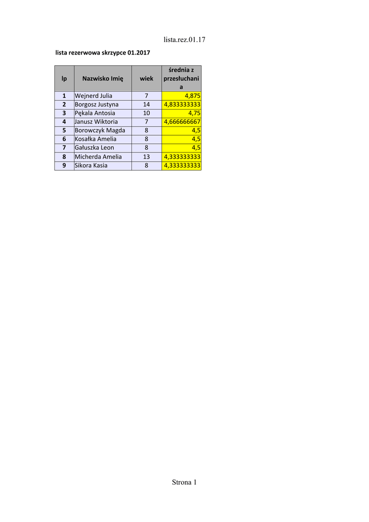lista.rez.01.17 lista rezerwowa skrzypce 01.2017 lp Nazwisko Imię 1 2 3 4 5 6 7 8 9 Wejnerd Julia Borgosz Justyna Pękala Antosia Janusz Wiktoria Borowczyk Magda Kosałka Amelia Gałuszka Leon Micherda Amelia Sikora Kasia wiek 7 14 10 7 8 8 8 13 8 średnia z przesłuchani a 4,875 4,833333333 4,75 4,666666667 4,5 4,5 4,5 4,333333333 4,333333333 Strona 1