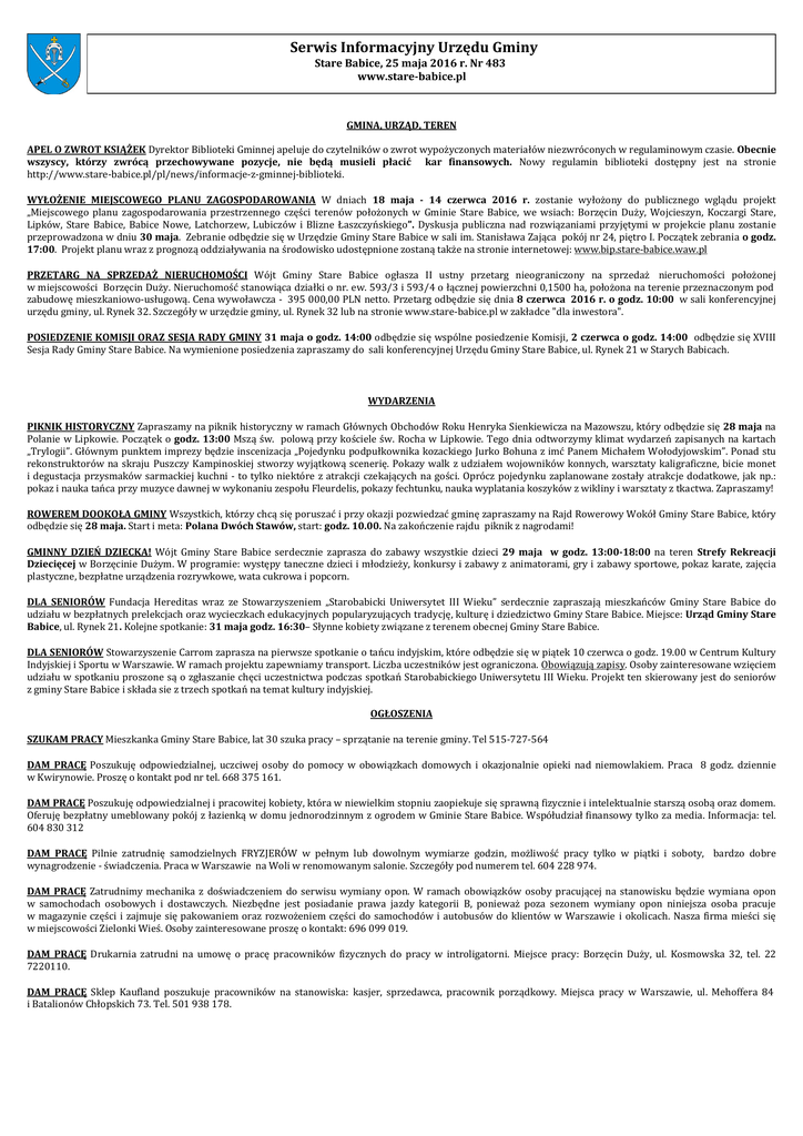 Serwis Informacyjny Urzędu Gminy Stare Babice, 25 maja 2016 r. Nr 483 www.stare-babice.pl GMINA, URZĄD, TEREN APEL O ZWROT KSIĄŻEK Dyrektor Biblioteki Gminnej apeluje do czytelników o zwrot wypożyczonych materiałów niezwróconych w regulaminowym czasie. Obecnie wszyscy, którzy zwrócą przechowywane pozycje, nie będą musieli płacić kar finansowych. Nowy regulamin biblioteki dostępny jest na stronie http://www.stare-babice.pl/pl/news/informacje-z-gminnej-biblioteki. WYŁOŻENIE MIEJSCOWEGO PLANU ZAGOSPODAROWANIA W dniach 18 maja - 14 czerwca 2016 r. zostanie wyłożony do publicznego wglądu projekt „Miejscowego planu zagospodarowania przestrzennego części terenów położonych w Gminie Stare Babice, we wsiach: Borzęcin Duży, Wojcieszyn, Koczargi Stare, Lipków, Stare Babice, Babice Nowe, Latchorzew, Lubiczów i Blizne Łaszczyńskiego”. Dyskusja publiczna nad rozwiązaniami przyjętymi w projekcie planu zostanie przeprowadzona w dniu 30 maja. Zebranie odbędzie się w Urzędzie Gminy Stare Babice w sali im. Stanisława Zająca pokój nr 24, piętro I. Początek zebrania o godz. 17:00. Projekt planu wraz z prognozą oddziaływania na środowisko udostępnione zostaną także na stronie internetowej: www.bip.stare-babice.waw.pl PRZETARG NA SPRZEDAŻ NIERUCHOMOŚCI Wójt Gminy Stare Babice ogłasza II ustny przetarg nieograniczony na sprzedaż nieruchomości położonej w miejscowości Borzęcin Duży. Nieruchomość stanowiąca działki o nr. ew. 593/3 i 593/4 o łącznej powierzchni 0,1500 ha, położona na terenie przeznaczonym pod zabudowę mieszkaniowo-usługową. Cena wywoławcza - 395 000,00 PLN netto. Przetarg odbędzie się dnia 8 czerwca 2016 r. o godz. 10:00 w sali konferencyjnej urzędu gminy, ul. Rynek 32. Szczegóły w urzędzie gminy, ul. Rynek 32 lub na stronie www.stare-babice.pl w zakładce "dla inwestora". POSIEDZENIE KOMISJI ORAZ SESJA RADY GMINY 31 maja o godz. 14:00 odbędzie się wspólne posiedzenie Komisji, 2 czerwca o godz. 14:00 odbędzie się XVIII Sesja Rady Gminy Stare Babice. Na wymienione posiedzenia zapraszamy do sali konferencyjnej Urzędu Gminy Stare Babice, ul. Rynek 21 w Starych Babicach. WYDARZENIA PIKNIK HISTORYCZNY Zapraszamy na piknik historyczny w ramach Głównych Obchodów Roku Henryka Sienkiewicza na Mazowszu, który odbędzie się 28 maja na Polanie w Lipkowie. Początek o godz. 13:00 Mszą św. polową przy kościele św. Rocha w Lipkowie. Tego dnia odtworzymy klimat wydarzeń zapisanych na kartach „Trylogii”. Głównym punktem imprezy będzie inscenizacja „Pojedynku podpułkownika kozackiego Jurko Bohuna z imć Panem Michałem Wołodyjowskim”. Ponad stu rekonstruktorów na skraju Puszczy Kampinoskiej stworzy wyjątkową scenerię. Pokazy walk z udziałem wojowników konnych, warsztaty kaligraficzne, bicie monet i degustacja przysmaków sarmackiej kuchni - to tylko niektóre z atrakcji czekających na gości. Oprócz pojedynku zaplanowane zostały atrakcje dodatkowe, jak np.: pokaz i nauka tańca przy muzyce dawnej w wykonaniu zespołu Fleurdelis, pokazy fechtunku, nauka wyplatania koszyków z wikliny i warsztaty z tkactwa. Zapraszamy! ROWEREM DOOKOŁA GMINY Wszystkich, którzy chcą się poruszać i przy okazji pozwiedzać gminę zapraszamy na Rajd Rowerowy Wokół Gminy Stare Babice, który odbędzie się 28 maja. Start i meta: Polana Dwóch Stawów, start: godz. 10.00. Na zakończenie rajdu piknik z nagrodami! GMINNY DZIEŃ DZIECKA! Wójt Gminy Stare Babice serdecznie zaprasza do zabawy wszystkie dzieci 29 maja w godz. 13:00-18:00 na teren Strefy Rekreacji Dziecięcej w Borzęcinie Dużym. W programie: występy taneczne dzieci i młodzieży, konkursy i zabawy z animatorami, gry i zabawy sportowe, pokaz karate, zajęcia plastyczne, bezpłatne urządzenia rozrywkowe, wata cukrowa i popcorn. DLA SENIORÓW Fundacja Hereditas wraz ze Stowarzyszeniem „Starobabicki Uniwersytet III Wieku” serdecznie zapraszają mieszkańców Gminy Stare Babice do udziału w bezpłatnych prelekcjach oraz wycieczkach edukacyjnych popularyzujących tradycję, kulturę i dziedzictwo Gminy Stare Babice. Miejsce: Urząd Gminy Stare Babice, ul. Rynek 21. Kolejne spotkanie: 31 maja godz. 16:30– Słynne kobiety związane z terenem obecnej Gminy Stare Babice. DLA SENIORÓW Stowarzyszenie Carrom zaprasza na pierwsze spotkanie o tańcu indyjskim, które odbędzie się w piątek 10 czerwca o godz. 19.00 w Centrum Kultury Indyjskiej i Sportu w Warszawie. W ramach projektu zapewniamy transport. Liczba uczestników jest ograniczona. Obowiązują zapisy. Osoby zainteresowane wzięciem udziału w spotkaniu proszone są o zgłaszanie chęci uczestnictwa podczas spotkań Starobabickiego Uniwersytetu III Wieku. Projekt ten skierowany jest do seniorów z gminy Stare Babice i składa sie z trzech spotkań na temat kultury indyjskiej. OGŁOSZENIA SZUKAM PRACY Mieszkanka Gminy Stare Babice, lat 30 szuka pracy – sprzątanie na terenie gminy. Tel 515-727-564 DAM PRACĘ Poszukuję odpowiedzialnej, uczciwej osoby do pomocy w obowiązkach domowych i okazjonalnie opieki nad niemowlakiem. Praca 8 godz. dziennie w Kwirynowie. Proszę o kontakt pod nr tel. 668 375 161. DAM PRACĘ Poszukuję odpowiedzialnej i pracowitej kobiety, która w niewielkim stopniu zaopiekuje się sprawną fizycznie i intelektualnie starszą osobą oraz domem. Oferuję bezpłatny umeblowany pokój z łazienką w domu jednorodzinnym z ogrodem w Gminie Stare Babice. Współudział finansowy tylko za media. Informacja: tel. 604 830 312 DAM PRACĘ Pilnie zatrudnię samodzielnych FRYZJERÓW w pełnym lub dowolnym wymiarze godzin, możliwość pracy tylko w piątki i soboty, bardzo dobre wynagrodzenie - świadczenia. Praca w Warszawie na Woli w renomowanym salonie. Szczegóły pod numerem tel. 604 228 974. DAM PRACĘ Zatrudnimy mechanika z doświadczeniem do serwisu wymiany opon. W ramach obowiązków osoby pracującej na stanowisku będzie wymiana opon w samochodach osobowych i dostawczych. Ni