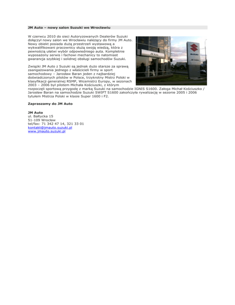 JM Auto – nowy salon Suzuki we Wrocławiu W czerwcu 2010 do sieci Autoryzowanych Dealerów Suzuki dołączył nowy salon we Wrocławiu należący do firmy JM Auto. Nowy obiekt posiada dużą przestrzeń wystawową a wykwalifikowani pracownicy służą swoją wiedzą, która z pewnością ułatwi wybór odpowiedniego auta. Kompletnie wyposażony serwis i fachowi mechanicy to natomiast gwarancja szybkiej i solidnej obsługi samochodów Suzuki. Związki JM Auto z Suzuki są jednak dużo starsze za sprawą zaangażowania jednego z właścicieli firmy w sport samochodowy – Jarosław Baran jeden z najbardziej doświadczonych pilotów w Polsce, trzykrotny Mistrz Polski w klasyfikacji generalnej RSMP, Wicemistrz Europy, w sezonach 2003 – 2006 był pilotem Michała Kościuszki, z którym rozpoczęli sportową przygodę z marką Suzuki na samochodzie IGNIS S1600. Załoga Michał Kościuszko / Jarosław Baran na samochodzie Suzuki SWIFT S1600 zakończyła rywalizację w sezonie 2005 i 2006 tytułem Mistrza Polski w klasie Super 1600 i F2. Zapraszamy do JM Auto JM Auto ul. Bałtycka 15 51-109 Wrocław tel/fax: 71 342 47 14, 321 33 01 [email protected] www.jmauto.suzuki.pl