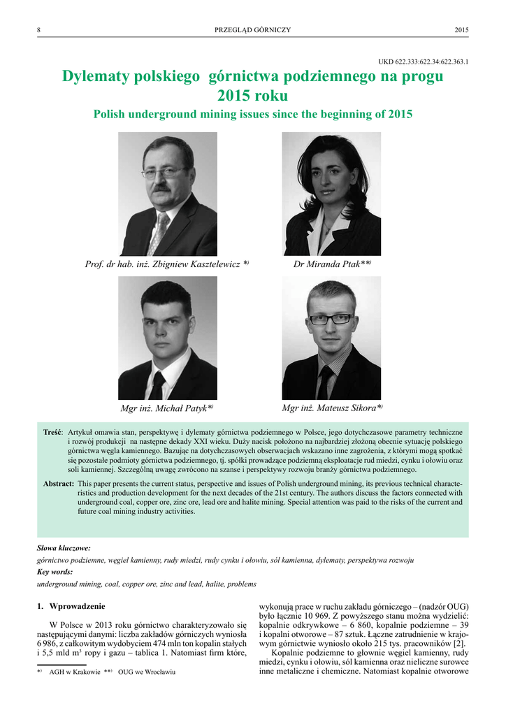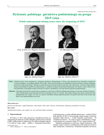 8 PRZEGLĄD GÓRNICZY 2015 UKD 622.333:622.34:622.363.1 Dylematy polskiego górnictwa podziemnego na progu 2015 roku Polish underground mining issues since the beginning of 2015 Prof. dr hab. inż. Zbigniew Kasztelewicz *) Dr Miranda Ptak**) Mgr inż. Michał Patyk*) Mgr inż. Mateusz Sikora*) Treść: Artykuł omawia stan, perspektywę i dylematy górnictwa podziemnego w Polsce, jego dotychczasowe parametry techniczne i rozwój produkcji na następne dekady XXI wieku. Duży nacisk położono na najbardziej złożoną obecnie sytuację polskiego górnictwa węgla kamiennego. Bazując na dotychczasowych obserwacjach wskazano inne zagrożenia, z którymi mogą spotkać się pozostałe podmioty górnictwa podziemnego, tj. spółki prowadzące podziemną eksploatacje rud miedzi, cynku i ołowiu oraz soli kamiennej. Szczególną uwagę zwrócono na szanse i perspektywy rozwoju branży górnictwa podziemnego. Abstract: This paper presents the current status, perspective and issues of Polish underground mining, its previous technical characteristics and production development for the next decades of the 21st century. The authors discuss the factors connected with underground coal, copper ore, zinc ore, lead ore and halite mining. Special attention was paid to the risks of the current and future coal mining industry activities. Słowa kluczowe: górnictwo podziemne, węgiel kamienny, rudy miedzi, rudy cynku i ołowiu, sól kamienna, dylematy, perspektywa rozwoju Key words: underground mining, coal, copper ore, zinc and lead, halite, problems 1. Wprowadzenie W Polsce w 2013 roku górnictwo charakteryzowało się następującymi danymi: liczba zakładów górniczych wyniosła 6 986, z całkowitym wydobyciem 474 mln ton kopalin stałych i 5,5 mld m3 ropy i gazu – tablica 1. Natomiast firm które, *) AGH w Krakowie **) OUG we Wrocławiu wykonują prace w ruchu zakładu górniczego – (nadzór OUG) było łącznie 10 969. Z powyższego stanu można wydzielić: kopalnie odkrywkowe – 6 860, kopalnie podziemne – 39 i kopalni otworowe – 87 sztuk. Łączne zatrudnienie w krajowym górnictwie wyniosło około 215 tys. pracowników [2]. Kopalnie podziemne to głownie węgiel kamienny, rudy miedzi, cynku i ołowiu, sól kamienna oraz nieliczne surowce inne metaliczne i chemiczne. Natomiast kopalnie otworowe Nr 4 PRZEGLĄD GÓRNICZY 9 Tablica 1. Liczba zakładów górniczych w Polsce na koniec 2013r. [Opracowanie własne] Table 1. Number of mining plants in Poland at the end of 2013 [own elaboration] Zakłady górnicze Zatrudnienie Wydobycie w 2013r. (stan na 31.12.2013r.) (stan na 31.12.2013r.) mln ton liczba osób Odkrywkowe zakłady górnicze 6 860 357,43 29 392 Objęte własnością górniczą 16 66,14 10 487 Objęte prawem własności nieruchomości gruntowej 6 844 291,27 18 905 Podziemne zakłady górnicze 39 110,79 117 931 Otworowe zakłady górnicze 2 631 87 5,025 mln ton + 5,488 mld m3 Razem zakłady górnicze 151 849 6 986 473,24 mln ton + 5,488 mld m3 Oddziały – zakłady wykonujące prace geologiczne 189 5 020 Firmy wykonujące prace w ruchu zakładu 3 786 58 115 górniczego – nadzór OUG 3 Ogółem 214 984 10 969 473,24 mln ton + 5,488 mld m Wyszczególnienie/ kopalny wydobywają ropę naftowa, gaz ziemny, siarkę oraz solanki, wody lecznicze i termalne. W tablicy 1 przedstawiono zbiorcze zestawienie zakładów górniczych w Polsce na koniec 2013roku. 2.Kopalnie podziemne Górnictwo podziemne w Polsce to głównie kopalnie węgla kamiennego, rudy miedzi, cynku i ołowiu, soli kamiennej oraz nielicznych surowców metalicznych i chemicznych. Wydobycie na koniec roku 2013 przedstawiono w tablicy 2. Tablica 2. Wydobycie w kopalniach podziemnych w Polsce na koniec 2013 r. [Opracowanie własne] Table 2. Production in underground mines in Poland at the end of 2013 [own elaboration] Kopalnie podziemne Węgiel kamienny Rudy miedzi Rudy cynku i ołowiu Sól kamienna Pozostałe kopaliny Ogółem Wydobycie mln ton 76,50 30,65 2,33 0,76 0,55 110,79 2.1. Węgiel kamienny Polska jest największym producentem i rynkiem zbytu dla węgla kamiennego spośród krajów Unii Europejskiej. W Europie poza Polską jedynie Turcja ma tak wysoki udział węgla w bilansie energetycznym. W roku 2013 polskie kopalnie wyprodukowały około 76,5 mln ton węgla kamiennego, z czego 64,4 mln ton stanowił węgiel wykorzystywany w celach energetycznych a pozostałe 12,1 to węgiel do koksowania. Historycznie od roku 1945 roku do 2013 polskie kopalnie wydobyły 8,493 mld ton czarnego złota. Największe wydobycie węgla kamiennego 201 mln ton/rok było na początku lat 80. XX wieku. Od 1988 roku produkcja węgla systematycznie malała, a tym samym liczba kopalń zmalała z 70 do 30. W okresie największego wydobycia węgla kamiennego zatrudnionych było blisko 400 tys. pracowników. Obecnie (na koniec 2014 roku) pracuje około 103 tys. osób. Wydobycie i eksport węgla kamiennego w latach od roku 1945 do 2013 przedstawiono na rysunkach 1 i 2. Natomiast zmiany następujące w okresie trwania restrukturyzacji branży węgla kamiennego do obecnego okresu pokazano na rysunku 3 [3, 5]. Zmiany zachodzące w zakresie eksportu i importu węgla kamiennego pokazano na rysunku 4. Nasz kraj ze znaczącego eksportera węgla (z ilości ponad 30 mln ton/ rok) zszedł do wielkości 5 mln w 2011 roku, a jednocześnie zaimportował w tym roku 15 mln ton. Stan ten za 2013 rok wygląda na remis: 10 mln ton eksport i 10 mln ton import węgla kamiennego. 2.1.1.Stan obecny Udokumentowane zasoby bilansowe złóż węgla kamiennego wg stanu na 31.12.2013 r. wynoszą 51 414 mln ton. W tym zasobów bilansowych rozpoznanych szczegółowo (w kategoriach A, B, C1) jest 21 186,74 mln ton – co stanowi 41,2 % łącznej sumy udokumentowanych zasobów bilansowych. Natomiast stan zasobów przemysłowych ustalonych w projektach zagospodarowania złóż wynosi 3 839,63 mln ton [8]. W Polsce eksploatacja prowadzona jest obecnie w dwóch zagłębiach węgla 