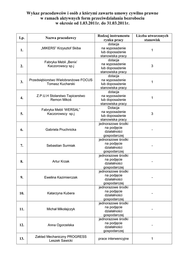 Wykaz pracodawców i osób, z którymi zawarto umowy
