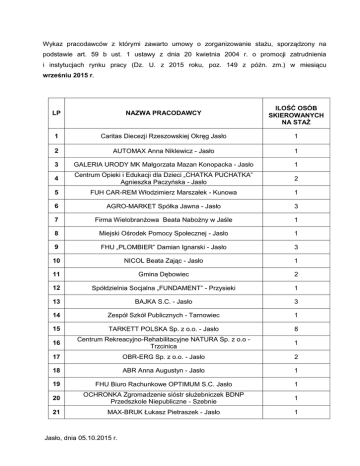 Wykaz pracodawców z którymi zawarto umowy o zorganizowanie stażu, sporządzony na podstawie art. 59 b ust. 1 ustawy z dnia 20 kwietnia 2004 r. o promocji zatrudnienia i instytucjach rynku pracy (Dz. U. z 2015 roku, poz. 149 z późn. zm.) w miesiącu wrześniu 2015 r. LP NAZWA PRACODAWCY ILOŚĆ OSÓB SKIEROWANYCH NA STAŻ 1 Caritas Diecezji Rzeszowskiej Okręg Jasło 1 2 AUTOMAX Anna Niklewicz - Jasło 1 3 GALERIA URODY MK Małgorzata Mazan Konopacka - Jasło 1 4 Centrum Opieki i Edukacji dla Dzieci „CHATKA PUCHATKA” Agnieszka Paczyńska - Jasło 2 5 FUH CAR-REM Włodzimierz Marszałek - Kunowa 1 6 AGRO-MARKET Spółka Jawna - Jasło 3 7 Firma Wielobranżowa Beata Nabożny w Jaśle 1 8 Miejski Ośrodek Pomocy Społecznej - Jasło 1 9 FHU „PLOMBIER” Damian Ignarski - Jasło 3 10 NICOL Beata Zając - Jasło 1 11 Gmina Dębowiec 2 12 Spółdzielnia Socjalna „FUNDAMENT” - Przysieki 1 13 BAJKA S.C. - Jasło 3 14 Zespół Szkół Publicznych - Tarnowiec 1 15 TARKETT POLSKA Sp. z o.o. - Jasło 8 16 Centrum Rekreacyjno-Rehabilitacyjne NATURA Sp. z o.o Trzcinica 1 17 OBR-ERG Sp. z o.o. - Jasło 2 18 ABR Anna Augustyn - Jasło 1 19 FHU Biuro Rachunkowe OPTIMUM S.C. Jasło 1 20 OCHRONKA Zgromadzenie sióstr służebniczek BDNP Przedszkole Niepubliczne - Szebnie 1 21 MAX-BRUK Łukasz Pietraszek - Jasło 1 Jasło, dnia 05.10.2015 r.