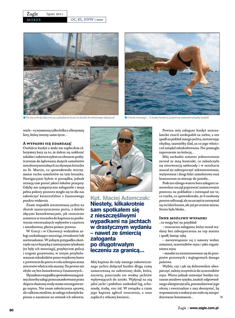 Żagle MORZE lipiec 2011 OC, KL, NNW i inne n Da się uniknąć płacenia za uszkodzenie burty na skutek źle włożonego odbijacza! n Chwila nieuwagi i... A koszty leczenia za granicą nadszarpną każdy budżet! wiele – tu wymienię tylko kilka z olbrzymiej listy, którą tworzy samo życie... A wypadki się zdarzają! Osobiście kiedyś o mało nie zapłaciłem olbrzymiej kary za to, że dałem się nakłonić załodze i zakotwiczyłem na obszarze podejściowym do lądowania dużych samolotów interkontynentalnych na słynnym lotnisku na St. Martin, co spowodowało wstrzymanie ruchu samolotów na tym lotnisku. Nawigacyjnie byłem w porządku, jednak istnieją tam ponoć jakieś lokalne przepisy. Gdyby nie sympatyczne załogantki i moja pełna pokory postawa mogło się to dla nas zakończyć katastrofalnie z finansowego punktu widzenia. Znam wypadek aresztowania jachtu na skutek zanieczyszczenia portu, z daleko idącymi konsekwencjami, jak roszczenie armatora w stosunku do kapitana za pozbawienie ewentualnych wpływów z czarteru i nieodzowna, płatna pomoc prawna. W Grecji i w Chorwacji widziałem załogi uszkadzające mooringi, świadomie lub nieświadomie. W jednym przypadku skończyło się to bijatyką z tamtejszymi rybakami (to były ich mooringi), przybyciem policji i srogimi grzywnami, w innym przyholowaniem szkodników przez wojskowy kuter z powrotem do portu w celu zabezpieczenia interesów właściciela mariny. Na pewno nie obyło się bez konsekwencji finansowych... Słyszałem o wypadku spowodowania groźnej choroby załogi przez zatankowanie przez skipera skażonej wody mimo ostrzegawczego napisu. Nie znam zakończenia sprawy, ale całkiem możliwe, że załoga oskarżyła kapitana o narażenie na szwank ich zdrowia. 80 Kpt. Maciej Adamczak: Niestety, kilkakrotnie sam spotkałem się z nieszczęśliwymi wypadkami na jachtach w drastycznym wydaniu – nawet ze śmiercią załoganta po długotrwałym leczeniu za granicą... Mój kapitan do rufy naszego zakotwiczonego jachtu dołączył bardzo długą cumę zamocowaną na nabrzeżnej skale, która, niestety, przecinała tor wodny jachtów wpływających do zatoki. Wpłynął na nią jakiś jacht i podobno uszkodził log, echosondę, śrubę, ster itd. W związku z czym jego kapitan zgłosił roszczenia, a nasz zapłacił z własnej kieszeni... Pewien mój załogant kiedyś nonszalancko rzucił niedopałek za siebie, a ten spadł na pokład innego jachtu, zostawiając ohydny, szarożółty ślad, za co jego właściciel zażądał odszkodowania. Nie pomogło zaproszenie na kolację... Mój zachodni armator jednostronnie zerwał ze mną kontrakt, co zakończyło się interwencją ambasady i w rezultacie musiał mi zabezpieczyć zakwaterowanie, wyżywienie i drogi bilet samolotowy oraz honorarium za miesiąc do przodu... Podczas silnego wiatru bora załogant samowolnie zaczął poprawiać zamocowanie pontonu na pokładzie i rozwiązał nie to, co trzeba, co spowodowało, że 6-osobowy ponton odfrunął, ale na szczęście zatrzymał się na falochronie, ale już po stronie morza. Strata była bliska... Inne możliwe wypadki ...to mogą być na przykład: – roszczenia załoganta, który został wysłany bez zabezpieczenia na top masztu i spadł, łamiąc rękę. – niewywiązanie się z umowy wobec armatora, uczestników rejsu i jako organizatora rejsu. – mandat za niezastosowanie się do przepisów portowych i żeglugowych danego państwa. Wybór, czy i jak się dobrowolnie ubezpieczyć, należy oczywiście do uczestników rejsu. Warto jednak rozważyć bardzo starannie możliwe ryzyko, znaleźć odpowiedniego ubezpieczyciela, przeanalizować jego ofertę i ewentualnie z niej skorzystać, by wspomnienie z wakacji nie stało się niespodziewanie koszmarem... Żagle | www.zagle.com.pl