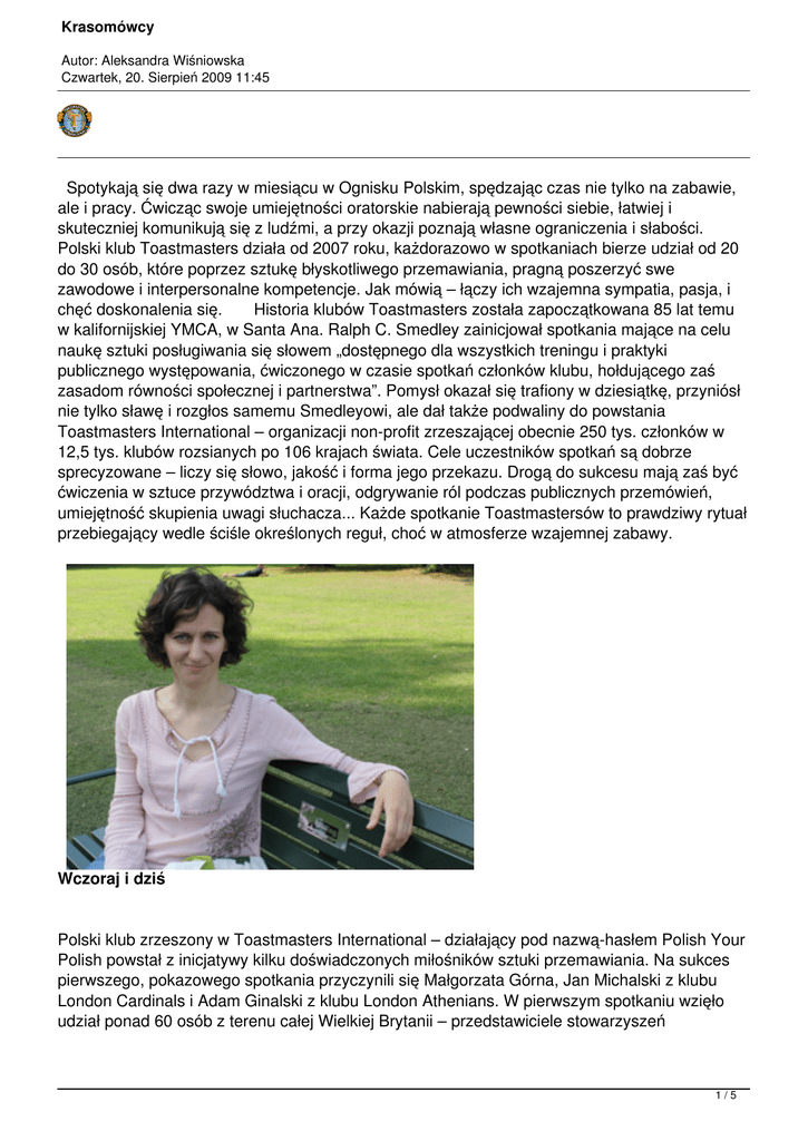 Krasomówcy Autor: Aleksandra Wiśniowska Czwartek, 20. Sierpień 2009 11:45 Spotykają się dwa razy w miesiącu w Ognisku Polskim, spędzając czas nie tylko na zabawie, ale i pracy. Ćwicząc swoje umiejętności oratorskie nabierają pewności siebie, łatwiej i skuteczniej komunikują się z ludźmi, a przy okazji poznają własne ograniczenia i słabości. Polski klub Toastmasters działa od 2007 roku, każdorazowo w spotkaniach bierze udział od 20 do 30 osób, które poprzez sztukę błyskotliwego przemawiania, pragną poszerzyć swe zawodowe i interpersonalne kompetencje. Jak mówią – łączy ich wzajemna sympatia, pasja, i chęć doskonalenia się. Historia klubów Toastmasters została zapoczątkowana 85 lat temu w kalifornijskiej YMCA, w Santa Ana. Ralph C. Smedley zainicjował spotkania mające na celu naukę sztuki posługiwania się słowem „dostępnego dla wszystkich treningu i praktyki publicznego występowania, ćwiczonego w czasie spotkań członków klubu, hołdującego zaś zasadom równości społecznej i partnerstwa”. Pomysł okazał się trafiony w dziesiątkę, przyniósł nie tylko sławę i rozgłos samemu Smedleyowi, ale dał także podwaliny do powstania Toastmasters International – organizacji non-profit zrzeszającej obecnie 250 tys. członków w 12,5 tys. klubów rozsianych po 106 krajach świata. Cele uczestników spotkań są dobrze sprecyzowane – liczy się słowo, jakość i forma jego przekazu. Drogą do sukcesu mają zaś być ćwiczenia w sztuce przywództwa i oracji, odgrywanie ról podczas publicznych przemówień, umiejętność skupienia uwagi słuchacza... Każde spotkanie Toastmastersów to prawdziwy rytuał przebiegający wedle ściśle określonych reguł, choć w atmosferze wzajemnej zabawy. Wczoraj i dziś Polski klub zrzeszony w Toastmasters International – działający pod nazwą-hasłem Polish Your Polish powstał z inicjatywy kilku doświadczonych miłośników sztuki przemawiania. Na sukces pierwszego, pokazowego spotkania przyczynili się Małgorzata Górna, Jan Michalski z klubu London Cardinals i Adam Ginalski z klubu London Athenians. W pierwszym spotkaniu wzięło udział ponad 60 osób z terenu całej Wielkiej Brytanii – przedstawiciele stowarzyszeń 1/5 Krasomówcy Autor: Aleksandra Wiśniowska Czwartek, 20. Sierpień 2009 11:45 polonijnych, młodzi i powojenni emigranci, reprezentanci mediów. W realizacji projektu dopomogli i przyjaciele z siostrzanych klubów w Polsce. Dziś w ramach Polish Your Polish spotykają się przedstawiciele wielu profesji. Grupa jest zróżnicowana pokoleniowo i zawodowo, różne też powody kierowały uczestnikami przystępującymi do zajęć: – Szukałam miejsca, gdzie mogłabym wyrazić siebie. Zależało mi na ekspresji tego, co mam w sobie, potencjału, który chciałam wydobyć. Przy okazji przyciągnęła mnie oczywiście ciekawość. Już po pierwszym spotkaniu wiedziałam, że to coś dla mnie. Zapisałam się od razu. Przekonało mnie to, że uczestnicy klubu potrafią się świetnie bawić, a przy okazji uczyć, przekraczać własne granice, pokonywać słabości, doświadczać czegoś nowego i sprawdzać się w praktyce. Strona praktyczna tych spotkań podoba mi się najbardziej. To nie jest mówienie o tym, co zamierza się zrobić, tylko bezpośrednie działanie...i zabawa oczywiście! – podkreśla Monika Jaźwińska członek zarządu Polish Your Polish pełniąca w klubie funkcję Sergeant at Arms. – Dołączyłem do organizacji Toastmastres w listopadzie 1984 roku. Powodem, dla którego to zrobiłem był ślub mojego przyjaciela, na którym miałem być drużbą. Wiedziałem, że będę musiał publicznie przemawiać i to mnie ogromnie zestresowało. Postanowiłem się do tego dobrze przygotować. Zorientowałem się, gdzie działa klub Toastmasters i dołączyłem do grupy. Od tego czasu mam większą wiarę we własne możliwości, jestem pewniejszy siebie w rozmowie z innymi ludźmi. Urodziłem się leworęczny, ale rodzice przestawili mnie na praworęczność efekt był taki, że do 19 roku życia jąkałem się. Zawsze było mi trudno nawiązywać rozmowy. W polskim klubie jestem od początku jego istnienia, chciałem poprawić 2/5 Krasomówcy Autor: Aleksandra Wiśniowska Czwartek, 20. Sierpień 2009 11:45 swojąpolszczyznę, która po wielu latach posługiwania się angielskim zubożała. Z Polski wyjechałem w wieku 9 lat... Cenię sobie spotkania z młodymi pomysłowymi ludźmi, najczęściej osobami urodzonymi i wykształconymi w kraju. Jest to dla mnie bardzo inspirujące – podkreśla z zadowoleniem Adam Ginalski, współzałożyciel Polish Your Polish, który w działalność klubu zaangażował się będąc już na emeryturze. – A mnie zaprosił kolega, który już działał w Polish Your Polish i od razu zauroczyła mnie atmosfera tego miejsca oraz ludzie, którzy chcą się tam rozwijać. Słyszałem o Toastmasters jeszcze w Stanach, gdzie mieszkałem. Osobiście przyciągnął mnie do klubu fakt, że mogłem ćwiczyć język polski w sytuacji stresującej, czyli podczas wypowiedzi publicznej. Przy okazji również dużo się nauczyłem o tym, jak inni mnie odbierają, dzięki szczerej informacji zwrotnej. Mam wrażenie, że teraz nawiązuję łatwiej znajomości i mam lepszy kontakt z innymi ludźmi. To ułatwia życie – komentuje Łukasz Szyrmer, prezydent Polish Your Polish. Ekspresja myśli i opinii Spotkania w klubie Toastmastersów to wspólne ćwiczenia, przygotowanie przemów dotyczących najróżniejszej tematyki – ich kompozycji, spójności i logiki, ponadto dyskusja nad efektywnością starań przemawiającego, jego warsztatem językowym, opanowaniem nerwów i sugestywnością. Do publicznych wystąpień kandydata przygotowuje mentor, który pełni funkcję doradczą. Członkowie klubu mają dużą swobodę działań, wszystkich wiąże jednak dżentelmeńska umowa nie poruszania w wypowiedziach kwestii związanych z religią, 
