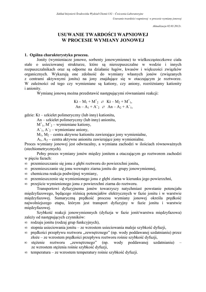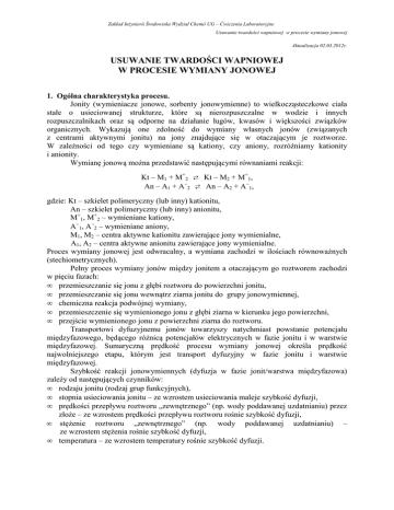 Zakład Inżynierii Środowiska Wydział Chemii UG – Ćwiczenia Laboratoryjne Usuwanie twardości wapniowej w procesie wymiany jonowej Aktualizacja 02.03.2012r. USUWANIE TWARDOŚCI WAPNIOWEJ W PROCESIE WYMIANY JONOWEJ 1. Ogólna charakterystyka procesu. Jonity (wymieniacze jonowe, sorbenty jonowymienne) to wielkocząsteczkowe ciała stałe o usieciowanej strukturze, które są nierozpuszczalne w wodzie i innych rozpuszczalnikach oraz są odporne na działanie ługów, kwasów i większości związków organicznych. Wykazują one zdolność do wymiany własnych jonów (związanych z centrami aktywnymi jonitu) na jony znajdujące się w otaczającym je roztworze. W zależności od tego czy wymieniane są kationy, czy aniony, rozróżniamy kationity i anionity. Wymianę jonową można przedstawić następującymi równaniami reakcji: Kt – M1 + M+2 An – A1 + A−2 → ← → ← Kt – M2 + M+1, An – A2 + A−1, gdzie: Kt – szkielet polimeryczny (lub inny) kationitu, An – szkielet polimeryczny (lub inny) anionitu, M+1, M+2 – wymieniane kationy, A−1, A−2 – wymieniane aniony, M1, M2 – centra aktywne kationitu zawierające jony wymienialne, A1, A2 – centra aktywne anionitu zawierające jony wymienialne. Proces wymiany jonowej jest odwracalny, a wymiana zachodzi w ilościach równoważnych (stechiometrycznych). Pełny proces wymiany jonów między jonitem a otaczającym go roztworem zachodzi w pięciu fazach: • przemieszczanie się jonu z głębi roztworu do powierzchni jonitu, • przemieszczanie się jonu wewnątrz ziarna jonitu do grupy jonowymiennej, • chemiczna reakcja podwójnej wymiany, • przemieszczenie się wymienionego jonu z głębi ziarna w kierunku jego powierzchni, • przejście wymienionego jonu z powierzchni ziarna do roztworu. Transportowi dyfuzyjnemu jonów towarzyszy natychmiast powstanie potencjału międzyfazowego, będącego różnicą potencjałów elektrycznych w fazie jonitu i w warstwie międzyfazowej. Sumaryczną prędkość procesu wymiany jonowej określa prędkość najwolniejszego etapu, którym jest transport dyfuzyjny w fazie jonitu i warstwie międzyfazowej. Szybkość reakcji jonowymiennych (dyfuzja w fazie jonit/warstwa międzyfazowa) zależy od następujących czynników: • rodzaju jonitu (rodzaj grup funkcyjnych), • stopnia usieciowania jonitu – ze wzrostem usieciowania maleje szybkość dyfuzji, • prędkości przepływu roztworu „zewnętrznego” (np. wody poddawanej uzdatnianiu) przez złoże – ze wzrostem prędkości przepływu roztworu rośnie szybkość dyfuzji, • stężenie roztworu „zewnętrznego” (np. wody poddawanej uzdatnianiu) – ze wzrostem stężenia rośnie szybkość dyfuzji, • temperatura – ze wzrostem temperatury rośnie szybkość dyfuzji. Zakład Inżynierii Środowiska Wydział Chemii UG – Ćwiczenia Laboratoryjne 2 Usuwanie twardości wapniowej w procesie wymiany jonowej 2. Właściwości jonitów 2. 1. Klasyfikacja jonitów Ogólnie jonity można sklasyfikować ze względu na: • pochodzenie i sposób ich otrzymywania, • rodzaj grup jonowymiennych (charakter grup funkcyjnych). Klasyfikację jonitów ze względu na ich pochodzenie i sposób otrzymania można przedstawić następująco: Jonity nieorganiczne organiczne naturalne naturalne półsyntetyczne syntetyczne syntetyczne Klasyfikację jonitów ze względu na rodzaj grup jonowymiennych można przedstawić następująco: Jonity kationity anionity silnie kwaśne silnie zasadowe słabo kwaśne średnio zasadowe słabo zasadowe Kationity to jonity z grupą jonowymienną (np. –SO3H). Ruchliwy jon to kation H+. Ze względu na rodzaj jonu ruchliwego kationity dzieli się na pracujące wyłącznie w cyklu sodowym (Kt–Na: np. Kt–SO3Na), wodorowym (Kt–H: np. Kt–SO3H) lub zarówno w cyklu sodowym, jak i wodorowym (Kt–Na/H, np. Kt–SO3H/Na). Kationity silnie kwaśne są mocnymi kwasami (np. Kt–SO3H) lub ich solami (np. Kt–SO3Na). Posiadają one dobrze zdysocjowane grupy funkcyjne (np. –SO3−, –CH2SO3−) zdolne do wymiany wszystkich kationów. Mogą być stosowane w roztworach w szerokim 2 Zakład Inżynierii Środowiska Wydział Chemii UG – Ćwiczenia Laboratoryjne 3 Usuwanie twardości wapniowej w procesie wymiany jonowej zakresie pH, ponieważ ich grupy jonowymienne są zdysocjowane w zakresie pH 1–14. Kationity słabo kwaśne posiadają słabo zdysocjowane grupy funkcyjne (np. –O−, –COO−, S−, –CH2S−). Są one zdolne do wymiany tylko kationów pochodzących z soli słabych kwasów i są efektywne w obojętnym lub słabo alkalicznym środowisku. Anionity to jonity z grupą jonowymienną, zawierającą ruchliwy anion. Wśród anionitów wyróżnia się główne trzy rodzaje: pracujące w cyklu wodorotlenowym (An–OH, np. An–N(CH3)2H+OH−, chlorkowym (An–Cl, np. An–N(CH3)2H+Cl−), wodorotlenowym i chlorkowym (An–OH/Cl, np. An–N(CH3)2H+OH−/Cl−). Anionity silnie zasadowe posiadają dobrze zdysocjowane grupy funkcyjne, zdolne do wymiany anionów nawet bardzo słabych kwasów, np. czwartorzędowe grupy amoniowe (– N(CH3)3+). Anionity silnie zasadowe występują w postaci zdysocjowanej w całym zakresie pH (1–14), dlatego mogą być stosowane bez względu na odczyn roztworu. Słabo zasadowe anionity zawierają słabo zdysocjowane grupy funkcyjne, np. pierwszorzędowe grupy aminowe –NH3+, drugorzędowe grupy aminowe –NR1H2+, trzeciorzędowe grupy aminowe – NR1R2H+ (R1, R2 – podstawniki alkilowe). Jonity te mogą reagować z substancjami łatwo oddającymi protony (mocne kwasy), gdyż one łatwo protonują aminę: An–N(CH3)2 + H+ + Cl− → An–N(CH3)2H+·Cl− 2. 2. Zdolność wymienna jonitu Zdolność wymienna jonitu jest głównym parametrem charakteryzującym chemiczne właściwości jonitu oraz determinuje jego przydatność w oczyszczaniu wody. Zdolność wymienna jonitu określa ilość miligramorównoważników (mgR, val lub mval) wymienianych przeciwjonów na j