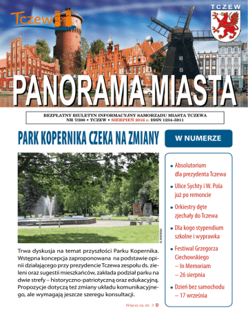 Tczew • Panorama Miasta • www.wrotatczewa.pl • www.bip.tczew.pl • Sierpień 2016 PANORAMA MIASTA BEZPŁATNY BIULETYN INFORMACYJNY SAMORZĄDU MIASTA TCZEWA NR 7/300 • TCZEW • sierpień 2016 r. ISSN 1234–5911 PARK KOPERNIKA CZEKA NA ZMIANY W NUMERZE Absolutorium dla prezydenta Tczewa Ulice Sychty i W. Pola już po remoncie Orkiestry dęte zjechały do Tczewa M. Mykowska Trwa dyskusja na temat przyszłości Parku Kopernika. Wstępna koncepcja zaproponowana na podstawie opinii działającego przy prezydencie Tczewa zespołu ds. zieleni oraz sugestii mieszkańców, zakłada podział parku na dwie strefy – historyczno-patriotyczną oraz edukacyjną. Propozycje dotyczą też zmiany układu komunikacyjnego, ale wymagają jeszcze szeregu konsultacji. Więcej na str. 3 Dla kogo stypendium szkolne i wyprawka Festiwal Grzegorza Ciechowskiego – In Memoriam – 26 sierpnia Dzień bez samochodu – 17 września • Aktualności Sierpień 2016 • Panorama Miasta • www.wrotatczewa.pl • www.bip.tczew.pl Odeszli od nas XXI SESJA Klaus Kosowski Porządek obrad XXI sesji Rady Miejskiej w Tczewie na dzień 25 sierpnia 2016 r. (czwartek) o godz. 10.00 w sali konferencyjnej im. F. Fabicha w Urzędzie Miejskim w Tczewie (ul. 30 Stycznia 1) 1 lipca Po ciężkiej chorobie, zmarł Klaus Kosowski, Tczewian Roku 2015. Klaus Kosowski był wieloletnim prezesem Rodzinnych Ogrodów Działkowych, niestrudzonym propagatorem Tczewa wśród działkowców całego kraju, zaangażowanym w organizację tczewskich dożynek działkowych oraz ubiegłorocznych Krajowych Dni Działkowca, które odbyły się w Tczewie. Za swoją działalność na rzecz naszego miasta otrzymał tytuł Tczewianina Roku 2015. Miał 72 lata. I. Część pierwsza: 1. 2. 3. 4. Otwarcie sesji i powitanie gości. Sprawdzenie obecności radnych. Przedstawienie proponowanego porządku obrad sesji. Przyjęcie protokołu z sesji Rady Miejskiej w Tczewie z 23 czerwca 2016 r. 5. Informacja z działalności Prezydenta Miasta Tczewa za sierpień 2016 r. 6. Informacja z interpelacji zgłoszonych przez radnych w okresie od 23 czerwca do 24 sierpnia 2016 r. Andrzej Grzyb II. Część druga: 5 lipca, po długiej i ciężkiej chorobie zmarł Andrzej Grzyb – senator RP, regionalista, publicysta, pisarz. Miał 64 lata. Andrzej Grzyb urodził się 7 czerwca 1952 r. Ukończył I Liceum Ogólnokształcące im. Marii Skłodowskiej-Curie w Starogardzie Gdańskim, a następnie studia z zakresu filologii polskiej na Uniwersytecie Gdańskim[. Pracował w prywatnych przedsiębiorstwach. W latach 90. sprawował urząd burmistrza Czarnej Wody. Od 1998 do 2002 pełnił funkcję starosty powiatu starogardzkiego. W latach 2002–2007 zasiadał w sejmiku pomorskim, zajmując w nim stanowisko wiceprzewodniczącego. W wyborach parlamentarnych w 2007 z ramienia Platformy Obywatelskiej uzyskał mandat senatora VII kadencji w okręgu gdańskim, otrzymując 179 414 głosów. W 2011. z powodzeniem ubiegał się o reelekcję, w nowym okręgu jednomandatowym dostał 70 345 głosów. W 2015 nie kandydował na kolejną kadencję. Był także pisarzem i poetą, debiutował w czasopiśmie „Pomerania”. Opublikował łącznie ponad 20 książek. Należał do Zrzeszenia Kaszubsko-Pomorskiego. (za wikipedią) Dożynki działkowe – 27 sierpnia J uż po raz 24. tczewscy działkowcy zapraszają na święto plonów. Tczewskie Dożynki Działkowe adresowane są nie tylko do działkowców, ale do wszystkich mieszkańców. Dożynki rozpoczną się mszą św. w kościele pw. Św. Józefa – o godz. 10.30. Po mszy, uczestnicy przemaszerują na kanonkę, gdzie każdy z ogrodów zaprezentuje swoje stoisko. Zaplanowano również występy artystyczne. Podczas uroczystości wręczone zostaną nagrody prezydenta Tczewa Mirosława Pobłockiego za najładniejsze działki w Tczewie. W Tczewie znajduje się 11 ogrodów działkowych (3353 ogródki działkowe). Najstarsze (im. Jana Kasprowicza) zostały założone w 1911 r., najmłodsze (Nad Wisłą i W. Witosa) – w 1983 r. Ich łączna powierzchnia to 145,49 ha. Do tczewskiego okręgu zaliczane są tez ROD Sambor w Lubiszewie (6,3 ha, 125 działek). 7. Informacja z realizacji zgłoszonych interpelacji w I półroczu 2016 roku. 8. Podjęcie uchwał w sprawie: 8.1w sprawie wyrażenia zgody na dokonanie darowizny, 8.2 w sprawie wyrażenia zgody na odstąpienie od żądania zwrotu bonifikaty udzielonej przy sprzedaży nieruchomości, 8.3 zmieniająca uchwałę w sprawie wprowadzenia i określenia wysokości stawek opłaty targowej w mieście Tczewie. 9. Zgłaszanie interpelacji, zapytań oraz wniosków. 10.Wolne wnioski, informacje oraz oświadczenia (podziękowania, życzenia itp.) Porządek sporządzono 11 sierpnia 2016 r. Ilu nas jest? Na początku lipca br. w Tczewie zameldowanych było 58 139 osób, w tym 56 800 na pobyt stały i 1339 na pobyt czasowy. Od początku czerwca ubyło 50 osób. 1 sierpnia br. w Tczewie zameldowanych było 58 076 osób, w tym 56 752 na pobyt stały i 1324 na pobyt czasowy. Od początku lipca ubyły 83 osoby. Zapraszamy na stronę: www.wrotatczewa.pl ważne informacje przyjazna nawigacja innowacyjne możliwości Projekt finansowany w ramach Regionalnego Programu Operacyjnego dla Województwa Pomorskiego na lata 2007 - 2013 Panorama Miasta – Biuletyn Informacyjny Samorządu Miasta Tczewa Rada Programowa: Przewodniczący – Kazimierz Ickiewicz Członkowie – Adam Urban, Katarzyna Mejna, Rajmund Dominikowski, Mieczysław Matysiak Redaktor naczelna – Małgorzata Mykowska Redaguje: Urząd Miejski w Tczewie ( 58 77–59–300, Biuro Rzecznika Prasowego ( 58 77–59–322 Nakład: 8 000 egzemplarzy Druk: Zakłady Graficzne w Tczewie Aktualności • Panorama Miasta • www.wrotatczewa.pl • www.bip.tczew.pl • Sierpień 2016 Pielgrzymi odwiedzili Tczew Pielgrzymi z Ukrainy odwiedzili Tczew, w drodze na Światowe Dni Młodzieży. tczewskim – Dziękujemy Wam wszystkim z całego serca. Słowa podziękowania przeka