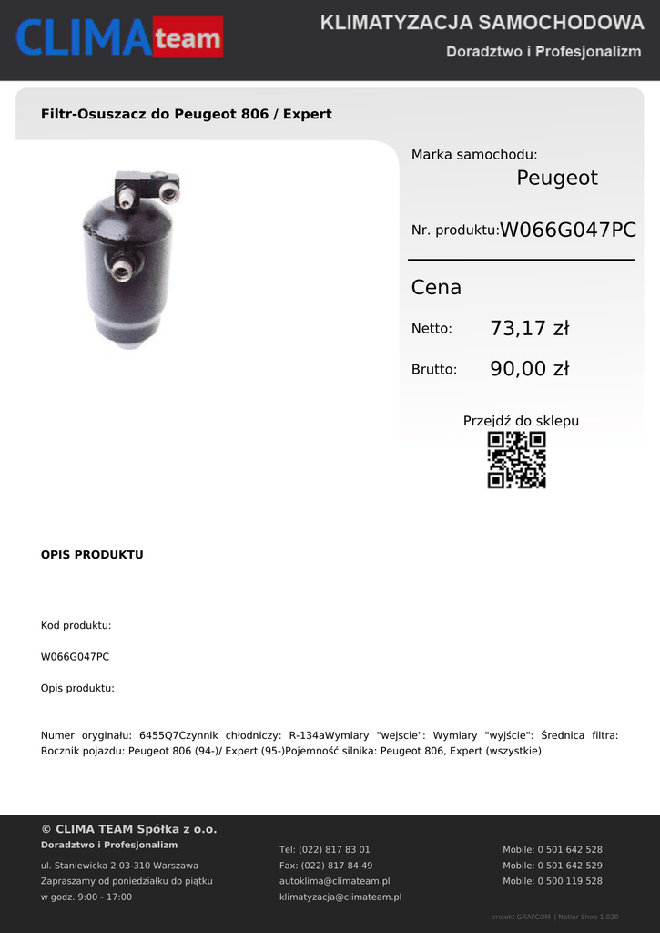 Filtr-Osuszacz do Peugeot 806 / Expert Marka samochodu: Peugeot Nr. produktu:W066G047PC Cena Netto: 73,17 zł Brutto: 90,00 zł Przejdź do sklepu OPIS PRODUKTU Kod produktu: W066G047PC Opis produktu: Numer oryginału: 6455Q7Czynnik chłodniczy: R-134aWymiary "wejscie": Wymiary "wyjście": Średnica filtra: Rocznik pojazdu: Peugeot 806 (94-)/ Expert (95-)Pojemność silnika: Peugeot 806, Expert (wszystkie) © CLIMA TEAM Spółka z o.o. Doradztwo i Profesjonalizm Tel: (022) 817 83 01 Mobile: 0 501 642 528 ul. Staniewicka 2 03-310 Warszawa Fax: (022) 817 84 49 Mobile: 0 501 642 529 Zapraszamy od poniedziałku do piątku [email protected] Mobile: 0 500 119 528 w godz. 9:00 - 17:00 [email protected] projekt GRAFCOM | Netler Shop 1.020