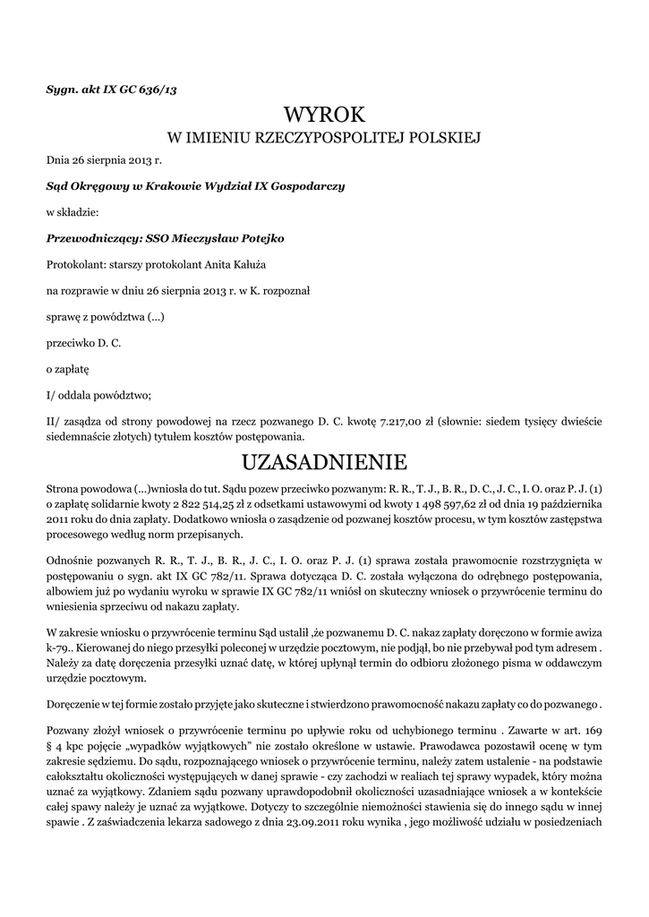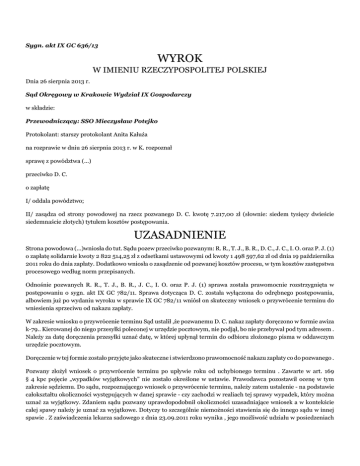 Sygn. akt IX GC 636/13 WYROK W IMIENIU RZECZYPOSPOLITEJ POLSKIEJ Dnia 26 sierpnia 2013 r. Sąd Okręgowy w Krakowie Wydział IX Gospodarczy w składzie: Przewodniczący: SSO Mieczysław Potejko Protokolant: starszy protokolant Anita Kałuża na rozprawie w dniu 26 sierpnia 2013 r. w K. rozpoznał sprawę z powództwa (...) przeciwko D. C. o zapłatę I/ oddala powództwo; II/ zasądza od strony powodowej na rzecz pozwanego D. C. kwotę 7.217,00 zł (słownie: siedem tysięcy dwieście siedemnaście złotych) tytułem kosztów postępowania. UZASADNIENIE Strona powodowa (...)wniosła do tut. Sądu pozew przeciwko pozwanym: R. R., T. J., B. R., D. C., J. C., I. O. oraz P. J. (1) o zapłatę solidarnie kwoty 2 822 514,25 zł z odsetkami ustawowymi od kwoty 1 498 597,62 zł od dnia 19 października 2011 roku do dnia zapłaty. Dodatkowo wniosła o zasądzenie od pozwanej kosztów procesu, w tym kosztów zastępstwa procesowego według norm przepisanych. Odnośnie pozwanych R. R., T. J., B. R., J. C., I. O. oraz P. J. (1) sprawa została prawomocnie rozstrzygnięta w postępowaniu o sygn. akt IX GC 782/11. Sprawa dotycząca D. C. została wyłączona do odrębnego postępowania, albowiem już po wydaniu wyroku w sprawie IX GC 782/11 wniósł on skuteczny wniosek o przywrócenie terminu do wniesienia sprzeciwu od nakazu zapłaty. W zakresie wniosku o przywrócenie terminu Sąd ustalił ,że pozwanemu D. C. nakaz zapłaty doręczono w formie awiza k-79.. Kierowanej do niego przesyłki poleconej w urzędzie pocztowym, nie podjął, bo nie przebywał pod tym adresem . Należy za datę doręczenia przesyłki uznać datę, w której upłynął termin do odbioru złożonego pisma w oddawczym urzędzie pocztowym. Doręczenie w tej formie zostało przyjęte jako skuteczne i stwierdzono prawomocność nakazu zapłaty co do pozwanego . Pozwany złożył wniosek o przywrócenie terminu po upływie roku od uchybionego terminu . Zawarte w art. 169 § 4 kpc pojęcie „wypadków wyjątkowych” nie zostało określone w ustawie. Prawodawca pozostawił ocenę w tym zakresie sędziemu. Do sądu, rozpoznającego wniosek o przywrócenie terminu, należy zatem ustalenie - na podstawie całokształtu okoliczności występujących w danej sprawie - czy zachodzi w realiach tej sprawy wypadek, który można uznać za wyjątkowy. Zdaniem sądu pozwany uprawdopodobnił okoliczności uzasadniające wniosek a w kontekście całej spawy należy je uznać za wyjątkowe. Dotyczy to szczególnie niemożności stawienia się do innego sądu w innej spawie . Z zaświadczenia lekarza sadowego z dnia 23.09.2011 roku wynika , jego możliwość udziału w posiedzeniach sądu została wykluczona na okres około 6 miesięcy . Jest to okres kiedy przesyłka była awizowana . Ponadto przemawia za zasadnością wniosku fakt ,że w stosunku do pozostałych pozwanych roszczenie zostało prawomocne oddalone wobec jego przedawnienia . W tej sytuacji zdaniem sądu doszłoby przy tym samym stanie faktycznym do zróżnicowania odpowiedzialności pozwanych co stoi w sprzeczności z zasadą praworządności. Jako uzasadnienie roszczenia co do pozwanego strona powodowa podniosła, że wyrokiem zaocznym z dnia 5 kwietnia 2004 r. Sąd Okręgowy w Krakowie zasądził od strony pozwanej (...) Spółki z o.o. w O. na rzecz (...) kwotę 1 135 718,79 zł z odsetkami od dnia 14 czerwca 2002 r. do dnia zapłaty oraz zwrot kosztów postępowania w kwocie 8 000 zł, ponadto wyrokiem zaocznym z dnia 6 lipca 2004 r. Sąd Okręgowy w Krakowie zasądził od (...) Spółki z o.o. w O. na rzecz strony powodowej kwotę 147 979,28 zł z ustawowymi odsetkami od dnia 18 czerwca 2004 r. do dnia zapłaty oraz kwotę 3 600 zł tytułem kosztów postępowania, zaś wyrokiem zaocznym z dnia 5 października 2006 r. Sąd Rejonowy w Chrzanowie zasądził od (...) Sp. z o.o. w O. na rzecz strony powodowej kwotę 26 218,56 zł z ustawowymi odsetkami od określonych w pozwie kwot oraz kwotę 2 400 zł tytułem zwrotu kosztów procesu. Prowadzone z wniosku powódki postępowania egzekucyjne wierzytelności objętej ww. tytułami wykonawczymi pozostają bezskuteczne, postępowania egzekucyjne umorzono wobec stwierdzenia bezskuteczności egzekucji. W związku z tym faktem odpowiedzialność za zobowiązania spółki ponoszą solidarnie członkowie jej zarządu, którymi są pozwani w niniejszej sprawie. Nakazem zapłaty w postępowaniu upominawczym z dnia 27 października 2011 roku sygn. akt GNc 836/11, Sąd uwzględnił roszczenie powoda w całości, nakazując m.in. pozwanemu D. C., aby zapłacił łącznie z innymi pozwanymi solidarnie na rzecz strony powodowej kwotę 2 822 514,25 zł wraz z ustawowymi odsetkami liczonymi od kwoty 1 498 597,62 zł od dnia 19 października 2011 roku do dnia zapłaty oraz kwotą 7 200 zł tytułem zwrotu kosztów zastępstwa procesowego w terminie dwóch tygodni od doręczenia nakazu, albo wnieśli w tym terminie sprzeciw. Dodatkowo Sąd Okręgowy nakazał ściągnąć od pozwanych solidarnie na rzecz Skarbu Państwa - Sądu Okręgowego w Krakowie kwotę 25 000 zł tytułem opłaty sądowej, od której powód był zwolniony. W prawidłowo wniesionym sprzeciwie od nakazu zapłaty, pozwany zaskarżył go w całości, domagając się oddalenia powództwa oraz zasądzenia kosztów procesu według norm przepisanych. Podniósł zarzut przedawnienia roszczeń dochodzonych przez powoda. Przy przyjęciu zastosowania do roszczeń powoda przepisów o przedawnieniu roszczeń o naprawienie szkody wyrządzonej czynem niedozwolonym, roszczenie powoda uległo 3 - letniemu przedawnieniu, który to termin przedawnienia rozpoczął bieg w dniu 29 sierpnia 2005 r. a upłynął z dniem 29 sierpnia 2008 r., bowiem najpóźniej w dniu 29 sierpnia 2005 r. powód powziął wiadomość o bezskutecznej egzekucji przeciwko spółce i szkodzie, albowiem wtedy otrzymał obydwa postanowienia komornicze o umorzeniu egzekucji. W replice na sprzeciw pozwanego, powódka zakwestio
