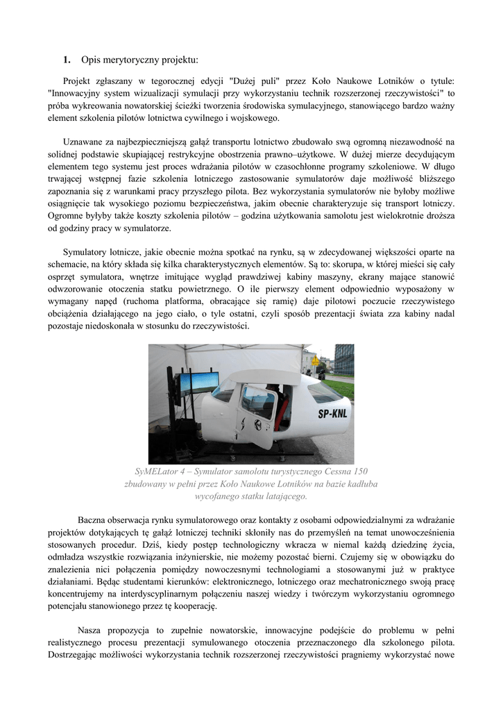 1. Opis merytoryczny projektu: Projekt zgłaszany w tegorocznej edycji "Dużej puli" przez Koło Naukowe Lotników o tytule: "Innowacyjny system wizualizacji symulacji przy wykorzystaniu technik rozszerzonej rzeczywistości" to próba wykreowania nowatorskiej ścieżki tworzenia środowiska symulacyjnego, stanowiącego bardzo ważny element szkolenia pilotów lotnictwa cywilnego i wojskowego. Uznawane za najbezpieczniejszą gałąź transportu lotnictwo zbudowało swą ogromną niezawodność na solidnej podstawie skupiającej restrykcyjne obostrzenia prawno–użytkowe. W dużej mierze decydującym elementem tego systemu jest proces wdrażania pilotów w czasochłonne programy szkoleniowe. W długo trwającej wstępnej fazie szkolenia lotniczego zastosowanie symulatorów daje możliwość bliższego zapoznania się z warunkami pracy przyszłego pilota. Bez wykorzystania symulatorów nie byłoby możliwe osiągnięcie tak wysokiego poziomu bezpieczeństwa, jakim obecnie charakteryzuje się transport lotniczy. Ogromne byłyby także koszty szkolenia pilotów – godzina użytkowania samolotu jest wielokrotnie droższa od godziny pracy w symulatorze. Symulatory lotnicze, jakie obecnie można spotkać na rynku, są w zdecydowanej większości oparte na schemacie, na który składa się kilka charakterystycznych elementów. Są to: skorupa, w której mieści się cały osprzęt symulatora, wnętrze imitujące wygląd prawdziwej kabiny maszyny, ekrany mające stanowić odwzorowanie otoczenia statku powietrznego. O ile pierwszy element odpowiednio wyposażony w wymagany napęd (ruchoma platforma, obracające się ramię) daje pilotowi poczucie rzeczywistego obciążenia działającego na jego ciało, o tyle ostatni, czyli sposób prezentacji świata zza kabiny nadal pozostaje niedoskonała w stosunku do rzeczywistości. SyMELator 4 – Symulator samolotu turystycznego Cessna 150 zbudowany w pełni przez Koło Naukowe Lotników na bazie kadłuba wycofanego statku latającego. Baczna obserwacja rynku symulatorowego oraz kontakty z osobami odpowiedzialnymi za wdrażanie projektów dotykających tę gałąź lotniczej techniki skłoniły nas do przemyśleń na temat unowocześnienia stosowanych procedur. Dziś, kiedy postęp technologiczny wkracza w niemal każdą dziedzinę życia, odmładza wszystkie rozwiązania inżynierskie, nie możemy pozostać bierni. Czujemy się w obowiązku do znalezienia nici połączenia pomiędzy nowoczesnymi technologiami a stosowanymi już w praktyce działaniami. Będąc studentami kierunków: elektronicznego, lotniczego oraz mechatronicznego swoją pracę koncentrujemy na interdyscyplinarnym połączeniu naszej wiedzy i twórczym wykorzystaniu ogromnego potencjału stanowionego przez tę kooperację. Nasza propozycja to zupełnie nowatorskie, innowacyjne podejście do problemu w pełni realistycznego procesu prezentacji symulowanego otoczenia przeznaczonego dla szkolonego pilota. Dostrzegając możliwości wykorzystania technik rozszerzonej rzeczywistości pragniemy wykorzystać nowe zdobycze techniki, zastępując standardowo spotykane ekrany zupełnie nowym systemem. W proponowanym rozwiązaniu wyposażyć chcemy szkolonego pilota w specjalistyczne gogle wirtualnej rzeczywistości, które obecnie są postrzegane jako jeden z symboli współczesnej technologii i stwarzają ogromne pole do potancjalnego wykorzystania w niemal każdym aspekcie otaczającego świata. Owe gogle miałyby za zadanie prezentację odwzorowywanego świata otaczającego kabinę w symulowanym locie. Kreowany przez nas system oprogramowania i sprzętu elektronicznego ma wyświetlać obraz jedynie w obszarach, w których w przypadku rzeczywistego lotu faktycznie się on pojawia – szybach kabiny statku powietrznego. Pozostała część widoku – wyposażenie kabiny, tablice sterujące, byłaby przekazywana przez zespoloną z goglami kamerę, tak aby jedynie odpowiednia część informacji pochodziła z przestrzeni wirtualnej, pozostała – z rzeczywistości. Problem połączenia obu sfer zamierzamy rozwiązać poprzez zastosowanie techniki wykorzystywanej w przemyśle telewizyjnym, filmowym. Byłaby nią technologia "green screen", która w zdecydowanej mierze opiera się na wykrywaniu obszarów o znanym, odpowiednio dopasowanym kolorze – w tym przypadku charakterystycznym dla studiów nagraniowych zielonym, i zastępowania ich w przekazywanym, właściwie złożonym obrazie tworzonymi komputerowo aktywnymi, bądź nie, grafikami. Planujemy zatem odpowiednie obszary kabiny pokryć materiałem w kolorze, który przygotowany przez nas system zastępować będzie obrazem z symulowanego środowiska i połączony z normalnym odbiorem przekazywany na gogle pilota. Takie rozwiązanie powoduje jednak problem zapewnienia odpowiedniego oświetlenia kabiny. W związku z tym jednym z działań jakie zamierzamy podjąć w ramach prezentowanego projektu jest próba stworzenia kompatybilnego, aktywnego środowiska oświetleniowego. Kolejnym wyzwaniem jest odpowiednie oświetlenie wnętrza kabiny. Światło w kokpicie powinno być jak najbardziej zbliżone do naturalnego, równomiernie oświetlać wszystkie elementy, w tym zielony materiał na szybach, nie wpływać mocno na pracę kamery oraz posiadać możliwość dynamicznych zmian w celu odzwierciedlenia lotów w różnych porach dniach. Podczas pracy nad projektem przeprowadzone zostaną badania, dzięki którym wybrane zostanie najbardziej optymalne źródło oświetlenia. Stworzony przez nas system zamierzamy testować na posiadanym przez nas symulatorze samolotu Cessna 150. Stworzenie symulacji lotu tego statku powietrznego będzie przedmiotem naszych najbliższych działań i stanowić będzie wstęp do zastosowania wyżej opisanego Systemu wizualizacji w nowym symulatorze – śmigłowca Robinson R44. Jedna z maszyn tego typu została wycofana z eksploatacji w drugiej połowie 2015 roku, na skutek awaryjnego lądowania w trakcie Radom Air Sho