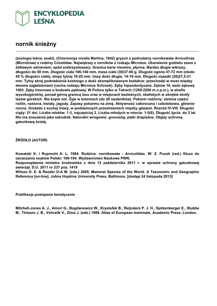 nornik śnieżny (zoologia leśna, ssaki), (Chionomys nivalis Martins, 1842) gryzoń z podrodziny nornikowate Arvicolinae (Microtinae) z rodziny Cricetidae. Największy z norników z rodzaju Microtus. Ubarwienie grzbietu szare z żółtawym odcieniem, spód srebrzystoszary. Granica barw nieostra, płynna. Bardzo długie wibrysy, długości do 50 mm. Długość ciała 106-140 mm, masa ciała (30)37-66 g. Długość ogona 47-72 mm (około 45 % długości ciała), stopy tylnej 18-25 mm. Uszy dość długie, 14-19 mm. Długość czaszki (26)27,5-31 mm. Tylny skraj podniebienia kostnego o dość skomplikowanym kształcie: przechodzi w most między dwoma zagłebieniami (cecha rodzaju Microtus Schrank). Zęby hipsodontyczne. Zębów 16, wzór zębowy 1003. Zęby trzonowe o budowie pętlowej. W Polsce tylko w Tatrach (1200-2200 m n.p.m.), w strefie wysokogórskiej, ponad górną granicą lasu oraz w miejscach bezleśnych, skalistych w obrębie strefy lasów górskich. Nie kopie nor. Żyje w koloniach (do 20 osobników). Pokarm roślinny: zielone części roślin, nasiona, kwiaty, jagody. Zapasy pokarmu na zimę. Aktywność całoroczna i całodobowa, głównie nocna. Gniazdo z suchej trawy, w podziemnych przestrzeniach między głazami. Rozród IV-VIII. Długość ciąży: 21 dni. Liczba miotów: 1-3, najczęściej 2. Liczba młodych w miocie: 1-5(6). Długość życia: do 2 lat. Nie ma znaczenia jako szkodnik. Naturalni wrogowie: gronostaj, ptaki drapieżne. Objęty ochroną gatunkową ścisłą. ŹRÓDŁO (AUTOR) Kowalski K. i Ruprecht A. L. 1984. Rodzina: nornikowate - Arvicolidae. W: Z. Pucek (red.) Klucz do oznaczania ssaków Polski: 169-194. Wydawnictwo Naukowe PWN. Rozporządzenie ministra środowiska z dnia 12 października 2011 r. w sprawie ochrony gatunkowej zwierząt. D.U. 2011 nr 237 poz. 1419 Wilson D. E. & Reeder D-A M. (eds.) 2005. Mammal Species of the World. A Taxonomic and Geographic Reference [on-line]. Johns Hopkins University Press, Baltimore. [dostęp 24 listopada 2013] Publikacje powiązane tematycznie Mitchell-Jones A. J., Amori G., Bogdanowicz W., Krystufek B., Reijnders P. J. H., Spitzenberger E., Stubbe M., Thissen J. B., Vohralik V., Zima J. (eds.) 1999. Atlas of European mammals. Academic Press, London.