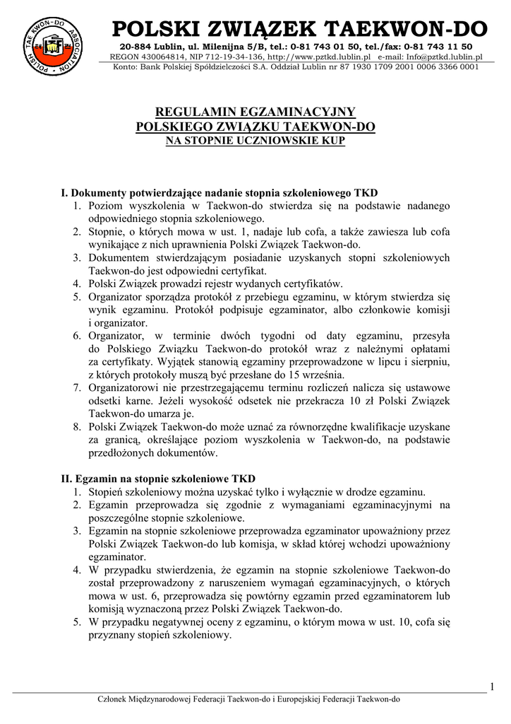 POLSKI ZWIĄZEK TAEKWON-DO 20-884 Lublin, ul. Milenijna 5/B, tel.: 0-81 743 01 50, tel./fax: 0-81 743 11 50 REGON 430064814, NIP 712-19-34-136, http://www.pztkd.lublin.pl e-mail: [email protected] Konto: Bank Polskiej Spółdzielczości S.A. Oddział Lublin nr 87 1930 1709 2001 0006 3366 0001 REGULAMIN EGZAMINACYJNY POLSKIEGO ZWIĄZKU TAEKWON-DO NA STOPNIE UCZNIOWSKIE KUP I. Dokumenty potwierdzające nadanie stopnia szkoleniowego TKD 1. Poziom wyszkolenia w Taekwon-do stwierdza się na podstawie nadanego odpowiedniego stopnia szkoleniowego. 2. Stopnie, o których mowa w ust. 1, nadaje lub cofa, a także zawiesza lub cofa wynikające z nich uprawnienia Polski Związek Taekwon-do. 3. Dokumentem stwierdzającym posiadanie uzyskanych stopni szkoleniowych Taekwon-do jest odpowiedni certyfikat. 4. Polski Związek prowadzi rejestr wydanych certyfikatów. 5. Organizator sporządza protokół z przebiegu egzaminu, w którym stwierdza się wynik egzaminu. Protokół podpisuje egzaminator, albo członkowie komisji i organizator. 6. Organizator, w terminie dwóch tygodni od daty egzaminu, przesyła do Polskiego Związku Taekwon-do protokół wraz z należnymi opłatami za certyfikaty. Wyjątek stanowią egzaminy przeprowadzone w lipcu i sierpniu, z których protokoły muszą być przesłane do 15 września. 7. Organizatorowi nie przestrzegającemu terminu rozliczeń nalicza się ustawowe odsetki karne. Jeżeli wysokość odsetek nie przekracza 10 zł Polski Związek Taekwon-do umarza je. 8. Polski Związek Taekwon-do może uznać za równorzędne kwalifikacje uzyskane za granicą, określające poziom wyszkolenia w Taekwon-do, na podstawie przedłożonych dokumentów. II. Egzamin na stopnie szkoleniowe TKD 1. Stopień szkoleniowy można uzyskać tylko i wyłącznie w drodze egzaminu. 2. Egzamin przeprowadza się zgodnie z wymaganiami egzaminacyjnymi na poszczególne stopnie szkoleniowe. 3. Egzamin na stopnie szkoleniowe przeprowadza egzaminator upoważniony przez Polski Związek Taekwon-do lub komisja, w skład której wchodzi upoważniony egzaminator. 4. W przypadku stwierdzenia, że egzamin na stopnie szkoleniowe Taekwon-do został przeprowadzony z naruszeniem wymagań egzaminacyjnych, o których mowa w ust. 6, przeprowadza się powtórny egzamin przed egzaminatorem lub komisją wyznaczoną przez Polski Związek Taekwon-do. 5. W przypadku negatywnej oceny z egzaminu, o którym mowa w ust. 10, cofa się przyznany stopień szkoleniowy. 1 Członek Międzynarodowej Federacji Taekwon-do i Europejskiej Federacji Taekwon-do 6. Osoby, którym nadano stopień szkoleniowy w Taekwon-do, są uprawnione do udziału w zajęciach, treningach lub zawodach Taekwon-do, w których regulaminy wymagają od zawodników posiadania określonego stopnia szkoleniowego. III. Osoby uprawnione do przeprowadzania egzaminów 1. Do przeprowadzania egzaminów upoważnieni są egzaminatorzy PZTKD. 2. Egzaminatorzy PZTKD dzielą się na: 3. egzaminatorów z prawem nadawania stopni do 1 kup włącznie, na terenie całego kraju (uprawnienia te przysługują po trzech lat od uzyskania praw egzaminatorskich), 4. egzaminatorów z prawem nadawania stopni do 1 kup włącznie, jedynie w obrębie własnego klubu (uprawnienia te przysługują po uzyskaniu stopnia mistrzowskiego IV Dan i złożeniu pisemnego wniosku do wiceprezesa PZTKD ds. szkoleniowo-technicznych). 5. Lista egzaminatorów ustalana jest corocznie na okres od 1 stycznia do 31 grudnia. Proponuje ją Wiceprezes ds. szkoleniowych, a zatwierdza Zarząd Polskiego Związku Taekwon-do. IV. Częstotliwość przeprowadzania egzaminów 1. Egzaminy na stopnie uczniowskie przeprowadzane są dwa razy w roku. 2. Prawo do trzeciego egzaminu w roku zawodnik uzyskuje z chwilą odbycia dwóch obozów szkoleniowo-technicznych Taekwon-do, tj. minimum 100 godzin praktyki potwierdzonych podpisami instruktorów prowadzących zajęcia na obozach. Instruktorzy ci muszą posiadać stopień minimum IV Dan. V. Zakres promocji 1. Prawidłowo odbyty egzamin daje promocję o 1 kup. 2. Zawodnik może uzyskać promocję o 3 kup w przypadku, gdy jest to uzasadnione jego wysokim poziomem technicznym. Promocję taką może otrzymać tylko jeden raz i jedynie w zakresie stopni do 6 kup. 3. Zawodnik może uzyskać promocję o 2 kup w przypadku, gdy jest to uzasadnione jego wysokim poziomem technicznym. Promocję taką może otrzymać nie więcej niż 3 razy lub nie więcej niż 2 razy w przypadku, gdy wcześniej otrzymał już promocję o 3 kup. 4. Wszystkie promocje nadane w wyniku przeprowadzenia dodatkowych egzaminów nie mogą być wyższe niż o 1 kup. 5. W przypadku, gdy poziom techniczny zdającego drastycznie lub wyraźnie odbiega od poziomu, jaki powinien spełniać posiadający dotychczas stopień, egzaminator może nałożyć zakaz odbywania następnego egzaminu. 6. W przypadku, gdy zawodnik zdaje egzamin poza swoim macierzystym klubem, musi uzyskać zgodę na piśmie od swojego trenera prowadzącego. 2 Członek Międzynarodowej Federacji Taekwon-do i Europejskiej Federacji Taekwon-do VI. Kryteria powoływania egzaminatorów PZTKD 1. Ukończony 25 rok życia. 2. Stopień minimum IV Dan. 3. Legitymacja instruktora Taekwon-do wydana przez PZTKD. 4. Czynna praca instruktorska w klubie zrzeszonym w PZTKD. 5. Dyspozycyjność. VII. Kryteria zmiany zasięgu uprawnień lub pozbawienia funkcji egzaminatora PZTKD 1. Brak uzasadnionej aktywności egzaminacyjnej (nie przeprowadzenie egzaminu przez okres 2 lat). 2. Brak czynnego udziału w szkoleniach i seminariach dla egzaminatorów organizowanych przez PZTKD. 3. Naruszenie regulaminu egzaminacyjnego. 4. Zawieszenie lub wykluczenie z PZTKD. 5. Nieterminowe regulowanie należności za certyfikaty (dotyczy egzaminatorów, którzy są jednocześnie organizatorami egzaminów). 6. Nieetyczne postępowanie. 7. Zaprzestanie pracy instruktorskiej w Klubie. 8. Nieopłacenie przez Klub, w którym egzaminator pracuje, jako instruktor, składki członkowskiej do PZTKD lub za
