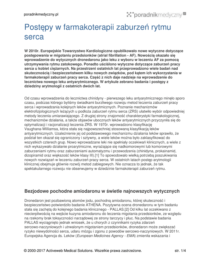 poradnikmedyczny.pl Postępy w farmakoterapii zaburzeń rytmu serca W 2010r. Europejskie Towarzystwo Kardiologiczne opublikowało nowe wytyczne dotyczące postępowania w migotaniu przedsionków (atrial fibrillation - AF). Nowością okazało się wprowadzenie do wytycznych dronedaronu jako leku z wyboru w leczeniu AF za pomocą utrzymywania rytmu zatokowego. Ponadto uściślono wytyczne dotyczące zaburzeń pracy serca u kobiet ciężarnych. Na przestrzeni ostatnich lat przeprowadzono wiele badań nad skutecznością i bezpieczeństwem kilku nowych związków, pod kątem ich wykorzystania w farmakoterapii zaburzeń pracy serca. Część z nich daje nadzieje na wprowadzenie do lecznictwa nowego leku antyarytmicznego. W artykule zebrano badania i postępy z dziedziny arytmologii z ostatnich dwóch lat. Od czasu wprowadzenia do lecznictwa chinidyny - pierwszego leku antyarytmicznego minęło sporo czasu, podczas którego byliśmy świadkami burzliwego rozwoju metod leczenia zaburzeń pracy serca i wprowadzania kolejnych leków antyarytmicznych. Poznanie mechanizmów elektrofizjologicznych leżących u podłoża zaburzeń rytmu serca (ZRS) ułatwiło wybór odpowiedniej metody leczenia umiarawiającego. Z drugiej strony znajomość charakterystyki farmakologicznej, mechanizmów działania, a także objawów ubocznych leków antyarytmicznych przyczyniła się do optymalizacji i racjonalizacji leczenia ZRS. W 1970r. wprowadzono klasyfikację Vaughana-Williamsa, która stała się najpowszechniej stosowaną klasyfikacją leków antyarytmicznych. Uzależnienie jej od podstawowego mechanizmu działania leków sprawiło, że podział ten okazał się ograniczony i sztywny, a wiele leków można było zaklasyfikować do wszystkich czterech grup. Nowo wprowadzane leki nie spełniały oczekiwań klinicznych, a wiele z nich wykazywało działanie proarytmiczne, wyrażające się nadkomorowymi lub komorowymi zaburzeniami rytmu oraz zaburzeniami automatyzmu i przewodzenia (chinidyna, prokainamid, dizopiramid oraz większość leków klasy III).[1] To spowodowało wielką potrzebą poszukiwania nowych rozwiązań w leczeniu zaburzeń pracy serca. W ostatnich latach postęp arytmologii klinicznej obejmuje głównie rozwój metod zabiegowych. Nie oznacza to jednak, że tak spektakularnego rozwoju nie obserwujemy w dziedzinie farmakoterapii zaburzeń rytmu. Bezjodowe pochodne amiodaronu w świetle najnowszych wytycznych Dronedaron jest pozbawioną atomów jodu, pochodną amiodaronu, której skuteczność i bezpieczeństwo potwierdziło badanie ATHENA. Pozytywna ocena dronedaronu w tym badaniu stała się zachętą do kolejnego badania klinicznego - PALLAS.[2] Od kilku lat oczekiwano z niecierpliwością na wejście kuzyna amiodaronu do leczenia migotania przedsionków, ze względu na rzekomy brak toksyczności narządowej ze strony tarczycy i płuc. Na podstawie badania PALLAS wyciągnięto jednak wniosek, że u chorych z czynnikami ryzyka zdarzeń sercowo-naczyniowych i utrwalonym migotaniem przedsionków, dronedaron może zwiększać ryzyko niewydolności serca, udaru mózgu i zgonu z powodów sercowo-naczyniowych. W 2011r. Europejska Agencja ds. Leków (European Medicines Agency - EMA) zmieniła wskazania i © 2000-2017 Activeweb Medical Solutions. Wszelkie prawa zastrzeżone. str. 1/4 poradnikmedyczny.pl przeciwwskazania do stosowania dronedaronu. Od tej chwili dronedaron jest zastrzeżony wyłącznie dla napadowego lub przetrwałego AF z rytmem zatokowym w chwili włączenia leku. Bezwzględnym przeciwwskazaniem jest niewydolność serca i skurczowa dysfunkcja lewej komory. Należy również pamiętać o potrzebie monitorowania czynności wątroby i płuc podczas terapii dronedaronem. Mimo to, dronedaron znalazł się w najnowszych wytycznych dotyczących utrzymywania rytmu zatokowego obok amiodaronu, flekainidu (niedostępnego w Polsce), propafenonu i sotalolu. [3] Wybór odpowiedniego leku jest uzależniony w głównej mierze od choroby podstawowej i bezpieczeństwa terapii. W przypadku pacjentów pozbawionych choroby strukturalnej lekami pierwszego wyboru mogą być: dronedaron, flekainid, propafenon, sotalol, natomiast amiodaron pozostaje lekiem dalszego wyboru. W niewydolności serca w stabilnej klasie I/II NYHA lekiem z wyboru jest dronedaron, natomiast w klasie III/IV lub niestabilnej klasie II nadal pozostaje amiodaron. W nadciśnieniu z przerostem lewej komory lekiem pierwszego wyboru jest dronedaron, a dalszego - amiodaron. W chorobie niedokrwiennej serca lekiem z wyboru jest dronedaron lub sotalol. [9] Kolejną po dronedaronie bezjodową, pochodną amiodaronu, która stała się przedmiotem badań klinicznych był celiwaron. Badania MAIA i CORYFEE [4] wykluczyły jednak przydatność celiwaronu w przywracaniu lub utrzymywaniu rytmu zatokowego po kardiowersji AF. Dalsze badania ICARIOS i ALPHEE [5,6] wzięły pod lupę skuteczność celiwaronu u chorych z komorowymi zaburzeniami rytmu z wszczepionym kardiowerterem-defibrylatorem. Wstępne wyniki badań nie wykazały jednak skuteczności leku na większej populacji chorych. Wernakalant - nowy lek przeciwarytmiczny Wernakalant jest nowym lekiem przeciwarytmicznym, który wykazuje się wysoką selektywnością w stosunku do tkanek przedsionków. W badaniach klinicznych II i II fazy (ACT I i ACT II) okazał się bardzo skuteczny w przerywaniu krótkotrwałego AF, również u pacjentów po zabiegach kardiochirurgicznych. Niestety w przypadku przerywania długotrwałego AF i trzepotania przedsionków (atrial flutter - AFl) jego skuteczność jest niższa. Brakuje również danych na temat działania wernakalantu u osób z organiczną chorobą serca, choć ta grupa docelowa wydaje się priorytetem w poszukiwaniu nowych leków antyarytmicznych. W UE zarejestrowano postać dożylną wernakalantu, a postać doustna znajduje się jeszcze w fazie badań klinicznych. Kwestią sporną pozostaje jednak bezpieczeństwo stosowania. Z badań wynika, że lek t