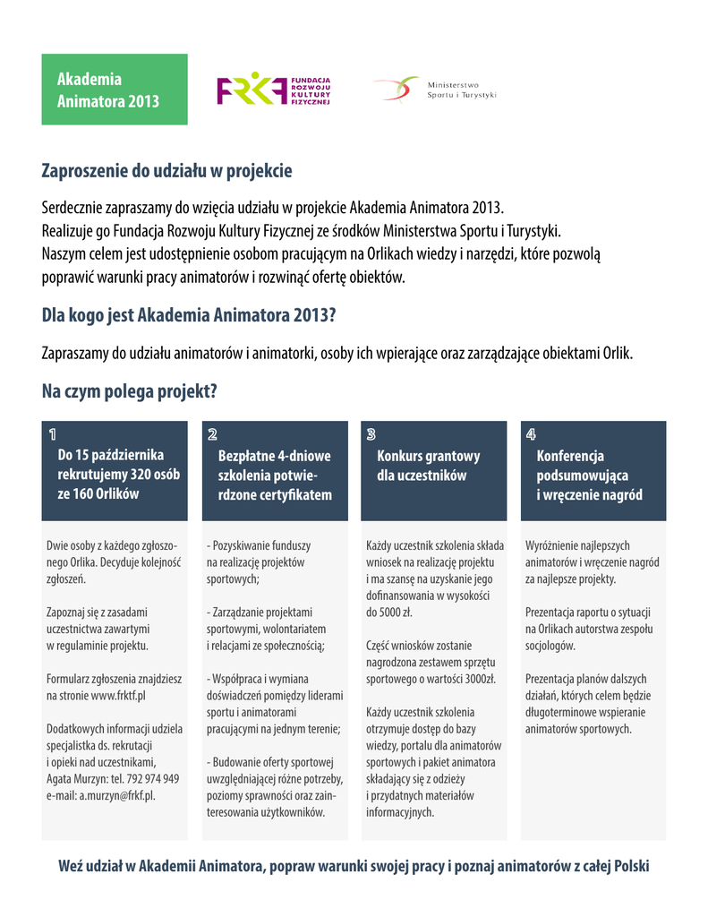 Akademia Animatora 2013 Zaproszenie do udziału w projekcie Serdecznie zapraszamy do wzięcia udziału w projekcie Akademia Animatora 2013. Realizuje go Fundacja Rozwoju Kultury Fizycznej ze środków Ministerstwa Sportu i Turystyki. Naszym celem jest udostępnienie osobom pracującym na Orlikach wiedzy i narzędzi, które pozwolą poprawić warunki pracy animatorów i rozwinąć ofertę obiektów. Dla kogo jest Akademia Animatora 2013? Zapraszamy do udziału animatorów i animatorki, osoby ich wpierające oraz zarządzające obiektami Orlik. Na czym polega projekt? Do 15 października rekrutujemy 320 osób ze 160 Orlików Bezpłatne 4-dniowe szkolenia potwierdzone certyfikatem Dwie osoby z każdego zgłoszonego Orlika. Decyduje kolejność zgłoszeń. - Pozyskiwanie funduszy na realizację projektów sportowych; Zapoznaj się z zasadami uczestnictwa zawartymi w regulaminie projektu. - Zarządzanie projektami sportowymi, wolontariatem i relacjami ze społecznością; Formularz zgłoszenia znajdziesz na stronie www.frktf.pl - Współpraca i wymiana doświadczeń pomiędzy liderami sportu i animatorami pracującymi na jednym terenie; Dodatkowych informacji udziela specjalistka ds. rekrutacji i opieki nad uczestnikami, Agata Murzyn: tel. 792 974 949 e-mail: [email protected]. - Budowanie oferty sportowej uwzględniającej różne potrzeby, poziomy sprawności oraz zainteresowania użytkowników. Konkurs grantowy dla uczestników Każdy uczestnik szkolenia składa wniosek na realizację projektu i ma szansę na uzyskanie jego dofinansowania w wysokości do 5000 zł. Część wniosków zostanie nagrodzona zestawem sprzętu sportowego o wartości 3000zł. Każdy uczestnik szkolenia otrzymuje dostęp do bazy wiedzy, portalu dla animatorów sportowych i pakiet animatora składający się z odzieży i przydatnych materiałów informacyjnych. Konferencja podsumowująca i wręczenie nagród Wyróżnienie najlepszych animatorów i wręczenie nagród za najlepsze projekty. Prezentacja raportu o sytuacji na Orlikach autorstwa zespołu socjologów. Prezentacja planów dalszych działań, których celem będzie długoterminowe wspieranie animatorów sportowych. Weź udział w Akademii Animatora, popraw warunki swojej pracy i poznaj animatorów z całej Polski Akademia Animatora 2013 Regulamin projektu Idea Projekt Moje Boisko Orlik 2012 jest bardzo ważną częścią dziedzictwa sportowego wszystkich Polaków. Ideą projektu Akademia Animatora jest sprawienie, by Orliki były traktowane przez Polaków jako miejsca, które należą do wszystkich i w związku tym każdy, bez względu na stopień sprawności, płeć, wiek, poziom zamożności, przynależność etniczną i światopoglądową miał do nich dostęp, rozumiany jako możliwość uczestnictwa, rozwoju swoich umiejętności, spędzania czasu wolnego. Naszym zdaniem kluczową rolę pełnią Animatorzy Orlika, którzy w konkretnej rzeczywistości społeczności lokalnej, mogą być czynnikiem ożywiającym i motywującym lokalne procesy. Dlatego projekt Akademii Animatora jest inicjatywą zakładającą wzmocnienie kompetencji i roli animatorów w ich codziennej pracy w relacjach z otoczeniem i społecznością lokalną. Przebieg projektu - Rekrutacja 320 uczestników szkoleń (po 2 osoby reprezentujące jedno boisko Orlik 2012). Termin zgłaszania uczestników upłynie wraz ze zgłoszeniem 160 Orlików, maksymalnie do 15 października 2013 roku. - Udział zrekrutowanych osób w 4 dniowych szkoleniach organizowanych w Pucku. Koszt udziału uczestników w projekcie pokrywa organizator. Szkolenia odbędą się w wyznaczonym przez organizatora terminie w listopadzie 2013 roku (jeden z trzech terminów: 7-11.11.2013 / 14-18.11.2013 / 21-25.11.2013). Każdy uczestnik otrzyma certyfikat ukończenia szkoleń, warunkiem jest obecność na wszystkich warsztatach. - W ramach Cyklu Szkoleń dla każdego Uczestnika i Uczestniczki przewidziany udział w następujących warsztatach: • Dzieci i rodzice: przedszkole Orlika, tenis ziemny U-10, badminton • Młodzież: parkour, ultimate frisbee • Seniorzy: animacja aktywności seniorów Warsztat społeczny (Projekt Społeczny UW) • Animacja sportowa dla osób niepełnosprawnych • Warsztat społeczny • Prezentacja portalu dla animatorów - Wszyscy uczestnicy szkoleń będą mieli możliwość wygrania sprzętu sportowego oraz grantów w wysokości 5000zł. Zasady konkursu zostaną przedstawione podczas szkoleń. Każdy z uczestników otrzyma również unikatowy pakiet Animatora. - Najlepsze projekty wyłonione podczas konkursu, zostaną wyróżnione w czasie ogólnopolskiej konferencji w Warszawie, podczas której zostaną rozdane nagrody najlepszym Animatorom. Konferencja odbędzie się w grudniu 2013 roku. - Każdy Animator w ramach projektu otrzyma możliwość utworzenia profilu Orlika, na ogólnopolskim portalu Nasz Orlik. Zasady uczestnictwa - Zgłoszenia może dokonać tylko osoba zarządzająca obiektem Orlik lub inna osoba upoważniona przez podmiot zarządzający kompleksem „Moje boisko - Orlik 2012”. Jeden Orlik powinien zgłosić 2 uczestników – animatora/animatorkę i osobę wspierającą jej działania (lokalny działacz/działaczka, wolontariusz/ka). Udział osób zgłoszonych do projektu jest bezpłatny. - Zgłoszenia będą przyjmowane od dnia 06 września 2013 r. (od godz. 9.00) do dnia 15 października 2013r. (do godz. 12.00). Do udziału zakwalifikujemy maksymalnie 160 Orlików, które jako pierwsze prześlą swoje zgłoszenia w wyżej podanym terminie. - Należy wypełnić formularz zgłoszeniowy i przesłać go pocztą elektroniczną na adres [email protected]. Po przesłaniu zgłoszenia pocztą elektroniczną, każdy zgłaszający otrzyma umowę szkoleniową. Podpisany i opieczętowany formularz „Zgłoszenia o przystąpieniu do Projektu” oraz umowę szkoleniową należy przesłać na adres: Fundacja Rozwoju Kultury Fizycznej, ul. Lipowa 3, 84-100 Puck. - O kolejności zgł