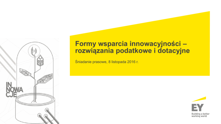 Formy wsparcia innowacyjności – rozwiązania podatkowe i dotacyjne Śniadanie prasowe, 8 listopada 2016 r. Prowadzący Eksperci z Zespołu Ulg i Dotacji Inwestycyjnych EY: Slajd 2 Paweł Tynel Honorata Ścisłowicz-Skraba Filip Kotarski Partner Lider Zespołu Starszy Menedżer Doradca podatkowy Menedżer Doradca podatkowy Wprowadzenie Praktycznie wszystkie kraje z naszego najbliższego sąsiedztwa, ale też kraje Europy Zachodniej posiadają bardzo rozbudowany system zachęt dla inwestorów Zachęty traktowane są jako bodziec kierunkujący inwestorów do podejmowania działań w poszczególnych sektorach gospodarki oraz regionach kraju W części krajów ulgi podatkowe w CIT dostępne są na terenie całego kraju (Czechy, Węgry, Serbia, Chorwacja) lub ich dostępność zależy od poziomu bezrobocia w regionach (Bułgaria) Slajd 3 Można zaobserwować istotne zróżnicowanie form wsparcia – od dotacji, przez ulgi podatkowe, dodatkowe odpisy, po wsparcie szkoleniowe. Często można te formy wsparcia łączyć Wsparcie prac B+R w postaci dodatkowego obniżenia podstawy opodatkowania jest powszechne i różni się zasadniczo wysokością odpisu. Najwyższy poziom proponuje Litwa – 200%, oznacza to możliwość zaliczenia do kosztów podatkowych trzykrotności wydatków na B+R Wydatki na B+R w Unii Europejskiej Wydatki na B+R w UE (%PKB) 3,5 3 2,5 2 1,5 1 0,5 0 Dane dla roku 2014, źródło: Eurostat, Gross domestic expenditure on R&D Slajd 4 Wsparcie działalności B+R w krajach UE Wielka Brytania Patent Box - preferencyjna stawka podatku CIT ► Stawka podatku CIT w wysokości 10% (podstawowa stawka 20%) dla dochodów osiąganych z wykorzystania w działalności gospodarczej wartości niematerialnych i prawnych będących w posiadaniu podmiotu brytyjskiego Research and Development Expenditure Credit (RDEC) / kredyt podatkowy na B+R ► Możliwość otrzymania przez dużych przedsiębiorców kredytu podatkowego w wysokości 11% kosztów kwalifikowanych (efektywnie 8,8%, gdyż dodatkowe odliczenie jest traktowane jako przychód podatkowy) ► Kredyt ten jest odliczany od należnego do zapłaty podatku CIT lub jako zwrot gotówkowy, jeżeli podatek należny jest niższy niż wysokość dodatkowego odliczenia Slajd 5 Patent Box Preferencyjna stawka podatku dochodowego dla przychodów uzyskanych z tytułu wykorzystywania własności intelektualnej, dostępna między innymi w Stanach Zjednoczonych, Francji, Belgii. Wsparcie działalności B+R w krajach UE Litwa Super ulga podatkowa na prace B+R ► Dodatkowe obniżenie podstawy opodatkowania o 200% wydatków na B+R. Strata powstała w wyniku odliczenia może być rozliczana w następnych latach - odpisów można dokonać w ciągu 5 kolejnych lat Węgry Ulga podatkowa na B+R ► Dodatkowe obniżenie podstawy opodatkowania o 100% wydatków na B+R ► Wymóg przeprowadzenia prac przy użyciu własnych zasobów technicznych i osobowych oraz ► komercjalizacji wyników badań na terenie Węgier (o ile badania prowadzi wyłącznie podmiot węgierski) Republika Czeska Super ulga podatkowa na prace B+R ► Dodatkowe obniżenie podstawy opodatkowania o 100% kosztów kwalifikowanych (z możliwością podwyższenia do 110% dla rosnących kosztów B+R) Slajd 6 Słowacja Super ulga podatkowa na prace B+R ► Dodatkowe obniżenie podstawy opodatkowania o 25%-65% kosztów kwalifikowanych dla dużych przedsiębiorstw w zależności od rodzaju prac B+R Główne źródła wsparcia działalności B+R w Polsce Dofinansowanie CAPEX Wsparcie na infrastrukturę B+R (Działanie 2.1. POIR) Dofinansowanie OPEX Ulga na działalność B+R Dofinansowanie budowy lub rozbudowy centrów B+R Dodatkowe odliczenie kosztów działalności B+R od podstawy opodatkowania Intensywność pomocy*: Wysokość dodatkowego odliczenia*: ► ► Prace rozwojowe: do 25%-45% Infrastruktura: do 70% Minimalna wartość kosztów kwalifikowanych: 2 mln PLN Pomoc przyznawana w procedurze konkursowej ► 30%/50% kosztów pracowniczych** ► 10%/30% pozostałych kosztów kwalifikowanych** Demonstrator (Poddziałanie 1.1.2. POIR) Szybka ścieżka (Poddziałanie 1.1.1. POIR) Dofinansowanie prowadzenie prac rozwojowych, związanych z wytworzeniem instalacji pilotażowej/demonstracyjnej Dofinansowanie na prowadzenie prac B+R składających się z badań przemysłowych i prac rozwojowych Intensywność pomocy*: Intensywność pomocy*: ► Prace rozwojowe: do 40%-60% ► Badania przemysłowe: do 65%-80% ► Prace rozwojowe: do 40%-60% Minimalna wartość kosztów kwalifikowanych: brak Minimalna wartość kosztów kwalifikowanych: 30 mln PLN Minimalna wartość kosztów kwalifikowanych: 12 mln PLN Brak procedury konkursowej Pomoc przyznawana w procedurze konkursowej Pomoc przyznawana w procedurze konkursowej * W zależności od wielkości przedsiębiorstwa. Dane dla dużych przedsiębiorstw. ** Zmiany od 1 stycznia 2017 r. Slajd 7 Perspektywa finansowa UE 2014-2020 Fundusze UE na B+R Polityka Spójności Alokacja dla Polski w nowej perspektywie finansowej 82,5 miliarda EUR 9,99 miliarda EUR Bezpośrednia koncentracja na B+R ► Alokacja środków na finansowanie B+R druga po alokacji na transport ► Możliwość dofinansowania B+R szczególnie istotna dla dużych przedsiębiorstw Slajd 8 Fundusze na badania i rozwój Statystyki zamkniętych naborów Szybka Ścieżka Czerwiec-Lipiec 2016 (Tylko duże przedsiębiorstwa) Demonstrator 2015 (MŚP+duże przedsiębiorstwa) 235* 142 105 Współczynnik sukcesu Współczynnik sukcesu Współczynnik sukcesu 23,5% 16,2% 44,7% * Liczba projektów skierowanych do oceny merytorycznej. Slajd 9 2016 23 4 17 POIR 2.1 Liczba złożonych wniosków Liczba projektów rekomendowanych Statystyki zamkniętych naborów Wnioski 123 Konieczność zdefiniowania projektu Wymagania formalne i merytoryczne Proces oceny 3 miesiące + ! ! Konkursy wygrywają bardzo dobrze przygotowane projekty Można skutecznie połączyć ulgę B+R z innymi instrumentami wsparcia Największe szan