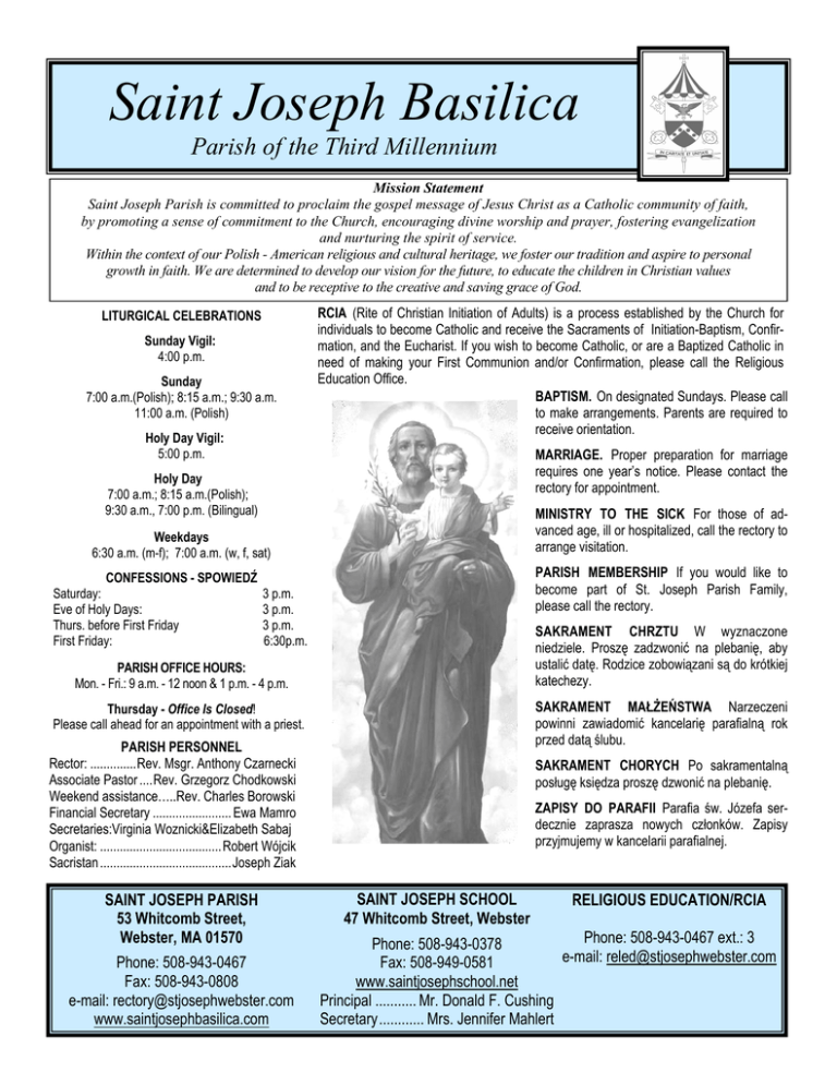 Saint Joseph Basilica Parish of the Third Millennium Mission Statement Saint Joseph Parish is committed to proclaim the gospel message of Jesus Christ as a Catholic community of faith, by promoting a sense of commitment to the Church, encouraging divine worship and prayer, fostering evangelization and nurturing the spirit of service. Within the context of our Polish - American religious and cultural heritage, we foster our tradition and aspire to personal growth in faith. We are determined to develop our vision for the future, to educate the children in Christian values and to be receptive to the creative and saving grace of God. LITURGICAL CELEBRATIONS Sunday Vigil: 4:00 p.m. Sunday 7:00 a.m.(Polish); 8:15 a.m.; 9:30 a.m. 11:00 a.m. (Polish) Holy Day Vigil: 5:00 p.m. RCIA (Rite of Christian Initiation of Adults) is a process established by the Church for individuals to become Catholic and receive the Sacraments of Initiation-Baptism, Confirmation, and the Eucharist. If you wish to become Catholic, or are a Baptized Catholic in need of making your First Communion and/or Confirmation, please call the Religious Education Office. BAPTISM. On designated Sundays. Please call to make arrangements. Parents are required to receive orientation. MARRIAGE. Proper preparation for marriage requires one year’s notice. Please contact the rectory for appointment. Holy Day 7:00 a.m.; 8:15 a.m.(Polish); 9:30 a.m., 7:00 p.m. (Bilingual) MINISTRY TO THE SICK For those of advanced age, ill or hospitalized, call the rectory to arrange visitation. Weekdays 6:30 a.m. (m-f); 7:00 a.m. (w, f, sat) PARISH MEMBERSHIP If you would like to become part of St. Joseph Parish Family, please call the rectory. CONFESSIONS - SPOWIEDŹ Saturday: Eve of Holy Days: Thurs. before First Friday First Friday: 3 p.m. 3 p.m. 3 p.m. 6:30p.m. SAKRAMENT CHRZTU W wyznaczone niedziele. Proszę zadzwonić na plebanię, aby ustalić datę. Rodzice zobowiązani są do krótkiej katechezy. PARISH OFFICE HOURS: Mon. - Fri.: 9 a.m. - 12 noon & 1 p.m. - 4 p.m. SAKRAMENT MAŁŻEŃSTWA Narzeczeni powinni zawiadomić kancelarię parafialną rok przed datą ślubu. Thursday - Office Is Closed! Please call ahead for an appointment with a priest. PARISH PERSONNEL Rector: .............. Rev. Msgr. Anthony Czarnecki Associate Pastor .... Rev. Grzegorz Chodkowski Weekend assistance…..Rev. Charles Borowski Financial Secretary ........................ Ewa Mamro Secretaries:Virginia Woznicki&Elizabeth Sabaj Organist: ..................................... Robert Wójcik Sacristan ........................................ Joseph Ziak SAINT JOSEPH PARISH 53 Whitcomb Street, Webster, MA 01570 Phone: 508-943-0467 Fax: 508-943-0808 e-mail: [email protected] www.saintjosephbasilica.com SAKRAMENT CHORYCH Po sakramentalną posługę księdza proszę dzwonić na plebanię. ZAPISY DO PARAFII Parafia św. Józefa serdecznie zaprasza nowych członków. Zapisy przyjmujemy w kancelarii parafialnej. SAINT JOSEPH SCHOOL 47 Whitcomb Street, Webster RELIGIOUS EDUCATION/RCIA Phone: 508-943-0467 ext.: 3 Phone: 508-943-0378 e-mail: [email protected] Fax: 508-949-0581 www.saintjosephschool.net Principal ........... Mr. Donald F. Cushing Secretary ............ Mrs. Jennifer Mahlert Page 2 July 7, 2013 - 7 lipca 2013r. Masses for the week—Msze Św. w Tygodniu Sunday Vigil 4:00 r.s. Stasia Beresik (2nd anniv.) - int. family Sunday - July 7 7:00 For the parishioners of St. Joseph Basilica 8:15 r.s . Mary Konieczny - int. Lorraine Ciuchta & family 9:30 r. s. Edward Dowgiewicz II (25th anniv.) - nt. mother & brothers, Richard & Mark 11:00 s.p. Maria, Franciszek, & Stanislaw Kurpiel - int. Anna & Edward Kudron & family Monday - July 8 6:30 r.s. Joseph & Edith Lazarowski - int. Jane 2:00 Oakwood Nursing Home Tuesday– July 9 6:30 s. p. Zofia i Stanisław Sokoł 7:00 Za wypominki Wednesday - July 10 6:30 Za przyczyna sw. Jozefa o trzewosc i laske nawrocenia dla Olgi i Darka i ich bliskich laske Sakramentu Malzenstwa - int. M/M Józef Sandomierz 7:00pm Do sw. Jozefa o podziekowanie za zycie calej rodziny, proszac o dalsza opieke i milosierdzie - int. M/M Piotr Chmielewski Thursday - July 11 6:30 r.s. Stephanie Kos - int. Edward Sitkowski, Roland Malboeuf & John Hickey Friday - July 12 6:30 r.s. Edward Kozlowski - int. wife, Sylvia & family 7:00 r.s. Tadeusz Stasior - int. Antoni Karlowicz Saturday—July 13 7:00 r.s. Mark A. Fallon (9th anniv.) - int. wife, Pauline & children Sunday Vigil 4:00 r.s. Dolores David (1st anniv.) - int. family 7:00pm Candlelight Procession Sunday - July 14 7:00 s.p. Zofia Stos - int. Córka, Maria z rodzina 8:15 For the parishioners of St. Joseph Basilica 9:30 r.s. Richard J. Franas, Jr. -int. M/M Richard J. Franas Sr. 11:00 s.p. Henryk Morga (2 r.s.) - int. Maria z rodzino 1:00pm Memorial Mass - r.s. Thomas Hughes - int. family MARRIAGE BANS I - Lindsay Reilly & Robert Szeles I-25 Club Winner for 14th week - #89 - Karen Miller SHARING OUR BLESSINGS - June 30, 2013 Weekly $4680(including $349 in loose money); Diocesan Obligations $16; Peter’s Pence $920.50 (including $87.50 in loose money); Catholic Comm. Camp. $35 Weekly Budget $7000 6/30/13 - $2304 below budget Stewardship Note: “The harvest is rich but the workers are few; therefore ask the harvest-master to send workers to the harvest.” The work Christ entrusted to his first disciples is also entrusted to us by virtue of our baptism. Stewardship is an invitation from God. It is an invitation to join in the work of the Church. FOURTEENTH SUNDAY IN ORDINARY TIME July 7, 2013 May I never boast except in the cross of Our Lord Jesus Christ. -Galatians 6:14 MISSION Today’s first reading from Isaiah was occasioned by the return of the Jewish people from exile. The prophet visualizes the Holy City as a mother welcoming her children home. The people may now look forward to prosperity and comfort. In this postPentecostal season, the Church attributes this sense of fulfillment to the Holy Spirit. Paul, 