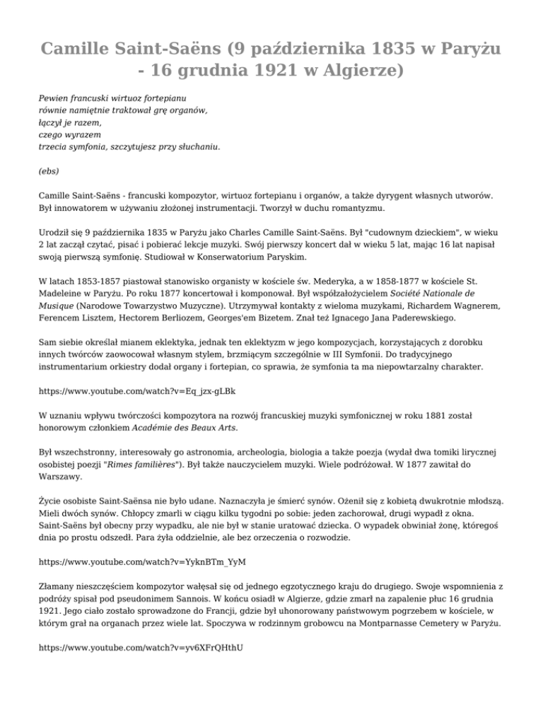 Camille Saint-Saëns (9 października 1835 w Paryżu - 16 grudnia 1921 w Algierze) Pewien francuski wirtuoz fortepianu równie namiętnie traktował grę organów, łączył je razem, czego wyrazem trzecia symfonia, szczytujesz przy słuchaniu. (ebs) Camille Saint-Saëns - francuski kompozytor, wirtuoz fortepianu i organów, a także dyrygent własnych utworów. Był innowatorem w używaniu złożonej instrumentacji. Tworzył w duchu romantyzmu. Urodził się 9 października 1835 w Paryżu jako Charles Camille Saint-Saëns. Był "cudownym dzieckiem", w wieku 2 lat zaczął czytać, pisać i pobierać lekcje muzyki. Swój pierwszy koncert dał w wieku 5 lat, mając 16 lat napisał swoją pierwszą symfonię. Studiował w Konserwatorium Paryskim. W latach 1853-1857 piastował stanowisko organisty w kościele św. Mederyka, a w 1858-1877 w kościele St. Madeleine w Paryżu. Po roku 1877 koncertował i komponował. Był współzałożycielem Société Nationale de Musique (Narodowe Towarzystwo Muzyczne). Utrzymywał kontakty z wieloma muzykami, Richardem Wagnerem, Ferencem Lisztem, Hectorem Berliozem, Georges'em Bizetem. Znał też Ignacego Jana Paderewskiego. Sam siebie określał mianem eklektyka, jednak ten eklektyzm w jego kompozycjach, korzystających z dorobku innych twórców zaowocował własnym stylem, brzmiącym szczególnie w III Symfonii. Do tradycyjnego instrumentarium orkiestry dodał organy i fortepian, co sprawia, że symfonia ta ma niepowtarzalny charakter. https://www.youtube.com/watch?v=Eq_jzx-gLBk W uznaniu wpływu twórczości kompozytora na rozwój francuskiej muzyki symfonicznej w roku 1881 został honorowym członkiem Académie des Beaux Arts. Był wszechstronny, interesowały go astronomia, archeologia, biologia a także poezja (wydał dwa tomiki lirycznej osobistej poezji "Rimes familières"). Był także nauczycielem muzyki. Wiele podróżował. W 1877 zawitał do Warszawy. Życie osobiste Saint-Saënsa nie było udane. Naznaczyła je śmierć synów. Ożenił się z kobietą dwukrotnie młodszą. Mieli dwóch synów. Chłopcy zmarli w ciągu kilku tygodni po sobie: jeden zachorował, drugi wypadł z okna. Saint-Saëns był obecny przy wypadku, ale nie był w stanie uratować dziecka. O wypadek obwiniał żonę, któregoś dnia po prostu odszedł. Para żyła oddzielnie, ale bez orzeczenia o rozwodzie. https://www.youtube.com/watch?v=YyknBTm_YyM Złamany nieszczęściem kompozytor wałęsał się od jednego egzotycznego kraju do drugiego. Swoje wspomnienia z podróży spisał pod pseudonimem Sannois. W końcu osiadł w Algierze, gdzie zmarł na zapalenie płuc 16 grudnia 1921. Jego ciało zostało sprowadzone do Francji, gdzie był uhonorowany państwowym pogrzebem w kościele, w którym grał na organach przez wiele lat. Spoczywa w rodzinnym grobowcu na Montparnasse Cemetery w Paryżu. https://www.youtube.com/watch?v=yv6XFrQHthU Saint-Saëns w sumie skomponował ponad 300 utworów. https://www.youtube.com/watch?v=8F1a3LoDJGg Jak na ironię, jego największym muzycznym triumf, "Karnawał zwierząt", został opublikowany w całości dopiero po jego śmierci, bo kompozytor obawiał się, że tak lekki utwór może podważyć jego reputację jako poważnego muzyka. https://www.youtube.com/watch?v=OvPjtolajZk