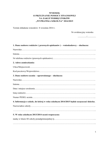 WNIOSEK O PRZYZNANIE POMOCY FINANSOWEJ NA ZAKUP PODRĘCZNIKÓW „WYPRAWKA SZKOLNA” 2014/2015 Termin składania wniosków: 8 września 2014 r. Nr ewidencyjny wniosku ................/................ 1. Dane osobowe rodziców ( prawnych opiekunów ) – wnioskodawcy – słuchacza: Nazwisko………………………………………………………………………………………... Imiona…………………………………………………………………………………………... Nr telefonu rodziców (prawnych opiekunów)………………………………………………….. 2. Adres zamieszkania: Ulica/Miejscowość……………………………………………………………………………… Kod pocztowy/Województwo………………………………………………………………….. 3. Dane osobowe ucznia – uprawnionego – słuchacza: Nazwisko……………………………………………………………………………………….. Imiona…………………………………………………………………………………………... Data i miejsce urodzenia……………………………………………………………………….. Imię rodziców…………………………………………………………………………………... Numer PESEL ucznia…………………………………………………………………………... 4. Informacja o szkole, do której w roku szkolnym 2014/2015 będzie uczęszczać dziecko. Nazwa/adres szkoły…………………………………………………………………………….. …………………………………………………………………………………………………... 5. W roku szkolnym 2013/2014 uczeń rozpoczyna: naukę w klasie III szkoły ponadgimnazjalnej tj.………………………………………………... …………………………………………………………………………………………………... 1 6. *Uczeń spełnia kryterium dochodowe: Rodzina moja składa się z niżej wymienionych osób, pozostających we wspólnym gospodarstwie domowym: LP. IMIĘ I NAZWISKO 1. DATA URODZENIA POKREWIEŃSTWO MIEJSCE ZATRUDNIENIA LUB NAUKI wnioskodawca 2. 3. 4. 5. 6. 7. W przypadku nie korzystania ze świadczeń pieniężnych z pomocy społecznej należy podać ŹRÓDŁA DOCHODU W RODZINIE ZA OSTATNI MIESIĄC POPRZEDZAJĄCY MIESIĄC ZŁOŻENIA WNIOSKU, w tym: 1. wynagrodzenia za pracę (netto)..............................................................................................zł 2. świadczenia rodzinne.............................................................................................................zł 3. dodatek mieszkaniowy......................................................................................................… zł 4. emerytury, renty (netto)........................................................................................................zł 5. alimenty.……...........................……..............................................................................…... zł 6. zasiłek dla bezrobotnych (netto).......……..…………………………………………..…… zł 7. dochody z gospodarstwa rolnego (207 zł x ha przeliczeniowe.)…....……...……...………. zł 8. dochody z prowadzenia działalności gospodarczej ..........................................……..…..… zł 9. inne dochody...............................................................................………….......…...……… zł 10. pomniejszenia: (składki KRUS, ZUS, płacone alimenty)....................................................zł Łączny dochód wszystkich członków rodziny wynosi …………………………….......….... .zł Miesięczna wysokość dochodu netto na 1 osobę w rodzinie wynosi .….………...…...…… zł 2 Pomoc udzielana jest uczniom spełniających kryterium dochodowe, o którym mowa w art. 5 ust 1 ustawy z dnia 28 listopada 2003 r. o świadczeniach rodzinnych (Dz. U. z 2013 r. poz. 1456, z późn. zm.) tj. kwoty 539 zł; Dochód obliczyłem/am na zasadach określonych w art. 8 ust. 3 -13 ustawy o pomocy społecznej. 7. Uczeń nie spełnia kryterium dochodowego ale jest uczniem: Słabowidzącym, Niesłyszącym, Słabosłyszącym, Z upośledzeniem umysłowym w stopniu lekkim, Z niepełnosprawnością ruchową, w tym z afazją, Z autyzmem, w tym z zespołem Aspergera. 8. Uczeń nie spełnia kryterium dochodowego, ale w rodzinie występuje: (proszę zaznaczyć właściwe): Ubóstwo; Sieroctwo; Bezdomność; Bezrobocie; Niepełnosprawność; Długotrwała lub ciężka choroba; Przemoc w rodzinie; Potrzeby ochrony ofiar handlu ludźmi Bezradności w sprawach opiekuńczo-wychowawczych i prowadzenia gospodarstwa domowego, zwłaszcza w rodzinach niepełnych lub wielodzietnych; Trudności w integracji cudzoziemców, którzy uzyskali w Rzeczypospolitej Polskiej status uchodźcy lub ochronę uzupełniającą; Trudności w przystosowaniu do życia po zwolnieniu z zakładu karnego; Alkoholizmu lub narkomanii; Zdarzenia losowego i sytuacji kryzysowej; Klęski żywiołowej lub ekologicznej; 9. Wnioskowana forma pomocy - dofinansowanie zakupu podręczników tylko do: kształcenia ogólnego, do kształcenia ogólnego i specjalnego, tylko do kształcenia specjalnego* 3 Świadomy/a/ odpowiedzialności karnej z art. 233 KK oświadczam, że podane dane są zgodne z prawdą i nie uzyskuję innych dochodów poza wymienionymi. Wyrażam zgodę na przetwarzanie danych osobowych zawartych we wniosku, dla celów związanych z przyznaniem stypendium szkolnego, zgodnie z ustawą z dnia 29.08.1997 r. o ochronie danych osobowych (Dz. U. Nr 101, poz. 926 z późn zm.). ……….…………................................................... (data i podpis rodziców/opiekunów ucznia) *Pkt 6 (Uczeń spełnia kryteria dochodowe) nie dotyc