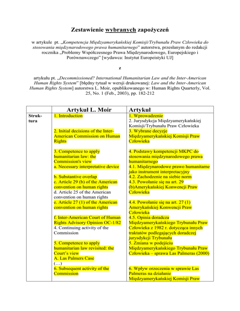 Zestawienie wybranych zapożyczeń w artykule pt. „Kompetencja Międzyamerykańskiej Komisji/Trybunału Praw Człowieka do stosowania międzynarodowego prawa humanitarnego” autorstwa, przesłanym do redakcji rocznika „Problemy Współczesnego Prawa Międzynarodowego, Europejskiego i Porównawczego” [wydawca: Instytut Europeistyki UJ] z artykułu pt. „Decommissioned? International Humanitarian Law and the Inter-American Human Rights System” [błędny tytuał w wersji drukowanej: Law and the Inter-American Human Rights System] autorstwa L. Moir, opublikowanego w: Human Rights Quarterly, Vol. 25, No. 1 (Feb., 2003), pp. 182-212 Artykuł L. Moir Struktura 1. Introduction 2. Initial decisions of the InterAmerican Commission on Human Rights 3. Competence to apply humanitarian law: the Commission's view a. Necessary interpretative device b. Substantive overlap c. Article 29 (b) of the American convention on human rights d. Article 25 of the American convention on human rights e. Article 27 (1) of the American convention on human rights f. Inter-American Court of Human Rights Advisory Opinion OC-1/82 4. Continuing activity of the Commission 5. Competence to apply humanitarian law revisited: the Court’s view A. Las Palmers Case (…) 6. Subsequent activity of the Commission Artykuł 1. Wprowadzenie 2. Jurysdykcja Międzyamerykańskiej Komisji/Trybunału Praw Człowieka 3. Wybrane decyzje Międzyamerykańskiej Komisji Praw Człowieka 4. Podstawy kompetencji MKPC do stosowania międzynarodowego prawa humanitarnego 4.1. Międzynarodowe prawo humanitarne jako instrument interpretacyjny 4.2. Zachodzenie na siebie norm 4.3. Powołanie się na art. 29 (b)Amerykańskiej Konwencji Praw Człowieka 4.4. Powołanie się na art. 27 (1) Amerykańskiej Konwencji Praw Człowieka 4.5. Opinia doradcza Międzyamerykańskiego Trybunału Praw Człowieka z 1982 r. dotycząca innych traktatów podlegających doradczej jurysdykcji Trybunału 5. Zmiana w podejściu Międzyamerykańskiego Trybunału Praw Człowieka – sprawa Las Palmeras (2000) 6. Wpływ orzeczenia w sprawie Las Palmeras na działanie Międzyamerykańskiej Komisji Praw 7. Conclusions 1/3 Initial decisions… / Wybrane Decyzje... Człowieka 6. Konkluzje - [Avilan case] The Commission found that the eleven victims had not been killed as a result of combat, however, and that they had instead been extra judicially executed whilst either trying to escape or to surrender, and whilst wounded and defenseless. All of the victims had died from gunshot wounds, which in most cases had been fired from close range (including distances of less than one meter).[przypis 16 “Id. 120-30”] The Commission therefore concluded that Colombia had violated Articles 4 (right to life), 5 (right to humane treatment), 8 (right to a fair trial) and 25 (judicial protection) of the American Convention, in conjunction with Article 1 (1 ), for the executions and the subsequent lack of justice by means of domestic legal proceedings. 17 [Id. 200] - [Sprawa Avilan] Komisja uznała, że ofiary nie zostały zabite w rezultacie walki, lecz w ramach pozasądowych egzekucji, kiedy próbowały uciekać lub poddać się i kiedy były bezbronne lub ranne. Strzały zostały oddane z bliskiej odległości, czasami nawet około jednego metra. Komisja stwierdziła, że naruszone zostały: art. 4 Amerykańskiej Konwencji Praw Człowieka (prawo do życia), art. 5 (prawo do humanitarnego traktowania), art. 8 (prawo do słusznego procesu) i art. 25 (prawo do skutecznego środka odwoławczego) z związku z art. 1 (1) dotyczącym ogólnego obowiązku przestrzegania i zapewnienia praw człowieka zawartych w Konwencji. [przypis 10: „Avilán i inni przeciwko Kolumbii, 1997, paragrafy 120-130, 200”] - [Saavedra Case] cytowanie i powoływanie się na następujące akapity raportu Komisji (zachowana kolejność): 62, 58, 61, 88 [przypisy: 27, 28, 29, 30] - [Sprawa Saavedra] cytowanie i powoływanie się na następujące akapity raportu Komisji (zachowana kolejność): 62, 58, 61, 88 [przypisy: 14, 15, 16] oraz liczne podobne sformułowanie do tekstu L. Moir. - [Abella Case] (…) the Inter-American Commission adopted its most celebrated report in this area (…) - [Sprawa Abella] Wreszcie w bodajże najbardziej znanej sprawie (…) Komisja (…) cytowanie i powoływanie się na następujące akapity raportu Komisji (zachowana kolejność): 180, 156, 155, 178, 189, 182-185, 186-188, 187, 437. cytowanie i powoływanie się na następujące akapity raportu Komisji (zachowana kolejność): 180, 155-156, 178-179 i 188, - [Coard Case – s. 202 i nast., pkt. 4. C – Continuing activity…] On 29 September 1999, the Commission adopted Report No. 109/99. This case is unique in the jurisprudence of the Commission, in that it concerns the international, rather than internal, use of force. The petitioners alleged that the military action taken by US troops in Grenada (…) 1983 "violated a series of international norms regulating the use - [Sprawa Coard] Ciekawą sprawą, którą rozpatrywała Komisja była sprawa Coard przeciwko USA z 1999 r. Była ona interesująca głównie dlatego, że w odróżnieniu od omawianych do tej pory spraw dotyczyła konfliktu międzynarodowego, a nie wewnętrznego. Skarżący zarzucali, że akcja zbrojna amerykańskich sił zbrojnych w Grenadzie w 1983 r. naruszyła normy prawa międzynarodowego dotyczące użycia siły przez państwa, którego rezultatem były naruszenia Amerykańskiej Deklaracji Praw i 186-189, 437. 3/4 Competence… / Podstawy kompetncji… of force by states," resulting in a number of violations of the American Declaration on the Rights and Duties of Man. In particular, it was alleged that the victims had been detained by US forces during the early stages of the operation, held incommunicado for a substantial period of time, and mistreated. The United States asserted that the situation was governed entirely by international humanitarian law, which the