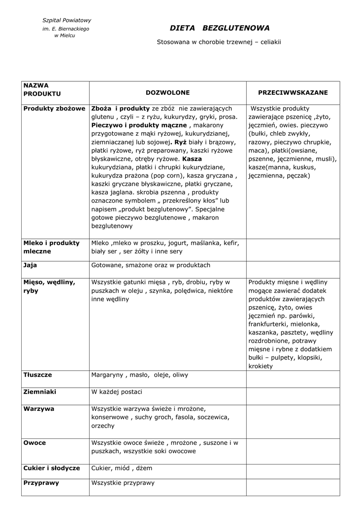 Szpital Powiatowy DIETA im. E. Biernackiego w Mielcu BEZGLUTENOWA Stosowana w chorobie trzewnej – celiakii NAZWA PRODUKTU DOZWOLONE Produkty zbożowe Zboża i produkty ze zbóż nie zawierających glutenu , czyli – z ryżu, kukurydzy, gryki, prosa. Pieczywo i produkty mączne , makarony przygotowane z mąki ryżowej, kukurydzianej, ziemniaczanej lub sojowej. Ryż biały i brązowy, płatki ryżowe, ryż preparowany, kaszki ryżowe błyskawiczne, otręby ryżowe. Kasza kukurydziana, płatki i chrupki kukurydziane, kukurydza prażona (pop corn), kasza gryczana , kaszki gryczane błyskawiczne, płatki gryczane, kasza jaglana. skrobia pszenna , produkty oznaczone symbolem „ przekreślony kłos” lub napisem „produkt bezglutenowy”. Specjalne gotowe pieczywo bezglutenowe , makaron bezglutenowy Mleko i produkty mleczne Mleko ,mleko w proszku, jogurt, maślanka, kefir, biały ser , ser żółty i inne sery Jaja Gotowane, smażone oraz w produktach Mięso, wędliny, ryby Wszystkie gatunki mięsa , ryb, drobiu, ryby w puszkach w oleju , szynka, polędwica, niektóre inne wędliny Tłuszcze Margaryny , masło, oleje, oliwy Ziemniaki W każdej postaci Warzywa Wszystkie warzywa świeże i mrożone, konserwowe , suchy groch, fasola, soczewica, orzechy Owoce Wszystkie owoce świeże , mrożone , suszone i w puszkach, wszystkie soki owocowe Cukier i słodycze Cukier, miód , dżem Przyprawy Wszystkie przyprawy PRZECIWWSKAZANE Wszystkie produkty zawierające pszenicę ,żyto, jęczmień, owies. pieczywo (bułki, chleb zwykły, razowy, pieczywo chrupkie, maca), płatki(owsiane, pszenne, jęczmienne, musli), kasze(manna, kuskus, jęczmienna, pęczak) Produkty mięsne i wędliny mogące zawierać dodatek produktów zawierających pszenicę, żyto, owies jęczmień np. parówki, frankfurterki, mielonka, kaszanka, pasztety, wędliny rozdrobnione, potrawy mięsne i rybne z dodatkiem bułki – pulpety, klopsiki, krokiety Zupy Domowe zupy i buliony przygotowane z warzyw świeżych i mrożonych i z dozwolonych produktów Przegryzki Wafle ryżowe, chrupki kukurydziane , pop corn Desery i słodycze Czekolada twarda mleczna i gorzka, ciasta, ciastka z dozwolonych produktów – z mąki kukurydzianej , desery ryżowe, galaretki , desery z żelatyną, kisiele budynie domowe, wiórki kokosowe. Do wypieku ciast należy używać drożdży lub sody lub bezglutenowego proszku do pieczenia Większość zup z puszek , z proszku i innych gotowych , kostki bulionowe Wszystkie zawierające pszenicę , żyto, jęczmień, owies Opracował Dietetyk Szpitala na podstawie: 1. 2. 3. Ciborowska H., Rudnicka A.: Dietetyka. Żywienie zdrowego i chorego człowieka. Wydawnictwo Lekarskie PZWL, W - wa 2009, dodruk 2010r. Dzieniszewski J., Szponar L., Szczygieł B., Socha J. (red.): Podstawy Naukowe Żywienia w Szpitalach. Wyd. Instytut Żywności i Żywienia, Warszawa 2001r. Szczygłowa H.: System dietetyczny dla zakładów służby zdrowia. Wyd. Instytut Żywności i Żywienia, Warszawa 2001r.