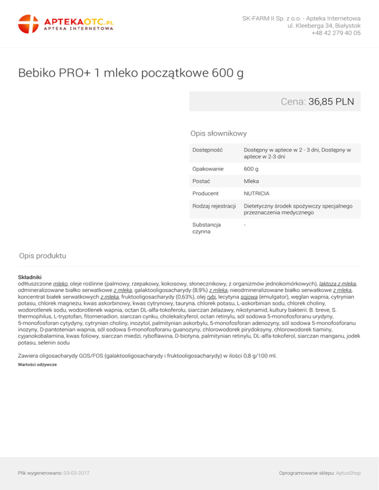 SK-FARM II Sp. z o.o. - Apteka Internetowa ul. Kleeberga 34, Białystok +48 42 279 40 05 Bebiko PRO+ 1 mleko początkowe 600 g Cena: 36,85 PLN Opis słownikowy Dostępność Dostępny w aptece w 2 - 3 dni, Dostępny w aptece w 2-3 dni Opakowanie 600 g Postać Mleka Producent NUTRICIA Rodzaj rejestracji Dietetyczny środek spożywczy specjalnego przeznaczenia medycznego Substancja czynna - Opis produktu Składniki odtłuszczone mleko, oleje roślinne (palmowy, rzepakowy, kokosowy, słonecznikowy, z organizmów jednokomórkowych), laktoza z mleka, odmineralizowane białko serwatkowe z mleka, galaktooligosacharydy (8,9%) z mleka, nieodmineralizowane białko serwatkowe z mleka, koncentrat białek serwatkowych z mleka, fruktooligosacharydy (0,63%), olej rybi, lecytyna sojowa (emulgator), węglan wapnia, cytrynian potasu, chlorek magnezu, kwas askorbinowy, kwas cytrynowy, tauryna, chlorek potasu, L-askorbinian sodu, chlorek choliny, wodorotlenek sodu, wodorotlenek wapnia, octan DL-alfa-tokoferolu, siarczan żelazawy, nikotynamid, kultury bakterii: B. breve, S. thermophilus, L-tryptofan, fitomenadion, siarczan cynku, cholekalcyferol, octan retinylu, sól sodowa 5-monofosforanu urydyny, 5-monofosforan cytydyny, cytrynian choliny, inozytol, palmitynian askorbylu, 5-monofosforan adenozyny, sól sodowa 5-monofosforanu inozyny, D-pantotenian wapnia, sól sodowa 5-monofosforanu guanozyny, chlorowodorek pirydoksyny, chlorowodorek tiaminy, cyjanokobalamina, kwas foliowy, siarczan miedzi, ryboflawina, D-biotyna, palmitynian retinylu, DL-alfa-tokoferol, siarczan manganu, jodek potasu, selenin sodu Zawiera oligosacharydy GOS/FOS (galaktooligosacharydy i fruktooligosacharydy) w ilości 0,8 g/100 ml. Wartości odżywcze Plik wygenerowano: 03-03-2017 Oprogramowanie sklepu: AptusShop SK-FARM II Sp. z o.o. - Apteka Internetowa ul. Kleeberga 34, Białystok +48 42 279 40 05 Wartość energetyczna kJ/kcal Tłuszcz g w tym -kwasy tłuszczowe nasycone g -kwasy tłuszczowe jednonienasycone g -kwasy tłuszczowe wielonienasycone g Węglowodany g w tym -cukry g Błonnik g Białko g Sól g Witaminy: Witamina A µg Witamina D µg Witamina E mg Witamina K µg Witamina C mg Tiamina mg Ryboflawina mg Niacyna mg Witamina B6 mg Kwas foliowy µg Witamina B12 µg Biotyna µg Kwas pantotenowy mg Składniki mineralne: Sód mg Potas mg Chlorek mg Wapń mg Fosfor mg Magnez mg Żelazo mg Cynk mg Miedź mg Mangan mg Fluorek mg Selen µg Jod µg Kwasy LCPUFA: Kwas arachidowy (AA) mg Kwas eikozapentaenowy (EPA) mg Kwas dokozaheksaenowy (DHA) mg Inne: L-karnityna mg Cholina mg Inozytyol mg 100 ml produktu gotowego do spożycia 275/66 3,4 1,4 1,3 0,6 7,3 7,2 0,6 1,3 0,05 53 1,2 1,3 5,1 9,2 0,05 0,11 0,43 0,04 13 0,18 1,6 0,32 18 66 39 45 32 5,1 0,52 0,49 0,04 0,01 ≤0,003 1,5 12 6,5 1,4 6,5 1,3 9,9 3,7 100 ml produktu gotowego do spożycia Masa netto Masa netto: 600 g Charakterystyka Mleko początkowe Bebiko PRO+ 1. Formuła Nutriflor PRO+ z procesem fermentacji mlekowej odpowiada potrzebom małych, dojrzewających jeszcze brzuszków łącząc w sobie: LACTOFIDUS –proces inspirowany naturalnym zjawiskiem fermentacji mlekowej Plik wygenerowano: 03-03-2017 Oprogramowanie sklepu: AptusShop SK-FARM II Sp. z o.o. - Apteka Internetowa ul. Kleeberga 34, Białystok +48 42 279 40 05 Błonnik GOS/FOS Omega 3 (DHA) Przeciwwskazania Nadwrażliwość na którykolwiek ze składników preparatu. Stosowanie Bebiko Pro+ 1, tak jak inne mleka początkowe, powinno być stosowane po zasięgnięciu porady lekarza. Tabela żywienia Bebiko Pro+ 1 (o ile lekarz nie zaleci inaczej): Należy stosować się do tabeli żywienia. Podano w niej orientacyjną wielkość i ilość posiłków spożywanych przez niemowlę w ciągu doby. Wiek niemowlęcia 1. miesiąc / Ilość porcji na dobę 7 / Woda (ml) 90 - 120 / Ilość płaskich miareczek na porcję 3-4 Wiek niemowlęcia 2.-3. miesiąc / Ilość porcji na dobę 6 / Woda (ml) 120 / Ilość płaskich miareczek na porcję 4 Wiek niemowlęcia 4. miesiąc / Ilość porcji na dobę 6 / Woda (ml) 150 / Ilość płaskich miareczek na porcję 5 Wiek niemowlęcia 5.-6. miesiąc / Ilość porcji na dobę 4 / Woda (ml) 180 / Ilość płaskich miareczek na porcję 6 100 ml Bebiko Pro+ 1 = 90 ml wody + 3 płaskie miareczki = 275 kJ (66 kcal) 1 płaska miareczka = 4,5 g = 92 kJ (22 kcal) Przechowywanie Produkt powinien być przechowywany w suchym miejscu, w temperaturze poniżej 25°C. Nie przechowywać w lodówce.Zawartość otwartego opakowania foliowego powinna być zużyta w ciągu 1 miesiąca. Producent NUTRICIA Polska Sp. z o.o. ul. Bobrowiecka 6 00-728 Warszawa Ważne informacje Światowa Organizacja Zdrowia zaleca wyłączne karmienie piersią przez pierwsze 6 miesięcy życia. Zalecamy stosowanie mleka początkowego wyłącznie po zasięgnięciu porady osób posiadających kwalifikacje z zakresu medycyny, żywienia lub farmacji, w tym przede wszystkim lekarzy pediatrów, farmaceutów lub dietetyków, albo innych osób profesjonalnie odpowiedzialnych za opiekę nad matką i dzieckiem. Informacje dodatkowe Stosować pod nadzorem lekarza. Produkt nie jest przeznaczony do stosowania pozajelitowego. Służymy Państwu pomocą pod adresem [email protected]. Plik wygenerowano: 03-03-2017 Powered by TCPDF (www.tcpdf.org) Oprogramowanie sklepu: AptusShop