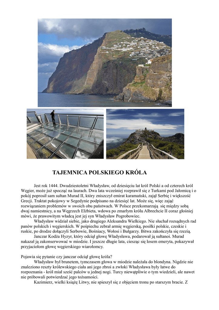TAJEMNICA POLSKIEGO KRÓLA Jest rok 1444. Dwudziestoletni Władysław, od dziesięciu lat król Polski a od czterech król Węgier, może już spocząć na laurach. Dwa lata wcześniej rozprawił się z Turkami pod Jałomicą i o pokój poprosił sam sułtan Murad II, który zniszczył emirat karamański, zajął Serbię i większość Grecji. Traktat pokojowy w Segedynie podpisano na dziesięć lat. Może się, więc zająć rozwiązaniem problemów w swoich obu państwach. W Polsce przekomarzają się między sobą dwaj namiestnicy, a na Węgrzech Elżbieta, wdowa po zmarłym królu Albrechcie II coraz głośniej mówi, że prawowitym władcą jest jej syn Władysław Pogrobowiec. Władysław widział siebie, jako drugiego Aleksandra Wielkiego. Nie słuchał rozsądnych rad panów polskich i węgierskich. W pośpiechu zebrał armię węgierską, posiłki polskie, czeskie i ruskie, po drodze dołączyli Serbowie, Bośniacy, Wołosi i Bułgarzy. Bitwa zakończyła się rzezią. Janczar Kodża Hyzyr, który odciął głowę Władysława, podarował ją sułtanoi. Murad nakazał ją zakonserwować w miodzie. I jeszcze długie lata, ciesząc się losem emeryta, pokazywał przyjaciołom głowę węgierskiego wiarołomcy. Pojawia się pytanie czy janczar odciął głowę króla? Władysław był brunetem, tymczasem głowa w miodzie należała do blondyna. Nigdzie nie znaleziono reszty królewskiego ciała ani jego zbroi a zwłoki Władysława były łatwe do rozpoznania - król miał sześć palców u jednej nogi. Turcy niewątpliwie o tym wiedzieli, ale nawet nie próbowali potwierdzać jego tożsamości. Kazimierz, wielki książę Litwy, nie spieszył się z objęciem tronu po starszym bracie. Z koronacją zwlekał trzy lata. Zapewne miał ku temu powód w postaci wiarygodnych wieści, że starszy brat żyje. Jest więc bardzo prawdopodobne, że Władysław ocalał. Według niepotwierdzonych iformacji król w przebraniu zakonnika uciekł na papieski statek, który zbierał niedobitków po Warnie. Krótko przebywał na dworze swojego sojusznika (pod Warną walczyły oddziały bośniackie) księcia Bośni Stefana Vukcicia. Następnie wstąpił do zakonu rycerskiego św. Katarzyny na Synaju. Już jako Kawaler św. Katarzyny w lipcu 1454 roku zjawił się w gronie portugalskich przyjaciół w Lizbonie. Od króla Alfonsa otrzymał na kolonizowanej właśnie Maderze leżącą nieopodal Funchal posiadłość Madalena do Mar i tam się osiedlił. Na Maderze Władysław był znany jako Henrique Alemao. Dosłownie Henryk Niemiec, ale przydomkiem Alemao określano w Portugalii wszystkich, którzy pochodzili z krajów na wschód od Renu i na północ od Alp. Herique Alemao żył naprawdę. Zachował się dokument z 1457 roku nadający mu ziemię w kotlinie świętej Magdaleny. Jest też inny wiarygodny dowód pobytu Warneńczyka na Maderze. Ladislaus Rex Poloniae et Hungarie vivis in sulisulis regnum Portugalie – pisze zakonnik Mikołaj Floris w liście do wielkiego mistrza krzyżackiego Ludwiga von Erlichshausena. List, napisany w 1472 roku (a nie 1452, jak błędnie sądzono) znajduje się w Getyndze. Przez wieki leżał w Królewcu, ale gdy do miasta zbliżała się Armia Czerwona, został wywieziony wraz z całym archiwum uniwersytetu. List badał historyk dr Leopold Kielanowski. Przesłał jego fotokopie do największych specjalistów na świecie. Z Archiwum Watykańskiego otrzymał najwierniejszy z możliwych przekład z łaciny, a dr Jose Pereira da Costa z archiwum Corygo Tombo w Lizbonie potwierdził jego autentyczność; list zawiera typowe piętnastowieczne błędy popełniane przez Portugalczyków piszących po łacinie, oraz gwarę żeglarską, co dowodzi, że jego autor musiał mieć coś wspólnego z morzem. Jak choćby rejs na Maderę. W tłumaczeniu na polski słowa listu brzmią: „Chcę ci oznajmić, że król Władysław żyje obecnie na wyspach Królestwa Portugalii, a ja jestem jego towarzyszem i współpustelnikiem. Odsuń zatem wszelkie wątpliwości, jedynym celem napisania tego listu jest wykorzenienie obustronnej nienawiści i zawziętości między twoim zakonem a Polakami, a to niechże się stanie za sprawą Ducha Świętego. Zlecam oddawcy tego listu Janowi Polakowi popularnie zwanym szipar - żeglarz, który cudownym zbiegiem okoliczności mnie na swój statek przyjął i zawiózł do Lizbony, aby przekonał Waszą Dostojność o rzeczach, które widział i o których słyszał. Może Wasza Dostojność dać wiarę, jak w Świętej Ewangelii. Proszę przesłać ten list do Matki Królewskiej, ponieważ matka i syn, są ze sobą najmocniej związani jak odwieczna sama istota miłości. Wyślijcie też ten list do Czechów i Węgrów, rzecz jest pilna, dlatego śpieszyłem z listem do Lizbony szybkimi statkami, zwłaszcza zaś do króla Portugalii Alfonsa i jego książąt, by okazali swoją dobrą wolę w tej sprawie.” Pismo to potwierdza portugalską legendę, jakoby na Maderze pochodzący z Polski franciszkańscy mnisi rozpoznali polskiego króla Władysława, po sześciu palcach u nogi i znajomości mowy polskiej. Prosili go, by wrócił do kraju, ale ten odmówił. Prosili więc portugalskiego króla Alfonsa, by ten się wstawił za nimi. Ten wezwał Henryka Niemca, ale on znów odmówił powrotu na tron. I wracając z Portugalii na Maderę zginął ugodzony głazem spadającym z wysokiego klifu Cabo Girao. Henrique de Noronha, autor herbarza z 1700 roku podaje, że Henrique Alemao przybył na Maderę ok. 1450 roku, mówiono o nim, że jest polskim królem, ale ten nie chciał o tym mówić.