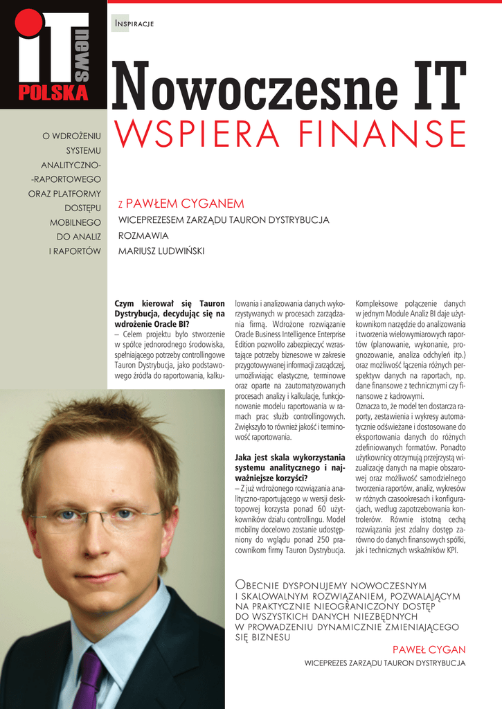 Inspiracje O wdrOżeniu systemu Nowoczesne IT wspiera finanse analitycznO- -rapOrtOwegO Oraz platfOrmy dOstępu mObilnegO dO analiz i rapOrtów z pawłem cyganem wiceprezesem zarządu taurOn dystrybucja rOzmawia mariusz ludwiński Czym kierował się Tauron Dystrybucja, decydując się na wdrożenie Oracle BI? – Celem projektu było stworzenie w spółce jednorodnego środowiska, spełniającego potrzeby controllingowe Tauron Dystrybucja, jako podstawowego źródła do raportowania, kalku- lowania i analizowania danych wykorzystywanych w procesach zarządzania firmą. Wdrożone rozwiązanie Oracle Business Intelligence Enterprise Edition pozwoliło zabezpieczyć wzrastające potrzeby biznesowe w zakresie przygotowywanej informacji zarządczej, umożliwiając elastyczne, terminowe oraz oparte na zautomatyzowanych procesach analizy i kalkulacje, funkcjonowanie modelu raportowania w ramach prac służb controllingowych. Zwiększyło to również jakość i terminowość raportowania. Jaka jest skala wykorzystania systemu analitycznego i najważniejsze korzyści? – Z już wdrożonego rozwiązania analityczno-raportującego w wersji desktopowej korzysta ponad 60 użytkowników działu controllingu. Model mobilny docelowo zostanie udostępniony do wglądu ponad 250 pracownikom firmy Tauron Dystrybucja. Kompleksowe połączenie danych w jednym Module Analiz BI daje użytkownikom narzędzie do analizowania i tworzenia wielowymiarowych raportów (planowanie, wykonanie, prognozowanie, analiza odchyleń itp.) oraz możliwość łączenia różnych perspektyw danych na raportach, np. dane finansowe z technicznymi czy finansowe z kadrowymi. Oznacza to, że model ten dostarcza raporty, zestawienia i wykresy automatycznie odświeżane i dostosowane do eksportowania danych do różnych zdefiniowanych formatów. Ponadto użytkownicy otrzymują przejrzystą wizualizację danych na mapie obszarowej oraz możliwość samodzielnego tworzenia raportów, analiz, wykresów w różnych czasookresach i konfiguracjach, według zapotrzebowania kontrolerów. Równie istotną cechą rozwiązania jest zdalny dostęp zarówno do danych finansowych spółki, jak i technicznych wskaźników KPI. Obecnie dysponujemy nowoczesnym i skalowalnym rozwiązaniem, pozwalającym na praktycznie nieograniczony dostęp do wszystkich danych niezbędnych w prowadzeniu dynamicznie zmieniającego się biznesu paweł cygan wiceprezes zarządu taurOn dystrybucja Inspiracje Piotr Witczyński, p.o. Country Leader, Oracle Polska W ramach projektu wykorzystano najlepiej dostosowane do wymagań Tauron Dystrybucja SA technologie: Oracle Business Intelligence Enterprise Edition 11g (platforma analityczno-raportowa), Oracle Data Integrator and Application Adapter 11g (narzędzie integracji danych dla hurtowni), Oracle Database 11g (baza hurtowni danych) oraz Oracle Application Express 4.2. Oferowane obecnie przez Oracle systemy klasy BI skupiają się w zaawansowanym pakiecie Oracle Business Intelligence Foundation, który zawiera w sobie rozbudowany zestaw różnych modułów, możliwych do instalacji w najrozmaitszych konfiguracjach, w zależności od potrzeb klienta. Tomasz Szatecki, BI Sales Leader, Oracle Polska Jak wdrożenie rozwiązania wpłynęło na pracę kadry zarządzającej, w tym zarządu? – Przede wszystkim mamy dostęp do rzeczywistej, czytelnej, przejrzystej oraz odpowiednio zaprezentowanej informacji. Odbywa się to bez konieczności dodatkowego przetwarzania danych. Ponadto mamy możliwość symulacji wyników i jej równoczesnej wizualizacji na wykresie lub mapce. Rozwiązanie pozwala także na formatowanie warunkowe odchyleń oraz proaktywne sygnalizowanie zdefiniowanych zagrożeń. Warto również wspomnieć o bezpiecznym dostępie do danych w każdym czasie i z każdego miejsca. Multiplatformowa architektura rozwiązania pozwala na korzystanie z systemu zarówno na ekranie komputera, jak i na urządzeniach mobilnych z zachowaniem wymaganego poziomu bezpieczeństwa. Ile danych wykorzystywanych jest do generowania wspomnianych analiz i raportów? – Korzystamy z ogromnej hurtowni heterogenicznych danych. Na początku projektu wykonano identyfikację i inwentaryzację obszarów biznesowych, przygotowano model danych oraz dokonano standaryzacji słowników danych. Zbudowana na tej podstawie platforma integruje i agreguje informacje z jedenastu rozproszonych, niezależnych systemów klasy ERP oraz pobiera dane z plików Excel umieszczonych na współdzielonym dysku służb controllingowych. Jak ocenia pan współpracę z firmą BI Insight i Oracle przy realizacji projektu? Czy spełniła ona wszystkie założone wcześniej oczekiwania? – Zdecydowanie tak, a w wielu aspektach osiągnęliśmy nawet znacznie lepszy efekt od zamierzonego. Cały projekt trwał około 15 miesięcy. Przez ten czas partnerzy wykazali się pełnym profesjonalizmem i najwyższą starannością wykonania prac, zaczynając od analizy funkcjonalnej i technicznej projektu i implementacji rozwiązania, fazy testów oraz wdrożenia systemu, aż do przeprowadzenia kompleksowych szkoleń oraz warsztatów dla użytkowników. Współpraca konsultantów BI Insight z zespołem projektowym przebiegała w zgodnej, twórczej i bezkonfliktowej atmosferze, co wpływało też na jakość wykonywanych prac oraz ich terminowość. Jaki wpływ ma wdrożone rozwiązanie na dalsze funkcjonowanie i rozwój spółki? – Wdrożone rozwiązanie jest odpowiedzią na wzrastające potrzeby biznesowe w zakresie przygotowywanej informacji controllingowej i zarządczej. Obecnie dysponujemy nowoczesnym i skalowalnym rozwiązaniem, pozwalającym na praktycznie nieograniczony dostęp do wszystkich danych niezbędnych w prowadzeniu dynamicznie zmieniającego się biznesu. Efektem dodanym jest skrócenie czasu oczekiwania na raporty dzięki powiązaniu danych z rozproszonych systemów transakcyjnych i stworzenie kompletnej n i spójnej informacji zarządczej. Wdrożenie w Tauron Dys