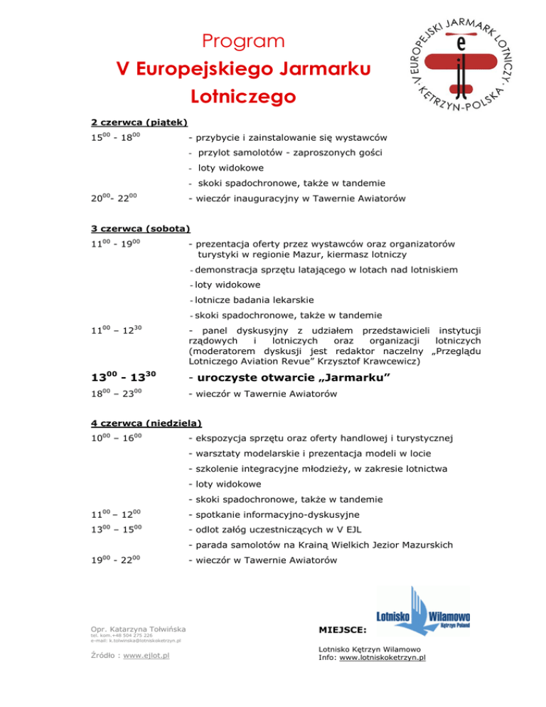 Program V Europejskiego Jarmarku Lotniczego 2 czerwca (piątek) 1500 - 1800 - przybycie i zainstalowanie się wystawców - przylot samolotów - zaproszonych gości - loty widokowe - skoki spadochronowe, takŜe w tandemie 00 20 - 22 00 - wieczór inauguracyjny w Tawernie Awiatorów 3 czerwca (sobota) 1100 - 1900 - prezentacja oferty przez wystawców oraz organizatorów turystyki w regionie Mazur, kiermasz lotniczy - demonstracja sprzętu latającego w lotach nad lotniskiem - loty widokowe - lotnicze badania lekarskie - skoki spadochronowe, takŜe w tandemie 1100 – 1230 - panel dyskusyjny z udziałem przedstawicieli instytucji rządowych i lotniczych oraz organizacji lotniczych (moderatorem dyskusji jest redaktor naczelny „Przeglądu Lotniczego Aviation Revue” Krzysztof Krawcewicz) 1300 - 1330 - uroczyste otwarcie „Jarmarku” 1800 – 2300 - wieczór w Tawernie Awiatorów 4 czerwca (niedziela) 1000 – 1600 - ekspozycja sprzętu oraz oferty handlowej i turystycznej - warsztaty modelarskie i prezentacja modeli w locie - szkolenie integracyjne młodzieŜy, w zakresie lotnictwa - loty widokowe - skoki spadochronowe, takŜe w tandemie 1100 – 1200 13 00 19 00 – 15 00 - spotkanie informacyjno-dyskusyjne - odlot załóg uczestniczących w V EJL - parada samolotów na Krainą Wielkich Jezior Mazurskich - 22 00 Opr. Katarzyna Tołwińska tel. kom.+48 504 275 226 e-mail: [email protected] Źródło : www.ejlot.pl - wieczór w Tawernie Awiatorów MIEJSCE: Lotnisko Kętrzyn Wilamowo Info: www.lotniskoketrzyn.pl