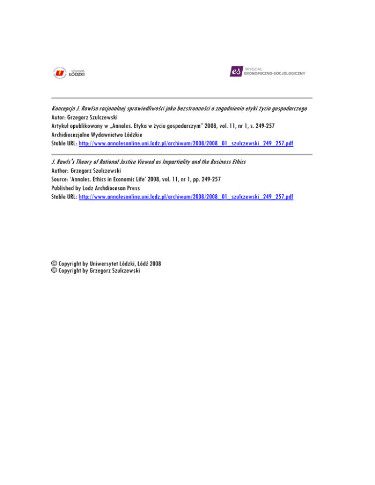 Koncepcja J. Rawlsa racjonalnej sprawiedliwości jako bezstronności a zagadnienia etyki życia gospodarczego Autor: Grzegorz Szulczewski Artykuł opublikowany w „Annales. Etyka w życiu gospodarczym” 2008, vol. 11, nr 1, s. 249-257 Archidiecezjalne Wydawnictwo Łódzkie Stable URL: http://www.annalesonline.uni.lodz.pl/archiwum/2008/2008_01_szulczewski_249_257.pdf J. Rawls's Theory of Rational Justice Viewed as Impartiality and the Business Ethics Author: Grzegorz Szulczewski Source: ‘Annales. Ethics in Economic Life’ 2008, vol. 11, nr 1, pp. 249-257 Published by Lodz Archdiocesan Press Stable URL: http://www.annalesonline.uni.lodz.pl/archiwum/2008/2008_01_szulczewski_249_257.pdf © Copyright by Uniwersytet Łódzki, Łódź 2008 © Copyright by Grzegorz Szulczewski Grzegorz Szulczewski SGH, Warszawa e-mail: [email protected] Koncepcja J. Rawlsa racjonalnej sprawiedliwości jako bezstronności a zagadnienia etyki życia gospodarczego 1. Uwagi wstępne Etyka życia gospodarczego zawsze z zainteresowaniem zwraca się ku współczesnym poglądom i dyskusjom etyków. Czyni to szczególnie, gdy rozważana przez nich problematyka dotyka kwestii sprawiedliwości i wolności ujmowanych w szerokim kontekście społecznym. Najgłośniejsza debata wokół tej kwestii, jaka toczyła się pod koniec XX w., wiąże się z tezami postawionymi w książce Johna Rawlsa pod tytułem „Teoria sprawiedliwości” wydanej w 1971 r. Tezy te żywo dyskutowane w środowisku etyków społecznych (Nozick Robert, Thomas Nagel) zostały uzupełnione rozważaniami zawartymi w jednej z ostatnich prac Rawlsa pod tytułem „Liberalizm polityczny”. Ukazała się ona w 1993 r. Obie książki liczą w sumie około 1400 stron. Rawls sytuuje siebie wśród kontynuatorów tradycji Kantowskiej uprawiania etyki. Jest to zatem etyka racjonalistyczna oparta na co najmniej czterech założeniach: a) tym co określa nasze wybory moralne jest rozum, b) jego posiadanie stanowi o byciu człowiekiem, c) każdy z nas, niezależnie od pozycji, którą zajmuje, pod groźbą wykluczenia ze wspólnoty istot rozumnych musi bezwzględnie zaakceptować wskazania rozumu, d) wolność polega na autonomii czyli narzuceniu sobie własnych praw na zasadzie uznania racjonalnie uzasadnionych nakazów. W ostateczności prowadzi to do sformułowania imperatywów. Ze względu na oparcie się na imperatywach jako głównych podstawach systemowych etyka Kanta stanowiła postać etyki obowiązku. Rawls nie idzie tak daleko. Etyka jaką projektuje Rawls jest etyką formalną i to właśnie zasady sprawiedliwości stanowią swego rodzaju imperatywy kategoryczne. Nie dokonują one wyboru celów, określenia porządku dobra lecz właśnie nie ograniczając naszej wolności, „stosują się one do nas niezależnie od tego jakie są nasze cele”1. To jednak czy będziemy im podlegać zależy od nas. Z drugiej strony Rawls jest głęboko przeświadczony, iż koncepcja modelu „umowy społecznej” i hipotetycznego stanu początkowego może być dobrym punktem do rozważań na temat wolności i sprawiedliwości. W tym sensie sytuuje siebie w długiej tradycji rozważań podejmowanych przez J. Locke’a i J.J Rousseau. Wprowadzenie rozważań o umowie 1 J. Rawls, Teoria sprawiedliwości, PWN, Warszawa 1994, s. 348. 249 społecznej ma przede wszystkim ukazać, iż system liberalny niesie z sobą nową zasadę sprawiedliwości opartą o racjonalne uzasadnienie i ma sugerować, że sam liberalizm może być podstawą do dobrego rozwiązania problemu organizacji życia społecznego. Postarajmy się odnieść punkt widzenia etyki społecznej Rawlsa do interesującej nas perspektywy badawczej a mianowicie zagadnień etyki życia gospodarczego. Zatem to co mówi Rawls o społeczeństwie i założeniach etycznych jakie muszą mu towarzyszyć odnieśmy do organizacji biznesowych. 2. Etyczna waga koncepcji sprawiedliwości Już sam punkt wyjścia rozważań Rawlsa w „Teorii sprawiedliwości” wydaje się być wielce obiecujący dla badań z zakresu etyki życia gospodarczego. Chodzi mianowicie o rozważania o „roli sprawiedliwości w społecznym współdziałaniu”2. Oznacza to, iż dla Rawlsa właściwym problemem społeczeństwa i odpowiednio każdej organizacji jest stworzenie motywacji do podjęcia kooperacji z korzyścią dla wszystkich. Tak jest w rzeczywistości. Każdy kto zakładał firmę stoi dokładnie przed tym problemem. Mianowicie powstanie firmy zatrudniającej pracowników jest możliwe tylko w przypadku, gdy zatrudniane osoby będą przeświadczone, że wypełnianie obowiązków pracowniczych jest bardziej opłacalne niż działanie „na własny rachunek” czy na niekorzyść firmy. Na społeczeństwo i odpowiednio zatem na organizację komercyjną powinniśmy spojrzeć jako na twór ufundowany na wspólnocie wzajemnych interesów, których podstawą stanowi przeświadczenie, iż kooperacja w ramach społeczeństwa i organizacji komercyjnych jest czymś bardziej opłacalnym niż działanie na własną rękę, w tym działanie na szkodę społeczeństwa czy organizacji. Zatem tak jak mechanizmy gospodarcze wyrażone za pomocą praw ekonomicznych prowadzą do koordynacji działań w skali przedsiębiorstwa i w skali społecznej, tak wedle Rawlsa poczucie, iż organizacja i społeczeństwo działa zgodnie z zasadą sprawiedliwości, zapewnia skłonność do kooperacji. W tym sensie Rawls ukazuje etyczne narzędzia rozwiązania problemu zachowań „wolnych strzelców” (Free Rides), jak i zachowań wynikających z paradoksu izolacji. Oba te typy zachowań charakteryzuje brak skłonności do prawdziwej kooperacji, z którą związane są nie tylko korzyści, ale też świadczenia na rzecz wspólnoty. Problem „wolnych strzelców”, zwany też zjawiskiem gapowicza polega na prostej kalkulacji, iż najwyższą premię zdobędzie osoba, która jako jedyna nie będzie przestrzegała obowiązujących zasad, zatem nie będzie dotrzymywała 