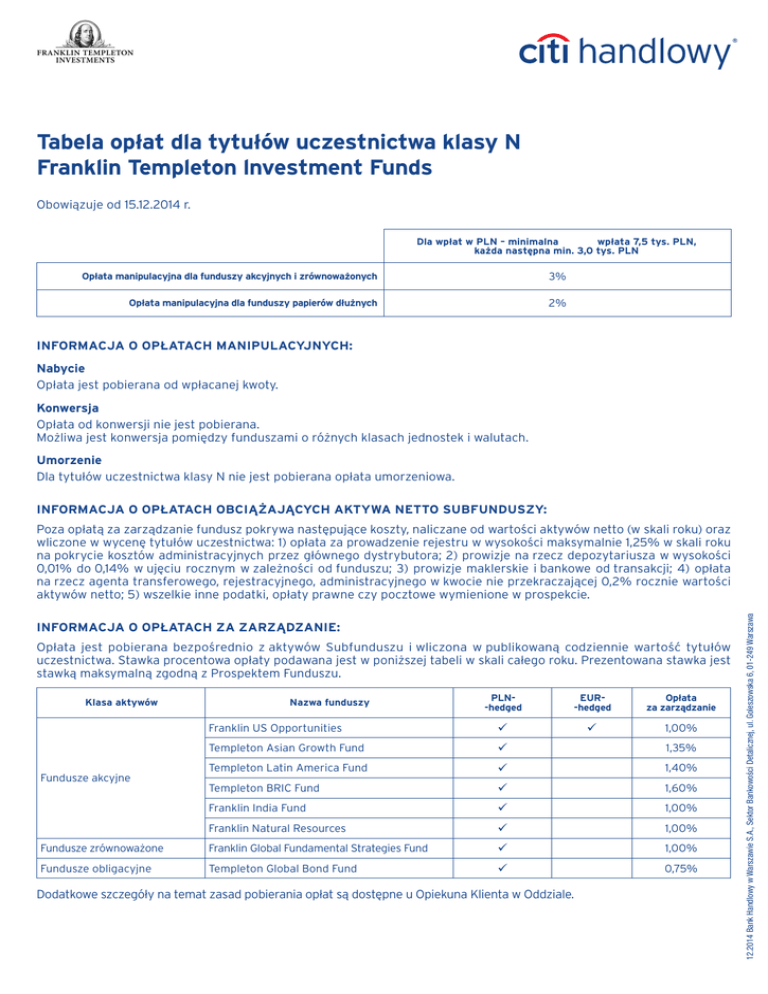 Tabela opłat dla tytułów uczestnictwa klasy N Franklin Templeton lnvestment Funds Obowiązuje od 15.12.2014 r. Dla wpłat w PLN – minimalna wpłata 7,5 tys. PLN, każda następna min. 3,0 tys. PLN Opłata manipulacyjna dla funduszy akcyjnych i zrównoważonych 3% Opłata manipulacyjna dla funduszy papierów dłużnych 2% INFORMACJA O OPŁATACH MANIPULACYJNYCH: Nabycie Opłata jest pobierana od wpłacanej kwoty. Konwersja Opłata od konwersji nie jest pobierana. Możliwa jest konwersja pomiędzy funduszami o różnych klasach jednostek i walutach. Umorzenie Dla tytułów uczestnictwa klasy N nie jest pobierana opłata umorzeniowa. INFORMACJA O OPŁATACH OBCIĄŻAJĄCYCH AKTYWA NETTO SUBFUNDUSZY: INFORMACJA O OPŁATACH ZA ZARZĄDZANIE: Opłata jest pobierana bezpośrednio z aktywów Subfunduszu i wliczona w publikowaną codziennie wartość tytułów uczestnictwa. Stawka procentowa opłaty podawana jest w poniższej tabeli w skali całego roku. Prezentowana stawka jest stawką maksymalną zgodną z Prospektem Funduszu. PLN-hedged EUR-hedged Opłata za zarządzanie Franklin US Opportunities 1,00% Templeton Asian Growth Fund 1,35% Templeton Latin America Fund 1,40% Templeton BRIC Fund 1,60% Franklin India Fund 1,00% Franklin Natural Resources 1,00% Fundusze zrównoważone Franklin Global Fundamental Strategies Fund 1,00% Fundusze obligacyjne Templeton Global Bond Fund 0,75% Klasa aktywów Fundusze akcyjne Nazwa funduszy Dodatkowe szczegóły na temat zasad pobierania opłat są dostępne u Opiekuna Klienta w Oddziale. 12.2014 Bank Handlowy w Warszawie S.A., Sektor Bankowości Detalicznej, ul. Goleszowska 6, 01-249 Warszawa Poza opłatą za zarządzanie fundusz pokrywa następujące koszty, naliczane od wartości aktywów netto (w skali roku) oraz wliczone w wycenę tytułów uczestnictwa: 1) opłata za prowadzenie rejestru w wysokości maksymalnie 1,25% w skali roku na pokrycie kosztów administracyjnych przez głównego dystrybutora; 2) prowizje na rzecz depozytariusza w wysokości 0,01% do 0,14% w ujęciu rocznym w zależności od funduszu; 3) prowizje maklerskie i bankowe od transakcji; 4) opłata na rzecz agenta transferowego, rejestracyjnego, administracyjnego w kwocie nie przekraczającej 0,2% rocznie wartości aktywów netto; 5) wszelkie inne podatki, opłaty prawne czy pocztowe wymienione w prospekcie. Bank otrzymuje od Towarzystw Funduszy Inwestycyjnych oraz Funduszy Zagranicznych wynagrodzenie w wysokości: 100% opłaty manipulacyjnej od każdego zlecenia o charakterze nabycia oraz 43-62% od wysokości opłaty za zarządzanie, przy czym dla większości funduszy stawka mieści się w przedziale 60-62%. Powyższy udział w opłatach pokrywa bieżące koszty i stanowi wynagrodzenie Banku z tytułu świadczenia przez Bank na rzecz Towarzystwa czynności przyjmowania i przekazywania zleceń nabywania i odkupywania tytułów uczestnictwa w funduszach inwestycyjnych oraz innych oświadczeń woli. Dodatkowe szczegóły na temat wynagrodzenia uzyskiwanego przez Bank z tytułu świadczenia na rzecz Towarzystwa czynności przyjmowania i przekazywania zleceń nabywania i odkupywania oraz przekazywania innych oświadczeń woli dotyczących jednostek uczestnictwa są dostępne u Opiekuna Klienta w Oddziale. Opłaty określone w Tabeli Opłat są stosowane przy zbywaniu Jednostek Uczestnictwa zapisywanych na rejestrach otwartych za pośrednictwem Banku Handlowego w Warszawie S.A. Produkty inwestycyjne są dostępne wyłącznie dla posiadaczy Konta Osobistego Citibank. Inwestycje w Fundusze nie są zobowiązaniem oraz nie są gwarantowane przez Bank Handlowy w Warszawie S.A. ani żaden z podmiotów powiązanych lub zależnych. Jednostki uczestnictwa Funduszy nie są depozytem bankowym. Inwestycje w Fundusze są obarczone ryzykiem inwestycyjnym, włącznie z możliwością utraty kapitału. Dotychczasowe wyniki funduszy nie stanowią gwarancji ich przyszłych zysków. Inwestycje w jednostki oraz tytuły uczestnictwa nie są gwarantowane przez Skarb Państwa, Bankowy Fundusz Gwarancyjny lub jakiekolwiek inne instytucje rządowe. Szczegółowe informacje o Funduszu są dostępne w prospekcie Informacyjnym Funduszu dostępnym w oddziale Banku. Przed podjęciem decyzji o zainwestowaniu w Fundusz należy zapoznać się z Prospektem Informacyjnym Funduszu, zawierającym w szczególności informacje o czynnikach wpływających na rentowność inwestycji, w tym czynnikach ryzyka. Zasady realizacji zleceń określone są w Prospekcie Funduszu. Prospekty Informacyjne Funduszy dostępne są w oddziałach Banku oraz na stronie www.online.citibank.pl Imię i nazwisko Klienta …………………………………………………………………………………………......…………………… PESEL …………………………………………………………………… GRB …………………………………………………………………… 12.2014 Bank Handlowy w Warszawie S.A., Sektor Bankowości Detalicznej, ul. Goleszowska 6, 01-249 Warszawa Data…………………………………………………………………… Podpis Klienta………………………………………………………………………………………………………………………………………… (SV)……………………………………………………………………