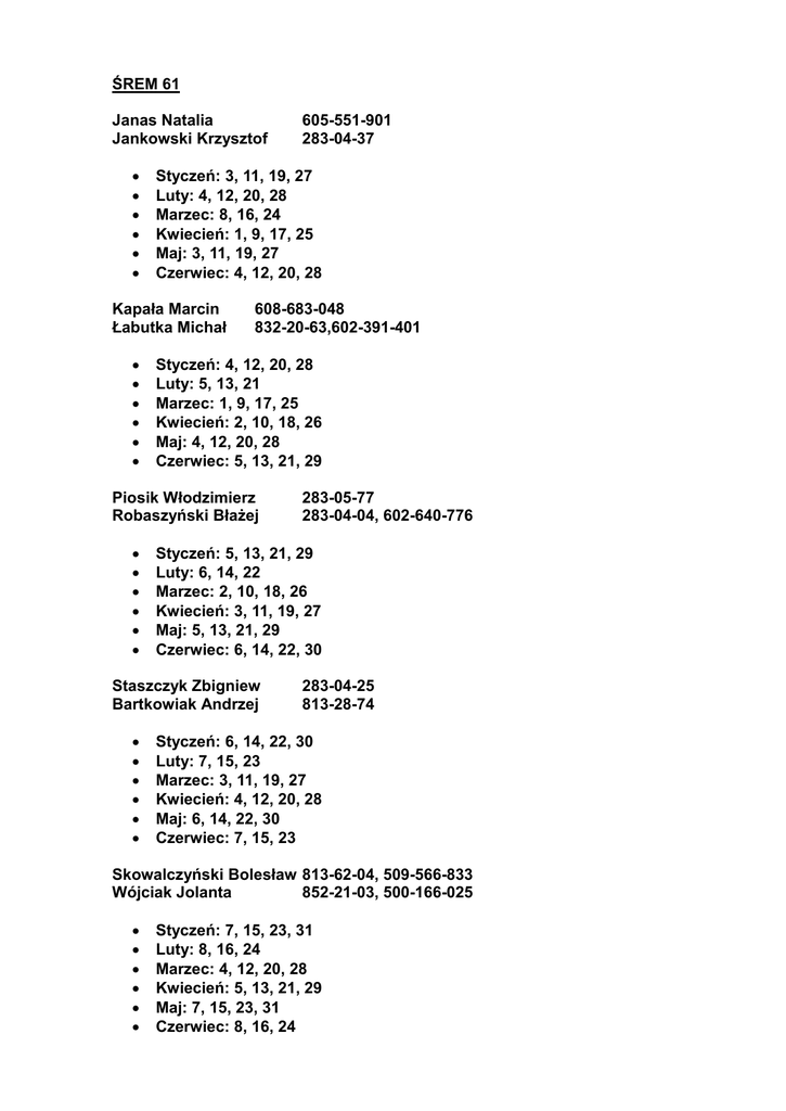 ŚREM 61 Janas Natalia Jankowski Krzysztof Styczeń: 3, 11, 19, 27 Luty: 4, 12, 20, 28 Marzec: 8, 16, 24 Kwiecień: 1, 9, 17, 25 Maj: 3, 11, 19, 27 Czerwiec: 4, 12, 20, 28 Kapała Marcin Łabutka Michał 608-683-048 832-20-63,602-391-401 Styczeń: 4, 12, 20, 28 Luty: 5, 13, 21 Marzec: 1, 9, 17, 25 Kwiecień: 2, 10, 18, 26 Maj: 4, 12, 20, 28 Czerwiec: 5, 13, 21, 29 Piosik Włodzimierz Robaszyński Błażej 283-05-77 283-04-04, 602-640-776 Styczeń: 5, 13, 21, 29 Luty: 6, 14, 22 Marzec: 2, 10, 18, 26 Kwiecień: 3, 11, 19, 27 Maj: 5, 13, 21, 29 Czerwiec: 6, 14, 22, 30 Staszczyk Zbigniew Bartkowiak Andrzej 605-551-901 283-04-37 283-04-25 813-28-74 Styczeń: 6, 14, 22, 30 Luty: 7, 15, 23 Marzec: 3, 11, 19, 27 Kwiecień: 4, 12, 20, 28 Maj: 6, 14, 22, 30 Czerwiec: 7, 15, 23 Skowalczyński Bolesław 813-62-04, 509-566-833 Wójciak Jolanta 852-21-03, 500-166-025 Styczeń: 7, 15, 23, 31 Luty: 8, 16, 24 Marzec: 4, 12, 20, 28 Kwiecień: 5, 13, 21, 29 Maj: 7, 15, 23, 31 Czerwiec: 8, 16, 24 Lisewska-Krzyżanowska Marta 507-148-873 Karcz Piotr 283-07-67, 502-050-085 Styczeń: 8, 16, 24 Luty: 1, 9, 17, 25 Marzec: 5, 13, 21, 29 Kwiecień: 6, 14, 22, 30 Maj: 8, 16, 24 Czerwiec: 1, 9, 17, 25 Genderka Witold Piasecki Maciej 607-123-749 660-466-184 Styczeń: 1, 9, 17, 25 Luty: 2, 10, 18, 26 Marzec: 6, 14, 22, 30 Kwiecień: 7, 15, 23 Maj: 1, 9, 17, 25 Czerwiec: 2, 10, 18, 26 Potocka Marta 530-707-636 Rozmiarek Ewa 516-225-733 Biernacki Łukasz 696-214-081 Styczeń: 2, 10, 18, 26 Luty: 3, 11, 19, 27 Marzec: 7, 15, 23, 31 Kwiecień: 8, 16, 24 Maj: 2, 10, 18, 26 Czerwiec: 3, 11, 19, 27