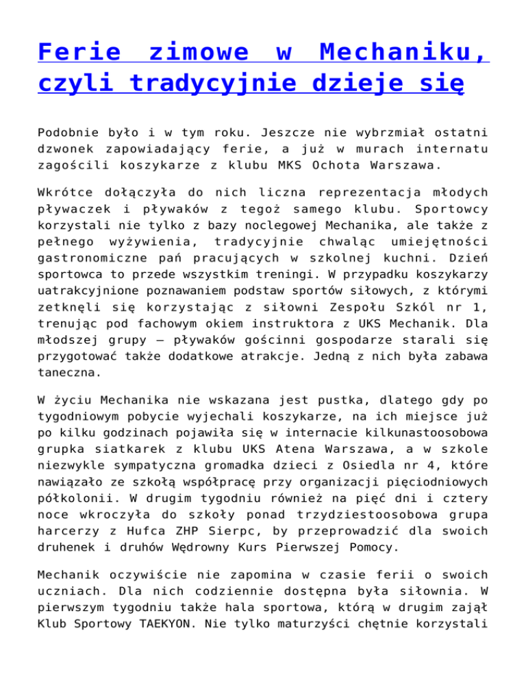 Ferie zimowe w Mechaniku, czyli tradycyjnie dzieje się Podobnie było i w tym roku. Jeszcze nie wybrzmiał ostatni dzwonek zapowiadający ferie, a już w murach internatu zagościli koszykarze z klubu MKS Ochota Warszawa. Wkrótce dołączyła do nich liczna reprezentacja młodych pływaczek i pływaków z tegoż samego klubu. Sportowcy korzystali nie tylko z bazy noclegowej Mechanika, ale także z pełnego wyżywienia, tradycyjnie chwaląc umiejętności gastronomiczne pań pracujących w szkolnej kuchni. Dzień sportowca to przede wszystkim treningi. W przypadku koszykarzy uatrakcyjnione poznawaniem podstaw sportów siłowych, z którymi zetknęli się korzystając z siłowni Zespołu Szkól nr 1, trenując pod fachowym okiem instruktora z UKS Mechanik. Dla młodszej grupy – pływaków gościnni gospodarze starali się przygotować także dodatkowe atrakcje. Jedną z nich była zabawa taneczna. W życiu Mechanika nie wskazana jest pustka, dlatego gdy po tygodniowym pobycie wyjechali koszykarze, na ich miejsce już po kilku godzinach pojawiła się w internacie kilkunastoosobowa grupka siatkarek z klubu UKS Atena Warszawa, a w szkole niezwykle sympatyczna gromadka dzieci z Osiedla nr 4, które nawiązało ze szkołą współpracę przy organizacji pięciodniowych półkolonii. W drugim tygodniu również na pięć dni i cztery noce wkroczyła do szkoły ponad trzydziestoosobowa grupa harcerzy z Hufca ZHP Sierpc, by przeprowadzić dla swoich druhenek i druhów Wędrowny Kurs Pierwszej Pomocy. Mechanik oczywiście nie zapomina w czasie ferii o swoich uczniach. Dla nich codziennie dostępna była siłownia. W pierwszym tygodniu także hala sportowa, którą w drugim zajął Klub Sportowy TAEKYON. Nie tylko maturzyści chętnie korzystali z zaproponowanych im licznych dodatkowych zajęć przedmiotowych. Klasy liceum dziennikarskiego zdobywały teoretyczne i praktyczne umiejętności operatorskie pod okiem panów Mariusza Kamińskiego i Jacka Dejmeckiego z TV Sierpc. Policyjny narybek z klasy pierwszej nie przestraszył się chłodu i wesoło bawił podczas zajęć sprawnościowych w Antoniewie. W czasie ferii można było także nauczyć się podstaw tanga argentyńskiego czy tkactwa, które przybliżyła wycieczka do Ratusza. Wśród tylu atrakcji dwa tygodnie zimowej przerwy upłynęły bardzo szybko. Mechanik nie zamknął się przed młodzieżą choć na jeden dzień. W ostatni piątkowy dzień nauki przyjechali koszykarze, w ostatnie niedzielne popołudnie „odpoczynku” drzwi szkoły zamknęli harcerze. I bardzo dobrze, bo przecież szkoła powinna być dla młodzieży, uczniów, a nie, jak to czasami bywa, odwrotnie. ACH – Zespół Szkół nr1 w Sierpcu