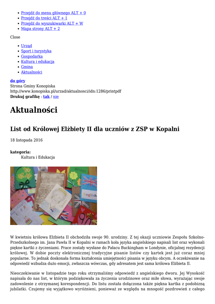 Przejdź do menu głównego ALT + 0 Przejdź do treści ALT + 1 Przejdź do wyszukiwarki ALT + W Mapa strony ALT + 2 Close Urząd Sport i turystyka Gospodarka Kultura i edukacja Gmina Aktualności do góry Strona Gminy Konopiska http://www.konopiska.pl/urzad/aktualnosci/idn:1286/printpdf Drukuj grafikę : tak / nie Aktualności List od Królowej Elżbiety II dla uczniów z ZSP w Kopalni 18 listopada 2016 kategoria: Kultura i Edukacja W kwietniu królowa Elżbieta II obchodziła swoje 90. urodziny. Z tej okazji uczniowie Zespołu SzkolnoPrzedszkolnego im. Jana Pawła II w Kopalni w ramach koła języka angielskiego napisali list oraz wykonali piękne kartki z życzeniami. Prace zostały wysłane do Pałacu Buckingham w Londynie, oficjalnej rezydencji królowej. W dobie poczty elektronicznej tradycyjne pisanie listów czy kartek jest już coraz mniej popularne. To jednak doskonała forma kształcenia umiejętności pisania w języku obcym. A oczekiwanie na odpowiedź wzbudza dużo emocji, zwłaszcza wówczas, gdy adresatem jest sama królowa Elżbieta II. Nieoczekiwanie w listopadzie tego roku otrzymaliśmy odpowiedź z angielskiego dworu. Jej Wysokość napisała do nas list, w którym podziękowała za życzenia urodzinowe oraz miłe słowa, wyrażając swoje zadowolenie z otrzymanej korespondencji. Do listu została dołączona także piękna kartka z podobizną jubilatki. Czujemy się wyjątkowo wyróżnieni, ponieważ ze względu na mnogość pozdrowień z całego świata, które otrzymuje królowa Elżbieta II, nie każdy może liczyć na odpowiedź. Nas jednak spotkał ten zaszczyt. Katarzyna Stadler powrót do listy aktualności