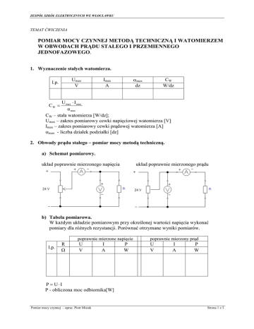 pomiar mocy czynnej metodą techniczną i watomierzem w